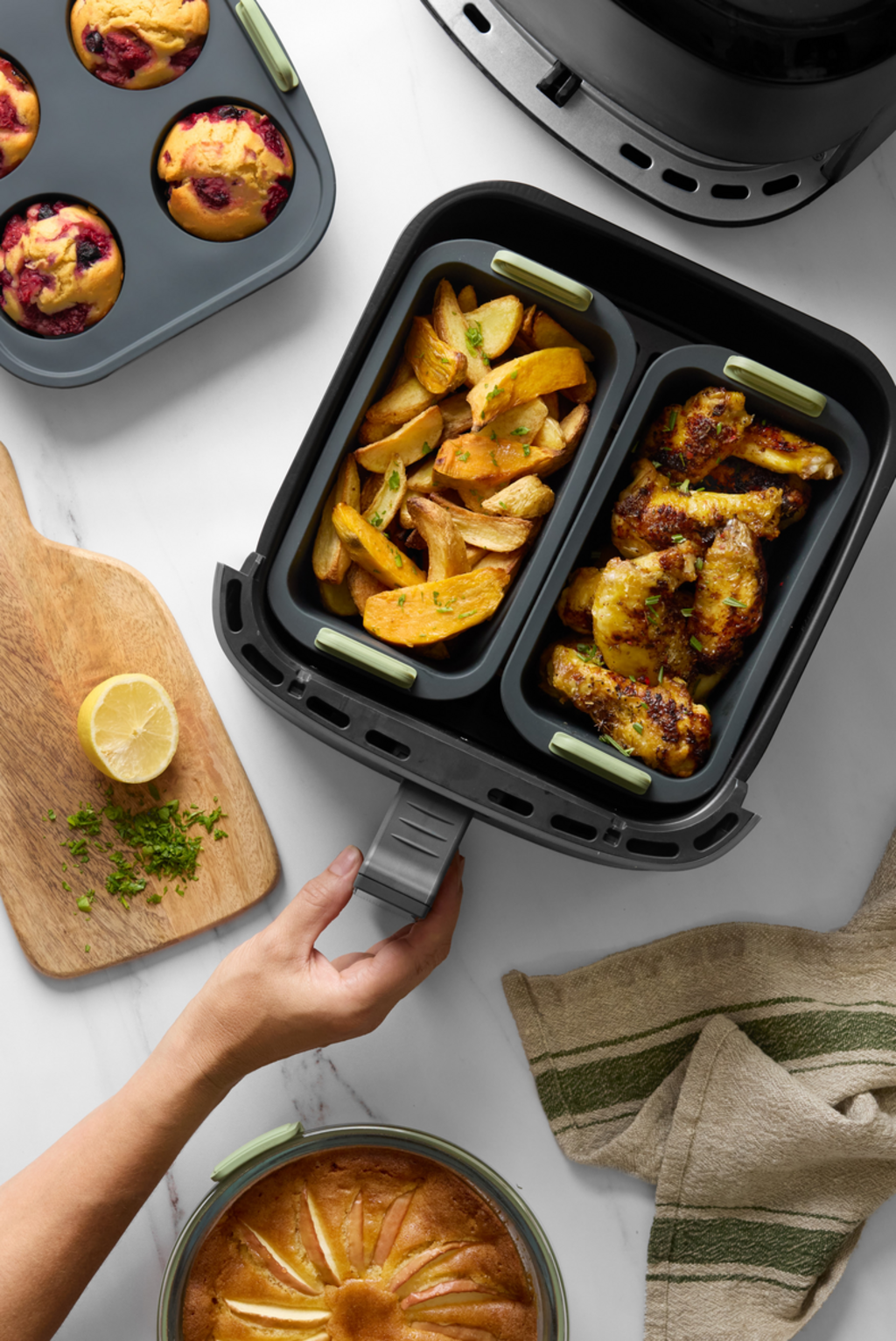 Przygotowywanie pysznych posiłków nigdy nie było tak proste! Dzięki sprytnym silikonowym koszykom do frytkownicy powietrznej wszystko jest jeszcze łatwiejsze, bez dużego wysiłku związanego z czyszczeniem. Wystarczy włożyć je do zmywarki po gotowaniu i gotowe.