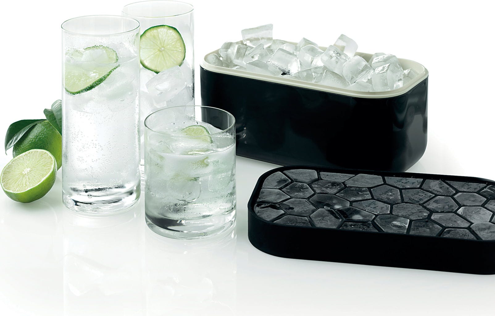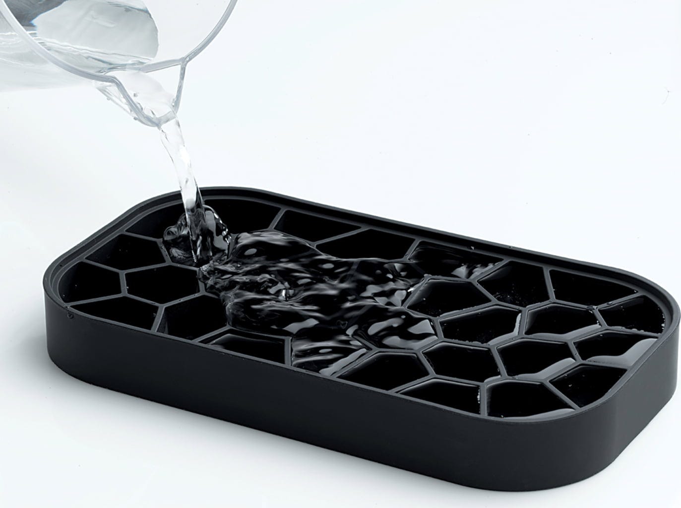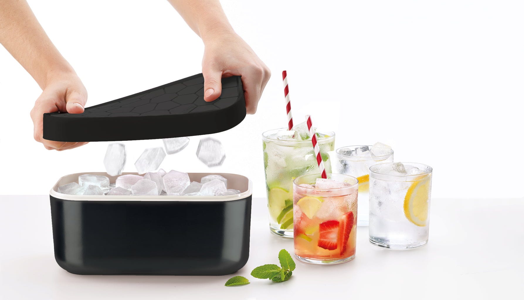 Sam pojemnik jest wykonany z wytrzymałego tworzywa ABS i spoczywa na praktycznie podniesionej podstawie. Ta konstrukcja pomaga dłużej utrzymać chłód w środku, a także skutecznie zapobiega tworzeniu się nieestetycznych skroplin. Elastyczna pokrywa wykonana z wytrzymałego silikonu nie tylko bezpiecznie zamyka pojemnik i utrzymuje świeżość kostek lodu, ale także służy jako praktyczna foremka do kostek lodu!