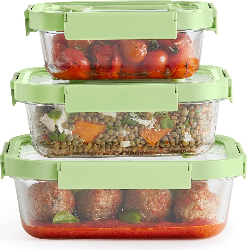 Te wszechstronne pojemniki do przechowywania, które można ustawiać jeden na drugim, są idealnymi pomocnikami w przechowywaniu żywności, planowaniu posiłków i przeciwdziałaniu marnowaniu żywności. Zestaw składa się z trzech praktycznych rozmiarów (1520 ml, 1050 ml i 640 ml), dzięki czemu masz odpowiedni pojemnik na każdą ilość. Wykonane z wytrzymałego szkła borokrzemowego pojemniki do przechowywania są nie tylko wyjątkowo trwałe, ale także absolutnie neutralne dla smaku i utrzymują świeżość żywności.