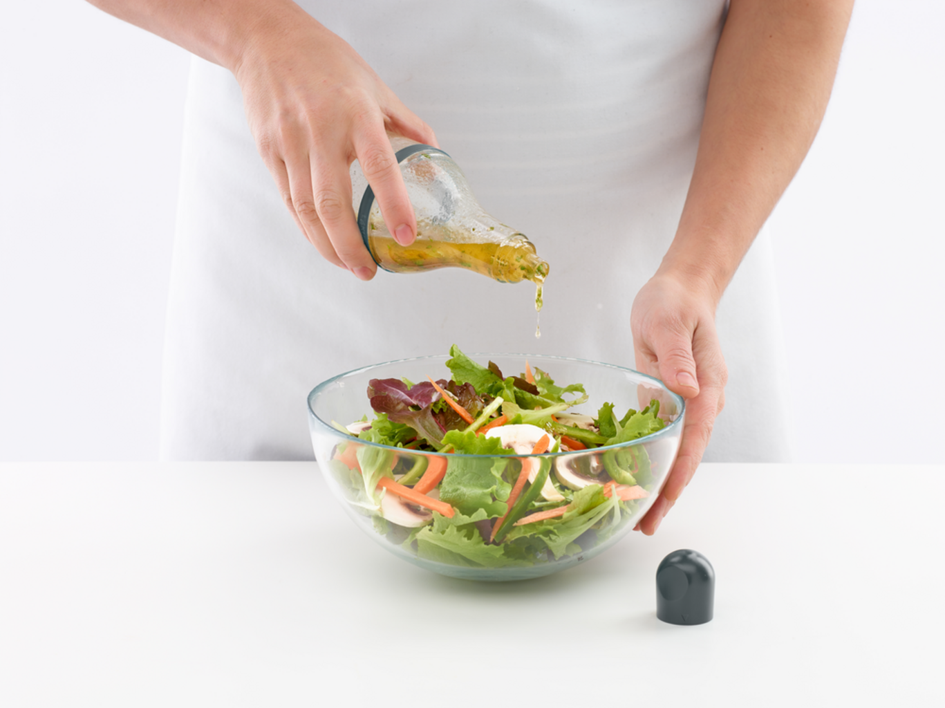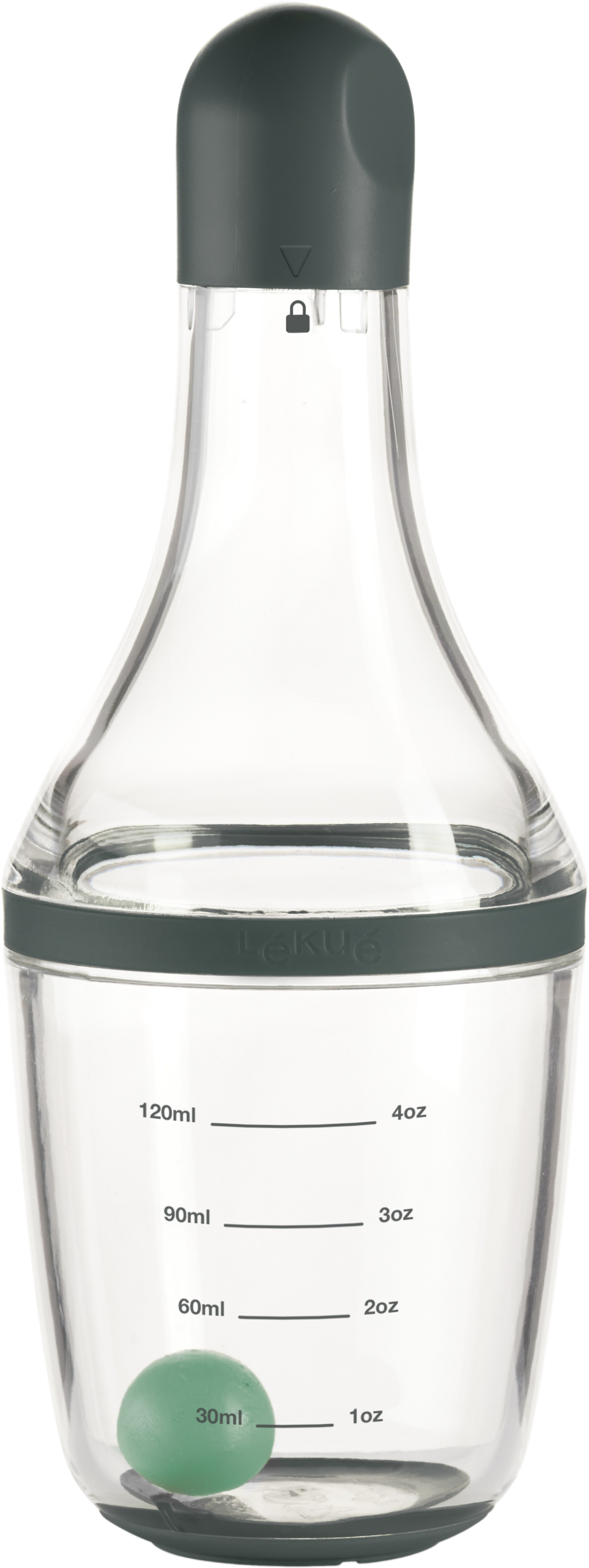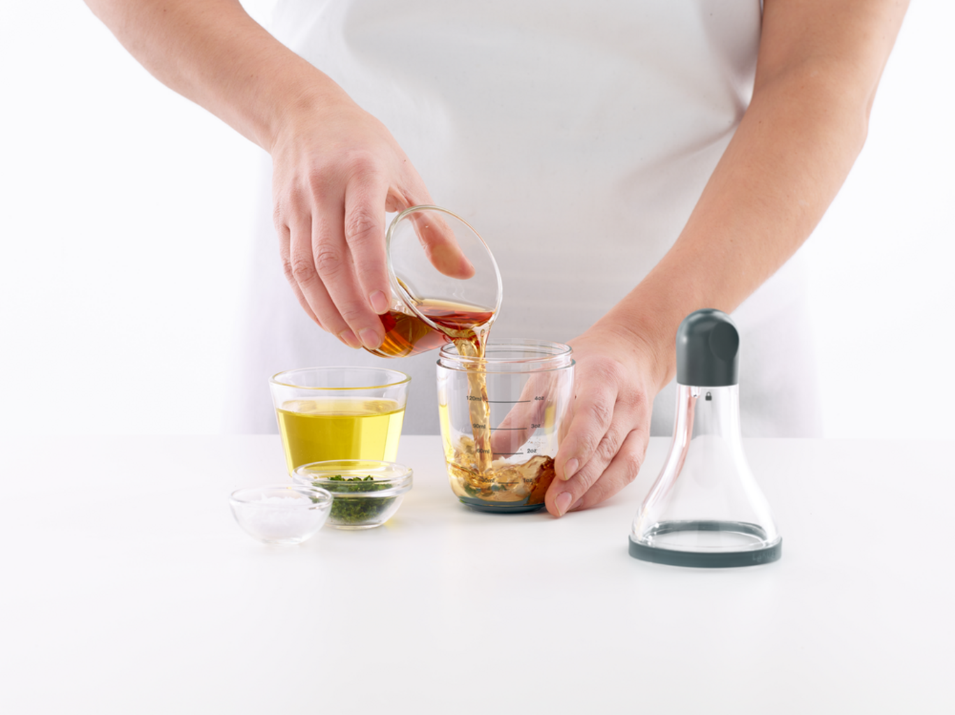 Dzięki dużemu otworowi można go łatwo napełnić świeżymi składnikami, a zintegrowane miarki pomagają odmierzyć wszystko dokładnie według własnego gustu. Następnie wystarczy zamknąć go za pomocą bezpiecznej platynowej silikonowej pokrywy, która niezawodnie zapobiega wyciekom podczas energicznego wstrząsania. Praktyczna kulka wewnątrz zapewnia, że wszystkie składniki - od oleju i octu po zioła i przyprawy - doskonale się łączą, tworząc kremowy, jednorodny dressing i są idealnie wymieszane.
