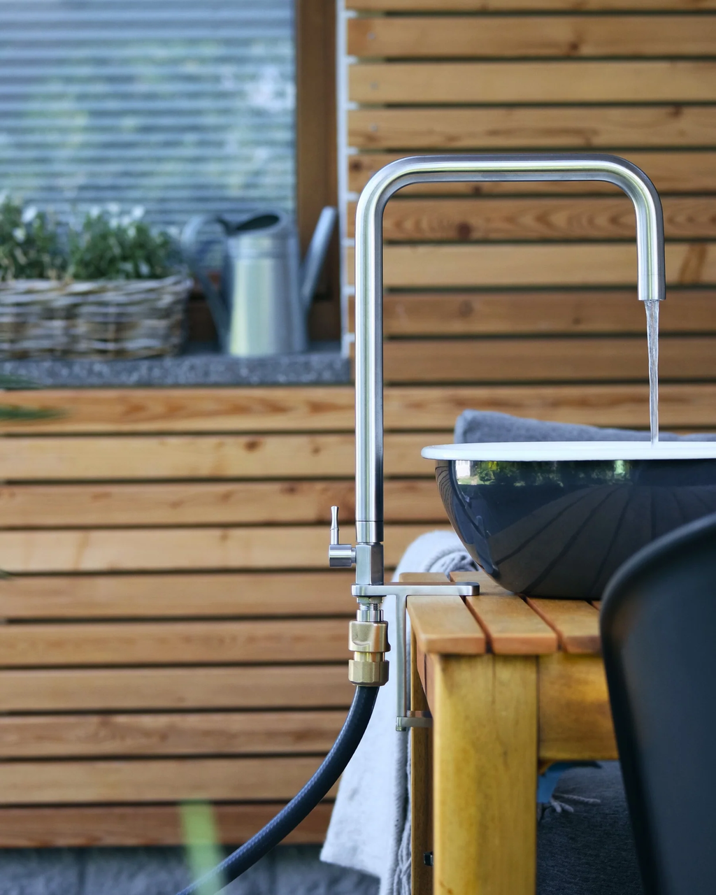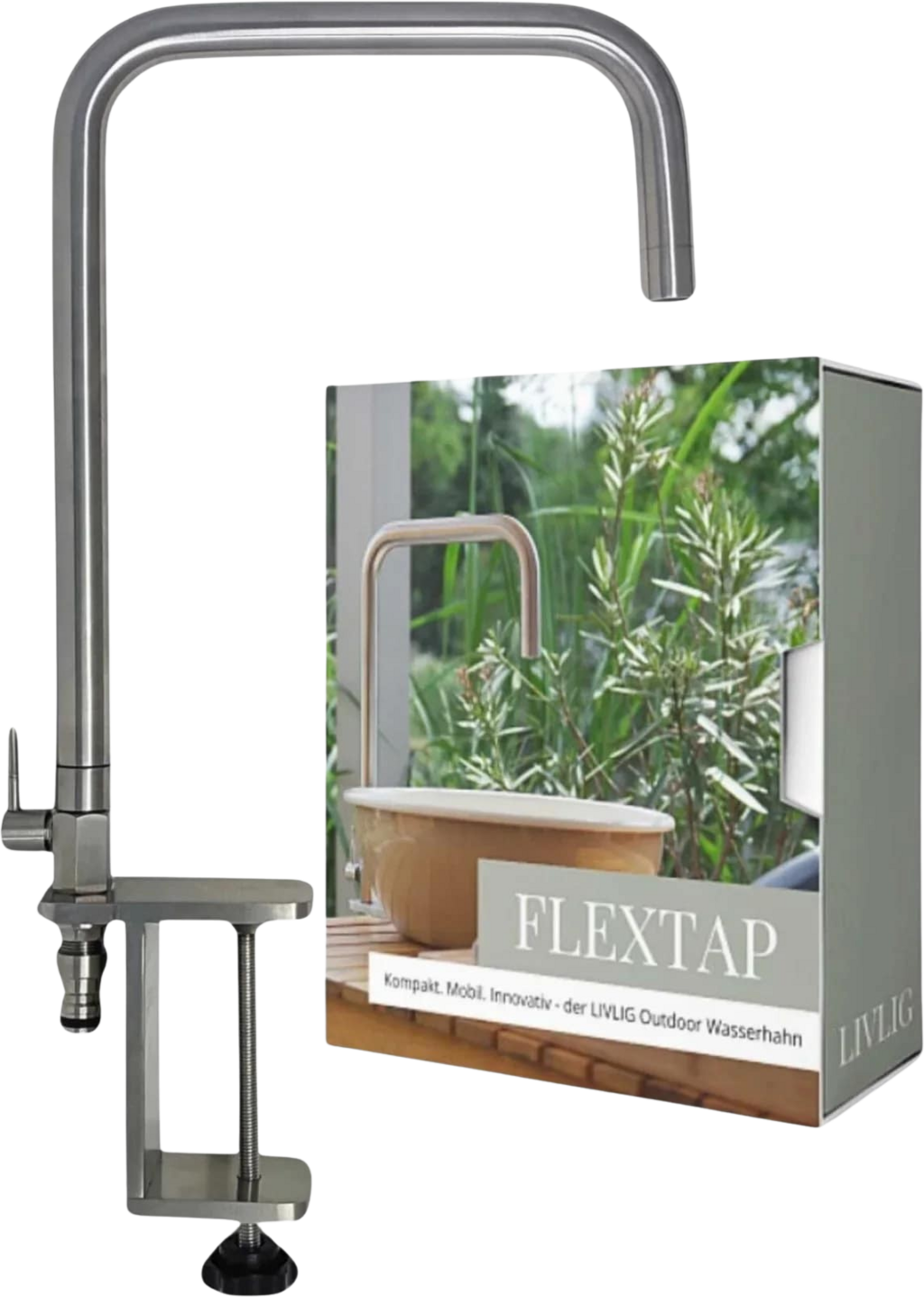 Flextap jest wykonany z wytrzymałej, szczotkowanej stali nierdzewnej i jest odporny na wiatr i warunki atmosferyczne. Można go podłączyć do dowolnego standardowego węża ogrodowego z przyłączem 1/2 cala w mgnieniu oka - instalacja może być tak prosta! Najlepsza rzecz? Kran można obracać o 360° i ustawić dokładnie tam, gdzie jest potrzebny, dzięki praktycznemu mocowaniu do stołu.