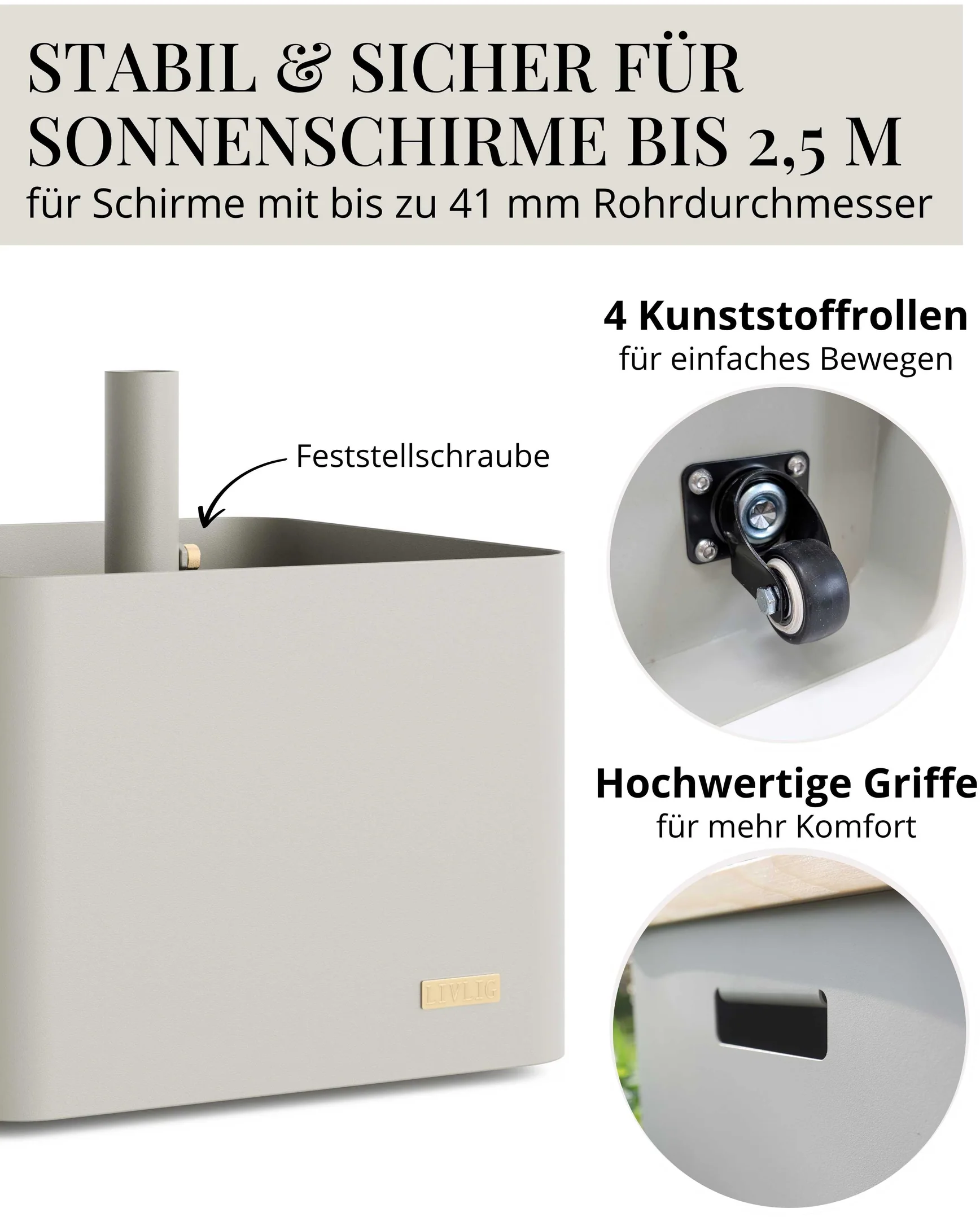 Idealne i oszczędzające miejsce rozwiązanie 3 w 1 na balkony i tarasy! Stojak na parasol z kółkami nie tylko zapewnia stabilne wsparcie dla parasola, ale może być również wypełniony dekoracyjnie lub obsadzony roślinami - dla jeszcze większej wagi i stabilności. Może być również używany jako stolik boczny.
