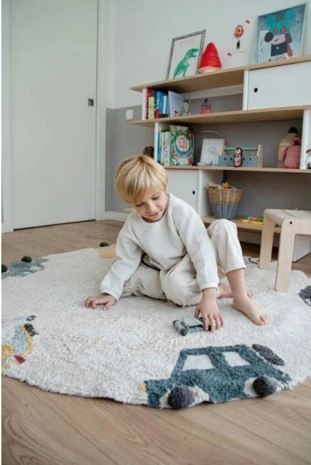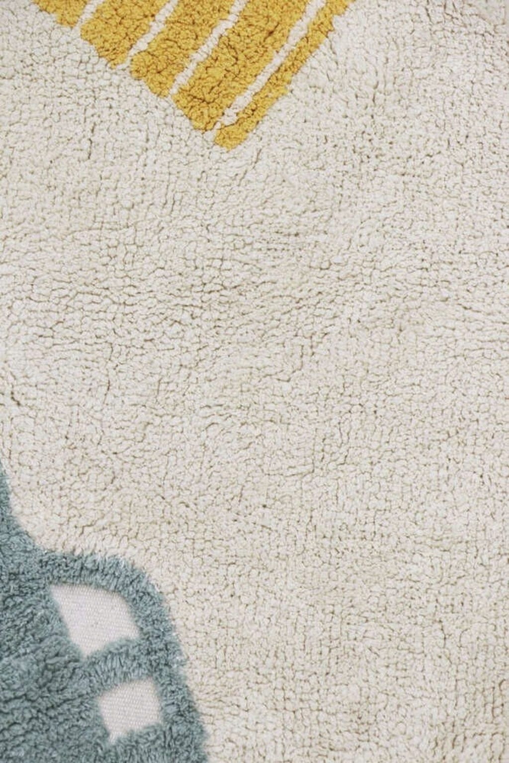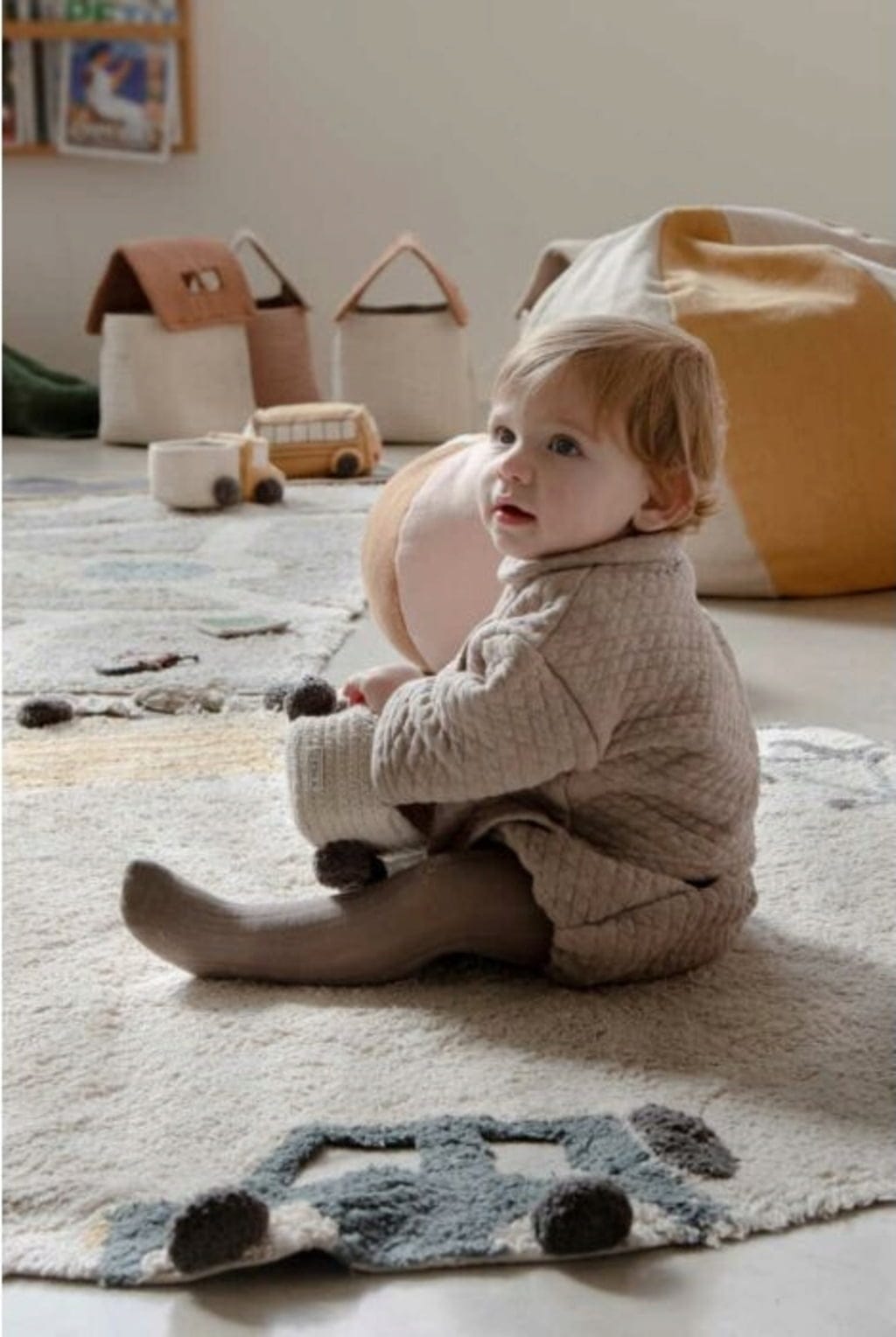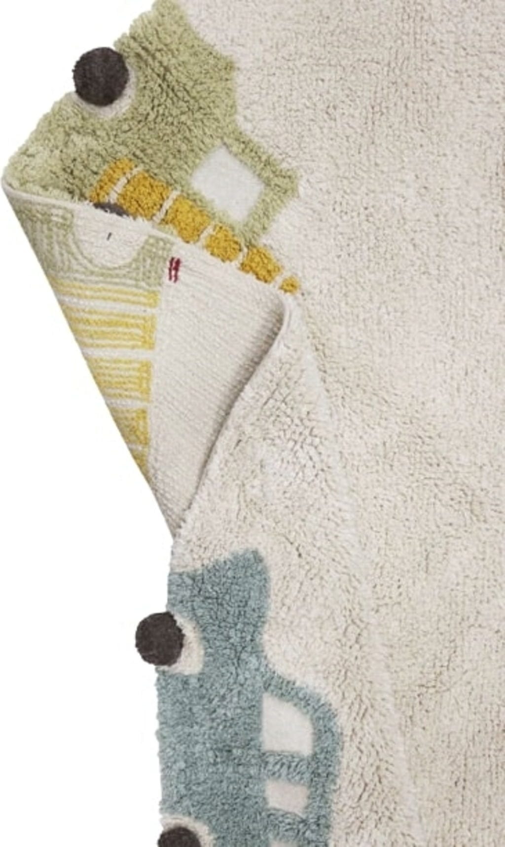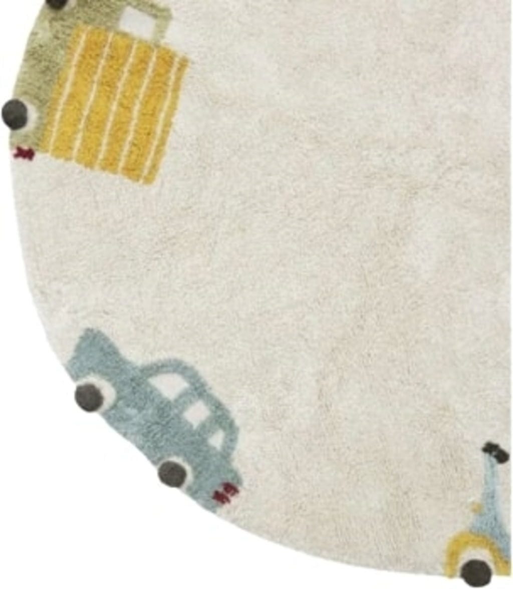 Ozdobiony różnymi pojazdami, takimi jak samochód, ciężarówka i Vespa, których koła wykonane są z ciemnoszarych bawełnianych pomponów, dywan zachęca do zabawy i spędzania na nim czasu!