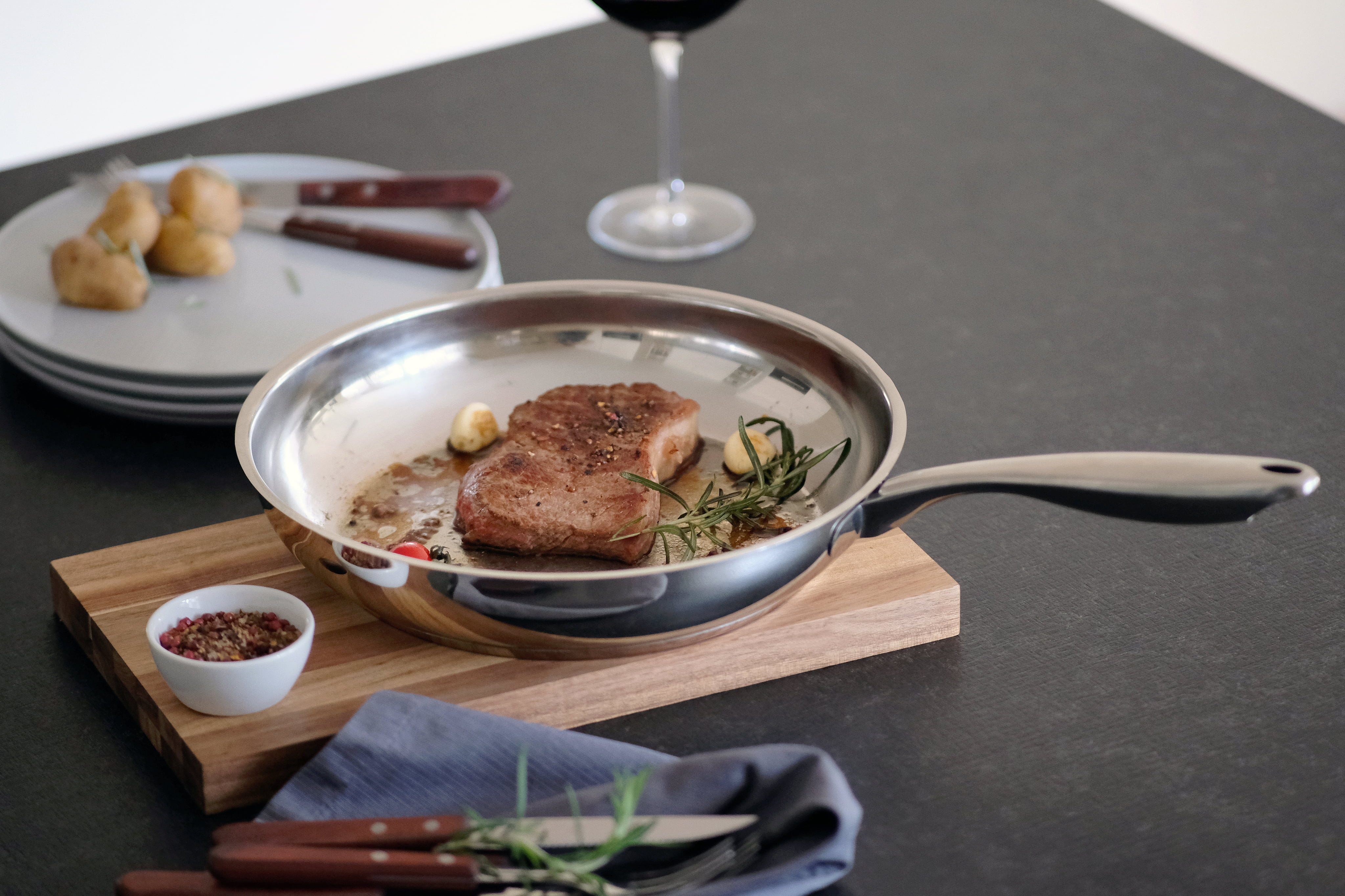 Ergonomiczny uchwyt z nienagrzewającego się metalu umożliwia bezpieczną obsługę bez konieczności używania łapek kuchennych, podczas gdy solidna konstrukcja patelni sprawia, że nadaje się ona zarówno do użytku w piekarniku, jak i na kuchenkach indukcyjnych. Czy to do chrupiących steków, czy wykwintnych baz do sosów – ta trwała patelnia ze stali nierdzewnej łączy profesjonalne wymagania z łatwością pielęgnacji na co dzień; można ją myć w zmywarce, choć producent zaleca czyszczenie ręczne.