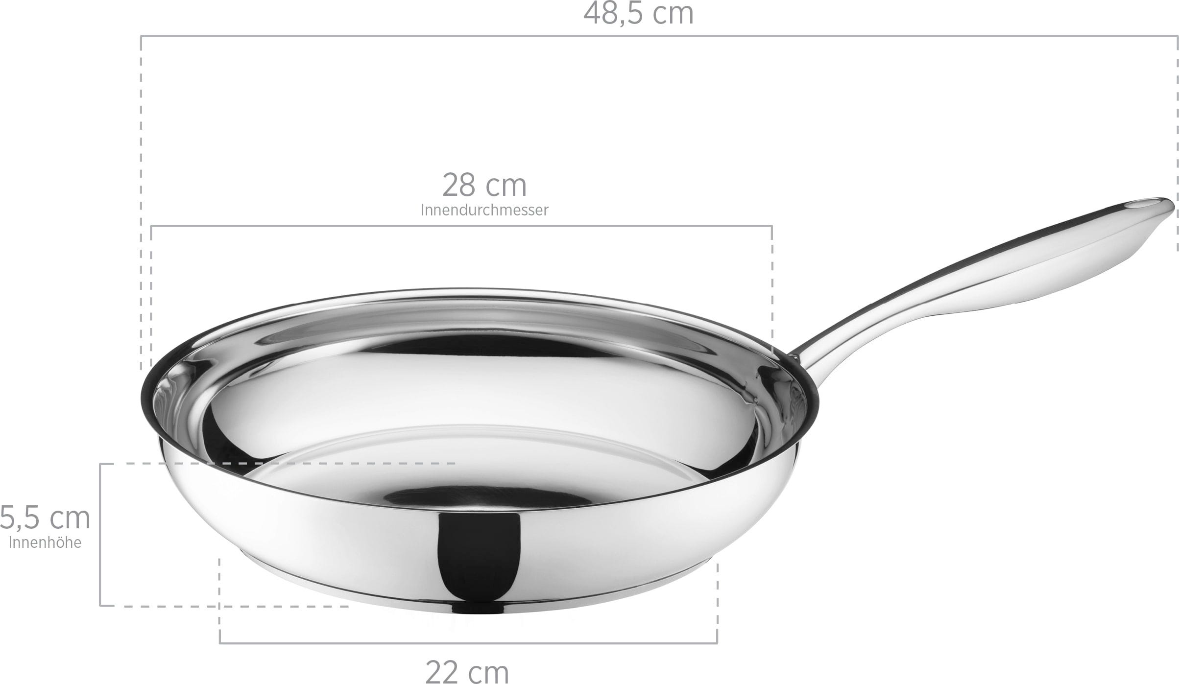 Osiągaj perfekcyjne rezultaty smażenia dzięki patelni o średnicy 28 cm z serii Tavos marki Mäser, która zachwyca wysoką jakością wykonania z niepowlekanej stali chromowo-niklowej. Ta profesjonalna patelnia wolna od PTFE jest idealna do intensywnego podsmażania, flambirowania czy karmelizowania, a dzięki kapslowemu dnu typu „sandwich” oferuje doskonałe magazynowanie ciepła i energooszczędność.