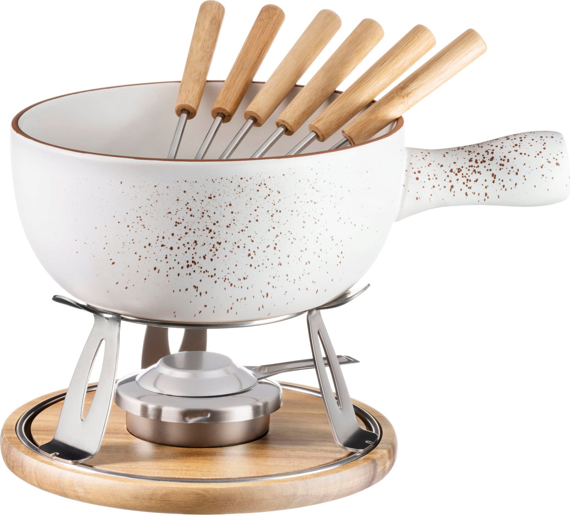 Oferuje wszystko, co potrzebne do pełnego doznań spotkania w miłym gronie i umożliwia całkowicie bezprzewodową pracę przy użyciu pasty do paliwa, dzięki czemu żadne przeszkadzające kable nie zakłócają wspólnej degustacji przy stole. Składający się z garnka do fondue (caquelon), stabilnego podgrzewacza (rechaud), ochronnej podstawki, regulowanego palnika na pastę oraz sześciu widelczyków do fondue, ten wykonany z wysokiej jakości kamionki zestaw łączy nowoczesne, okrągłe formy z rustykalną przytulnością!