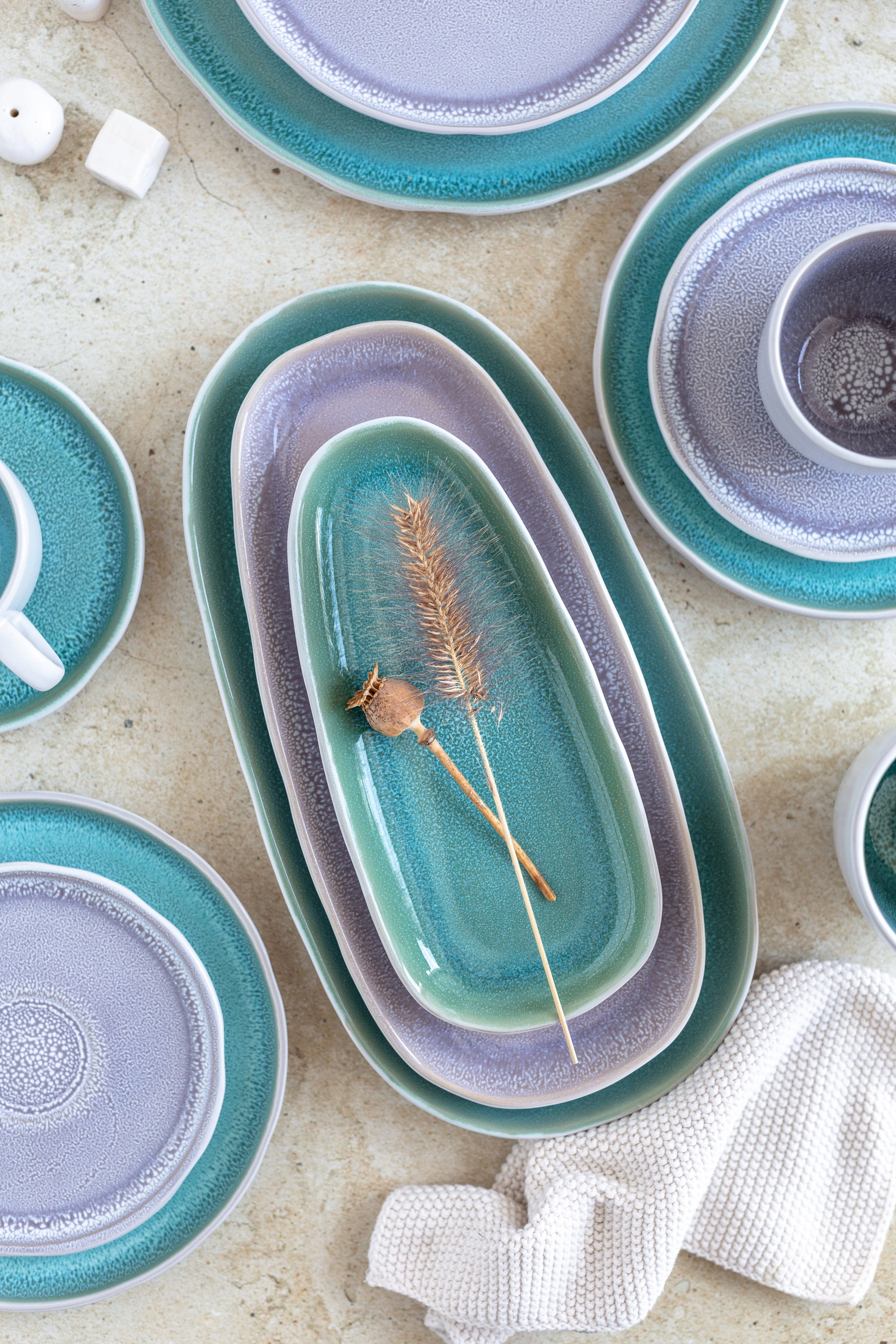 Nadaj swojej jadalni harmonijny i nowoczesny charakter dzięki temu 16-częściowemu serwisowi obiadowemu z serii Elea, który zachwyca wyjątkowym stylem vintage. Każdy element wykonany z wysokiej jakości kamionki jest prawdziwym unikatem: podczas gdy zewnętrzna strona utrzymana jest w czystej bieli o strukturze młotkowanej, wnętrze zaskakuje żywym, fioletowym szkliwem reaktywnym, które zapewnia uroczy wygląd handmade.