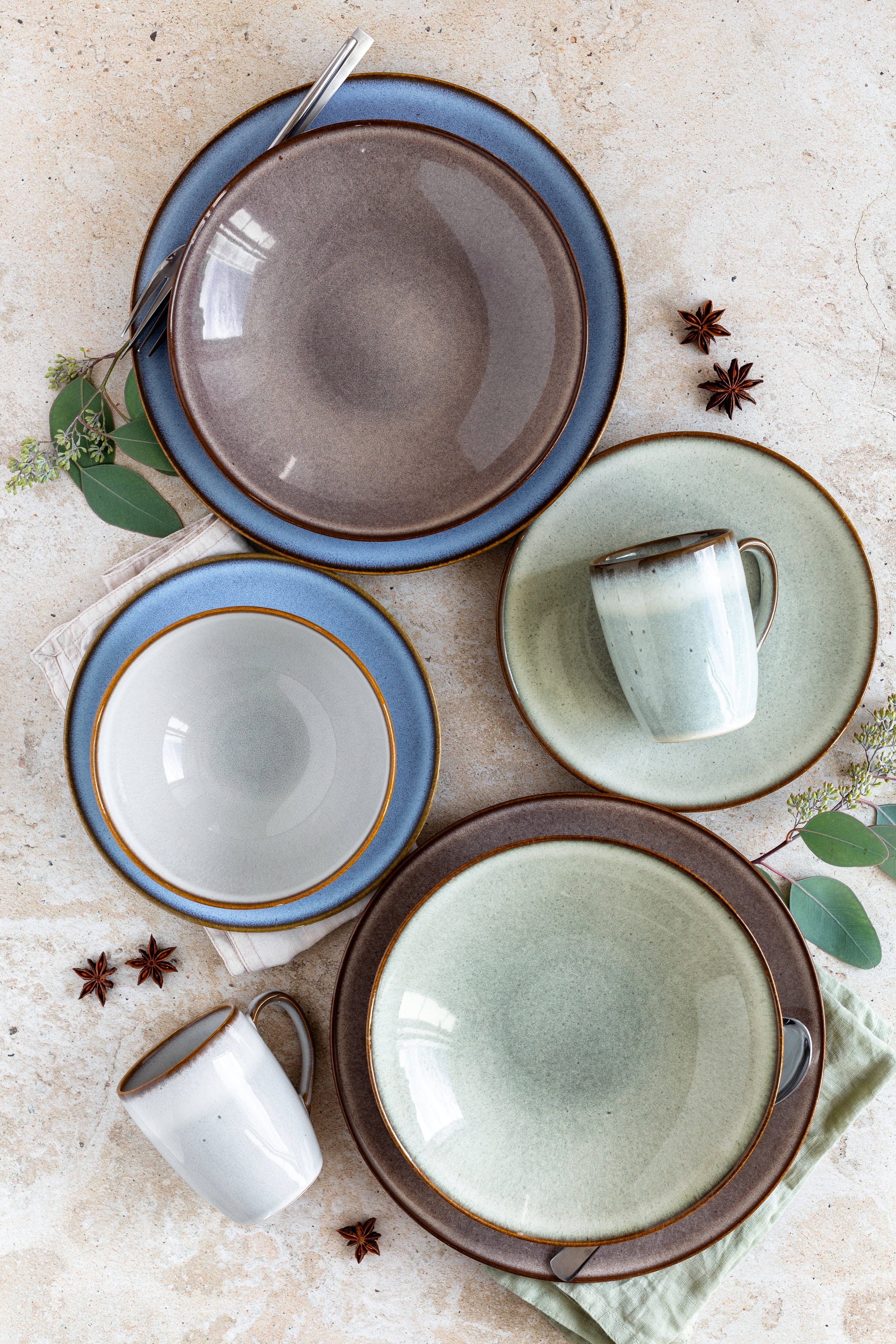 Wprowadź do swojego domu relaksujący styl Scandi dzięki temu ośmioczęściowemu serwisowi obiadowemu i ciesz się wyjątkowym połączeniem naturalnego ciepła z nowoczesną elegancją. Wykonany z wysokiej jakości kamionki, każdy element zachwyca specjalnym szkliwieniem reaktywnemu, które tworzy indywidualne przejścia kolorystyczne i wzbogaca Twój nakryty stół o prawdziwe unikaty.