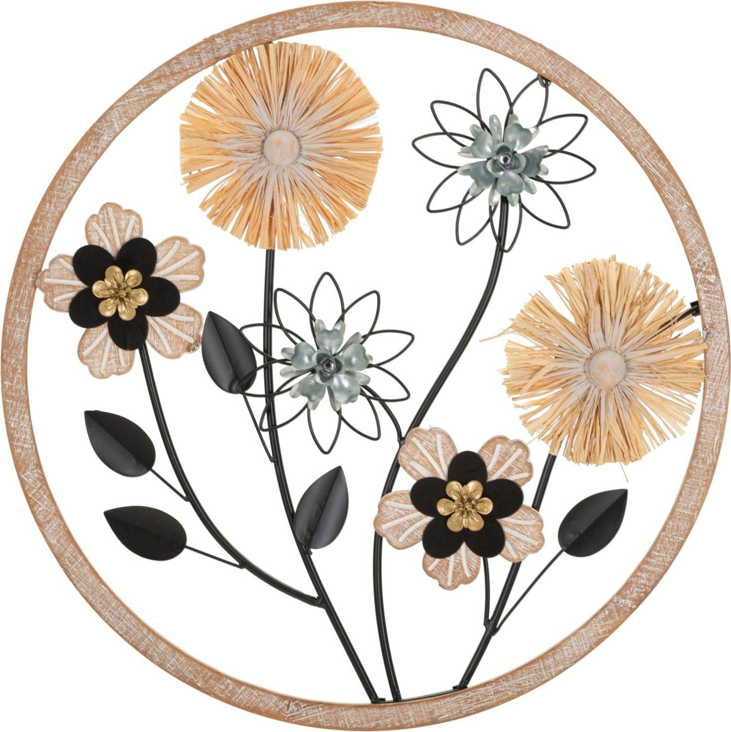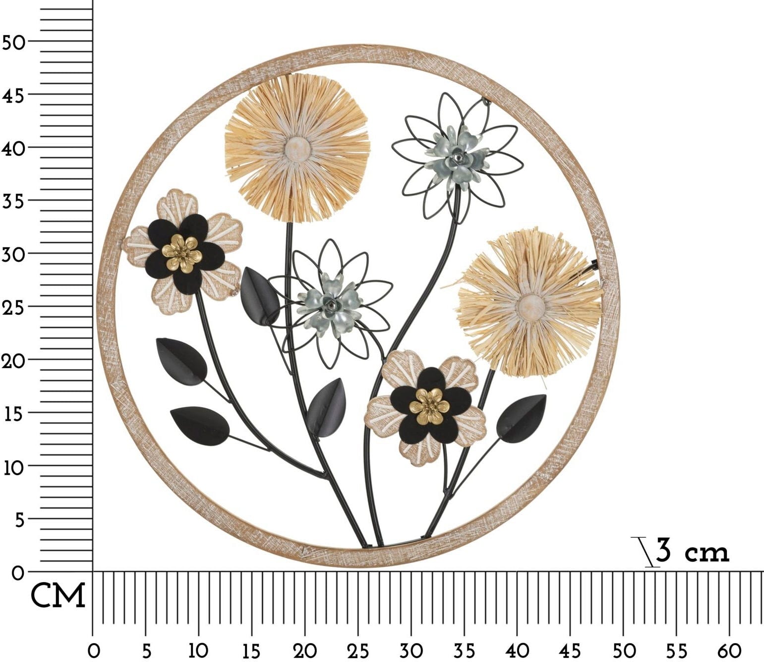 Dzięki okrągłej dekoracji ściennej Kwiat marki Mauro Ferretti wprowadzisz wieczną łąkę pełną uroku i lekkości bezpośrednio do swojego salonu. Ten artystyczny panel 3D łączy w sobie naturalność rustykalnej drewnianej ramy z subtelną elegancją kunsztownie wykonanych metalowych kwiatów, które lśnią w harmonijnym zestawieniu czerni, złota i naturalnej słomy.