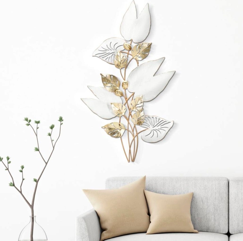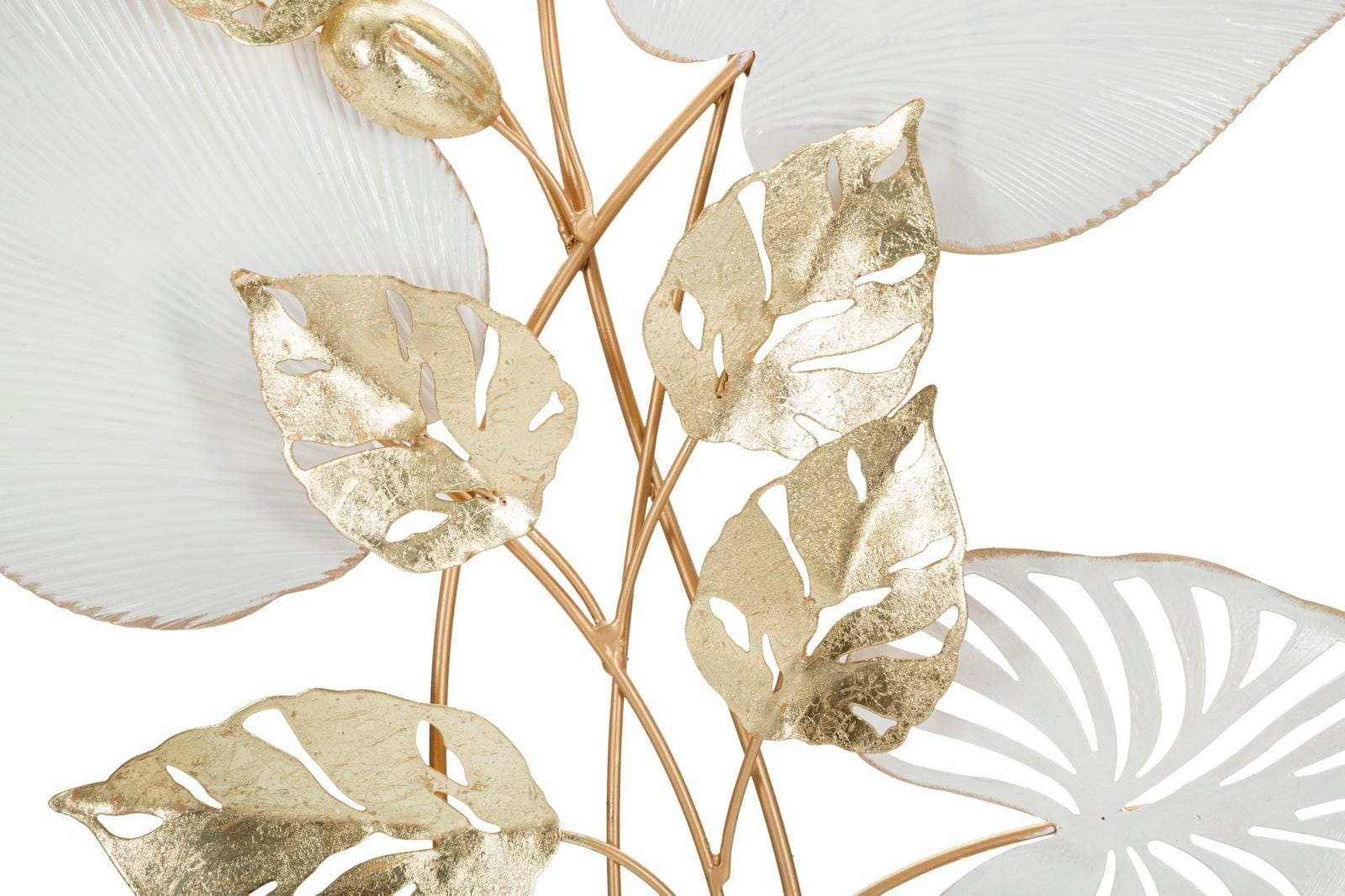 Połączenie dużych, białych powierzchni liści z mniejszymi, złotymi akcentami zapewnia zaskakującą głębię i szlachetną grę światła na ścianie. Organiczne linie nadają obiektowi naturalną lekkość, a wysokiej jakości metalowe wykończenie dodaje odrobinę blasku.
