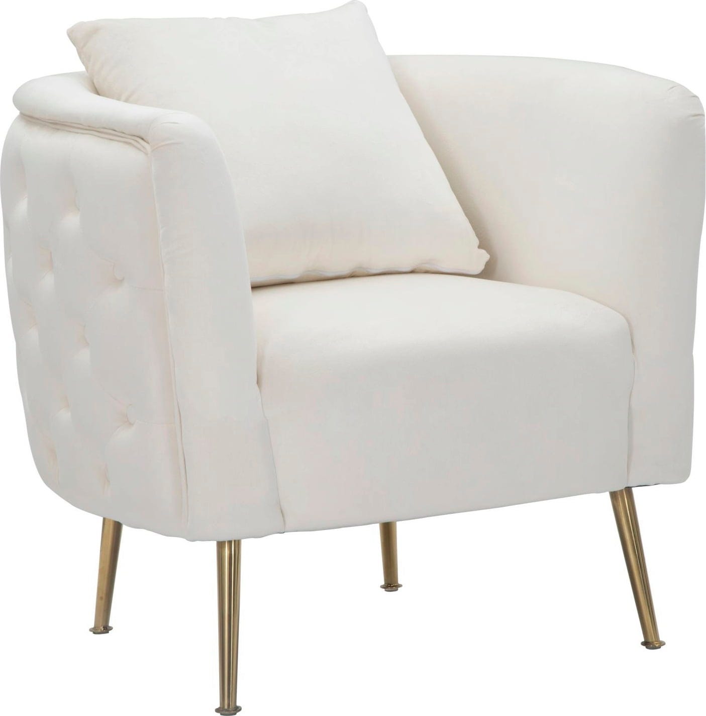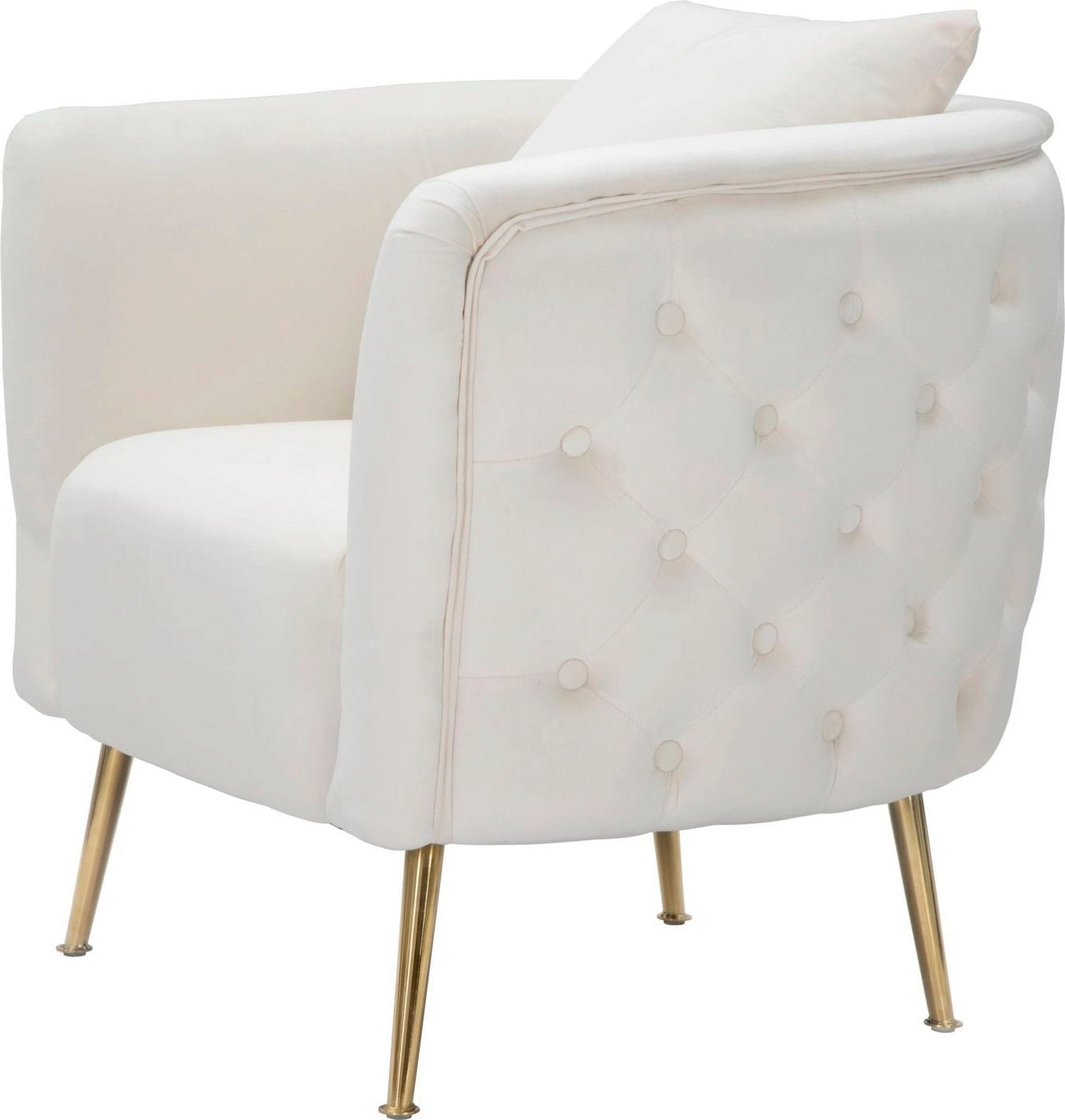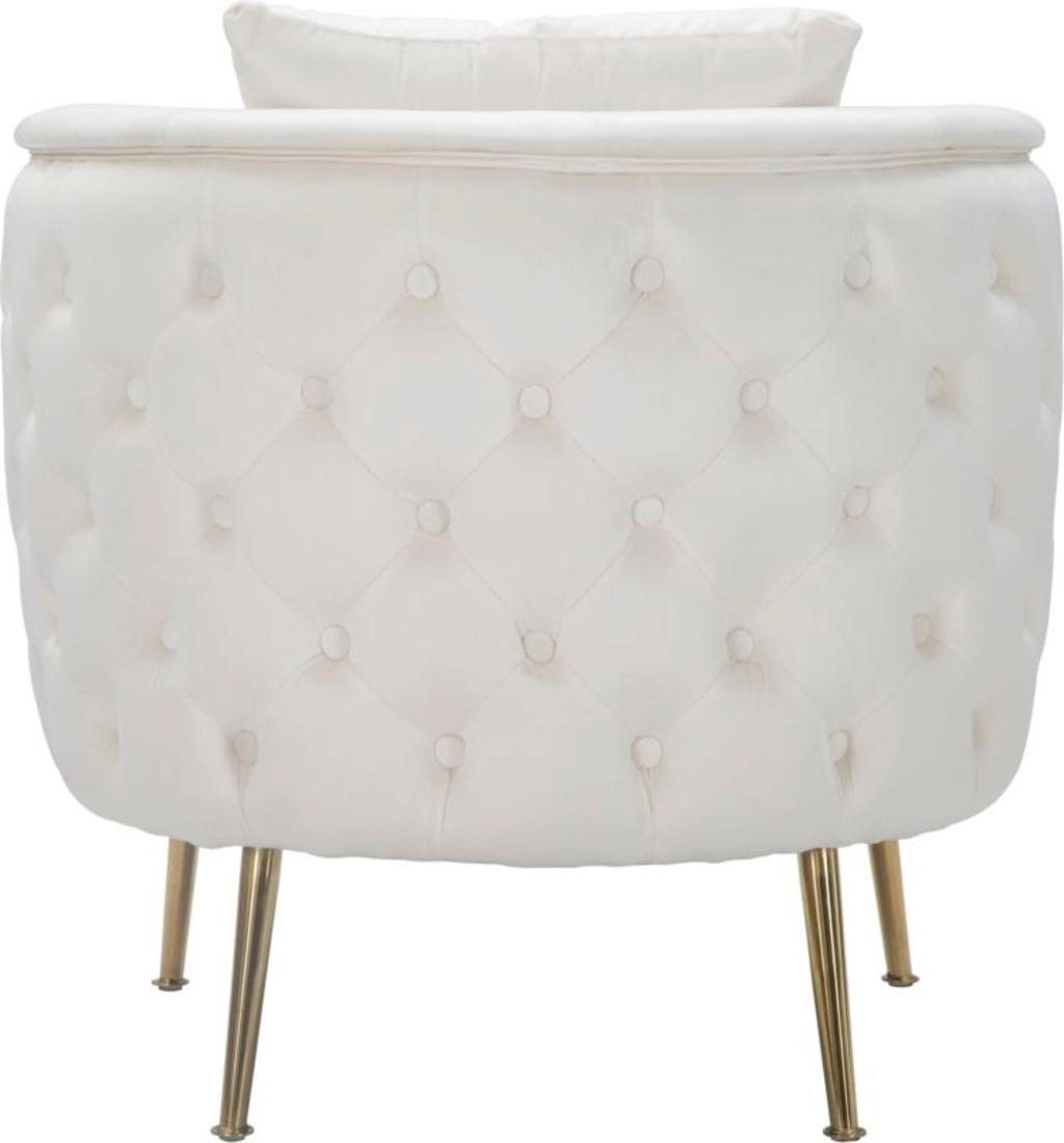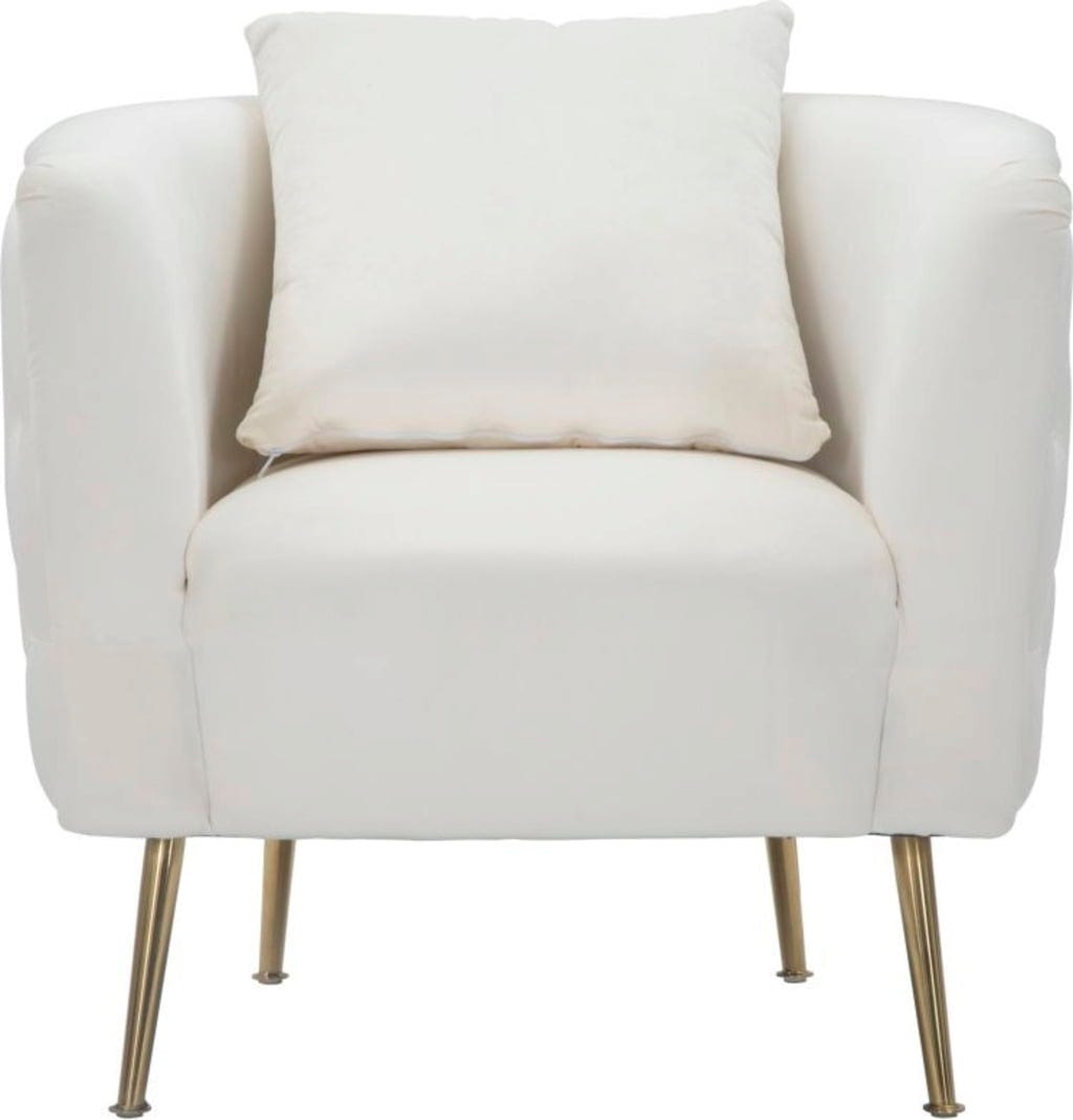 Elegancję fotela podkreślają smukłe, złote metalowe nogi, które tworzą nowoczesny, luksusowy kontrast z jasnym kolorem. W zestawie znajduje się dopasowana poduszka oparciowa. Idealny jako element przyciągający wzrok w salonie lub do przytulnego kącika do czytania!