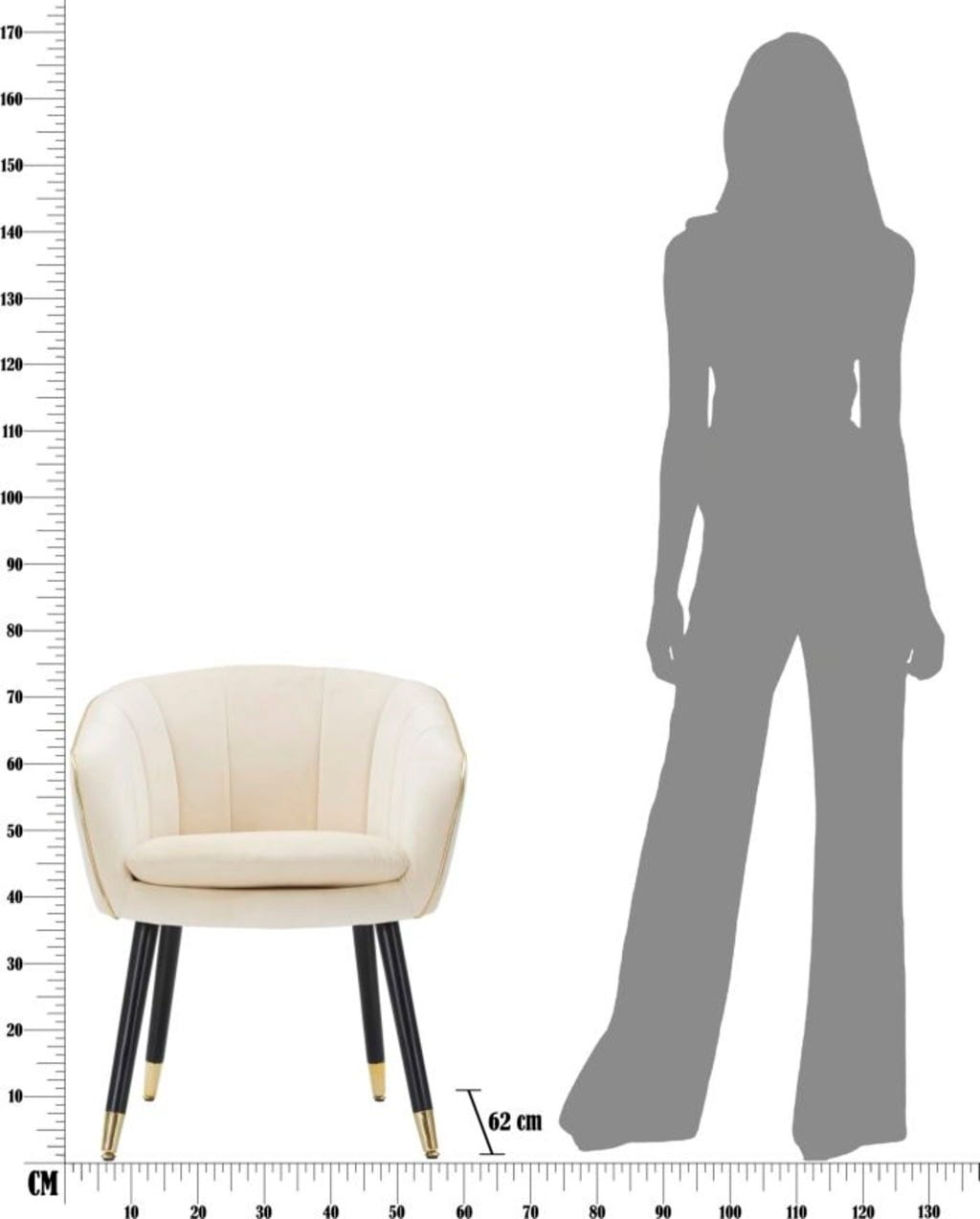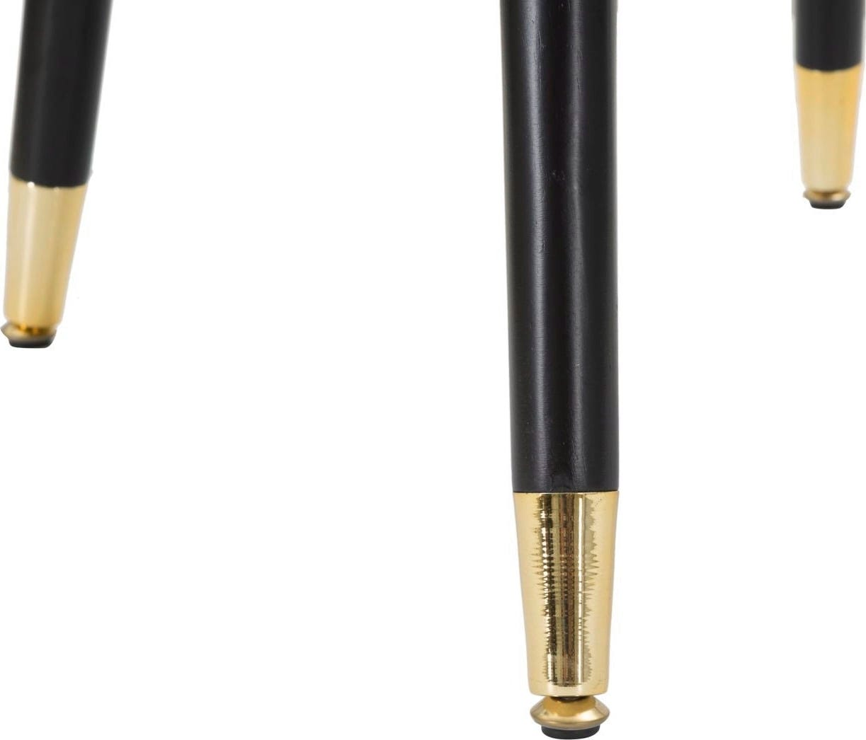Fotel spoczywa na solidnych, ustawionych pod kątem czarnych drewnianych nogach, które na końcach zostały ozdobione błyszczącymi, złotymi detalami – to ponadczasowe połączenie kolorystyczne, które emanuje czystą elegancją. Idealny do kącika czytelniczego lub jako stylowe uzupełnienie sofy.