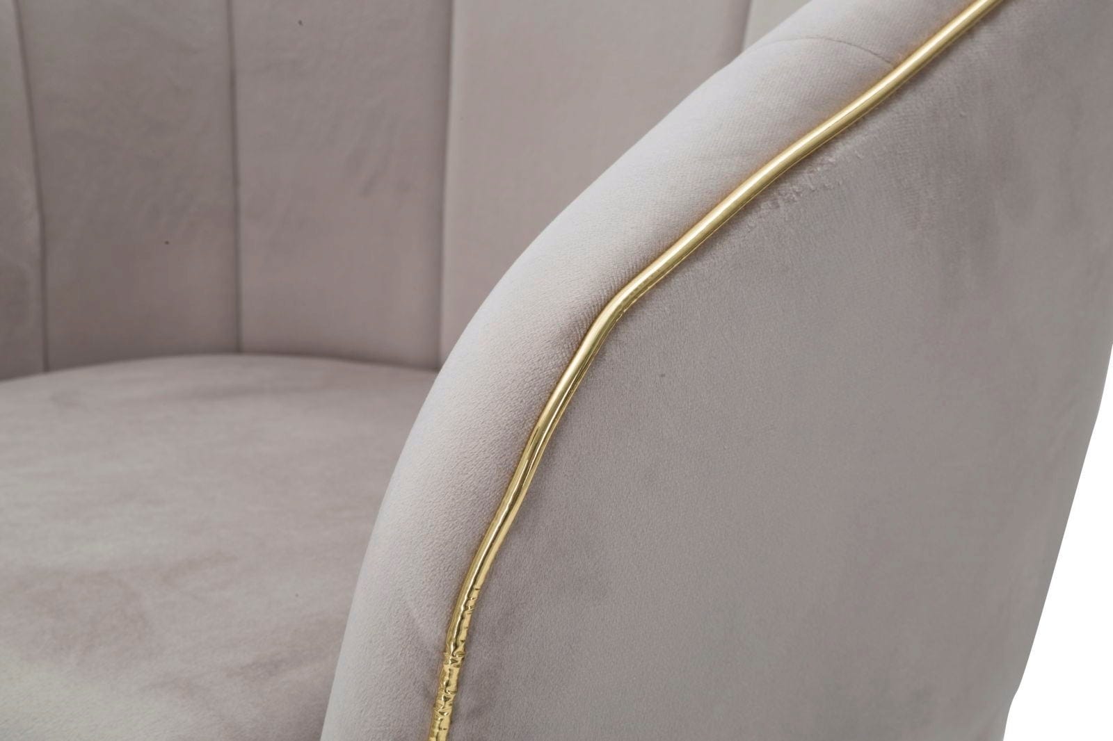 Nadaj swojemu wnętrzu odrobinę klasy i relaksującego komfortu dzięki temu eleganckiemu fotelowi! Jest on wykończony miękkim, tapicerowanym obiciem z tkaniny w stylowym odcieniu szarości. Elegancki kształt podkreśla błyszcząca, złota lamówka, która stanowi luksusowy akcent.
