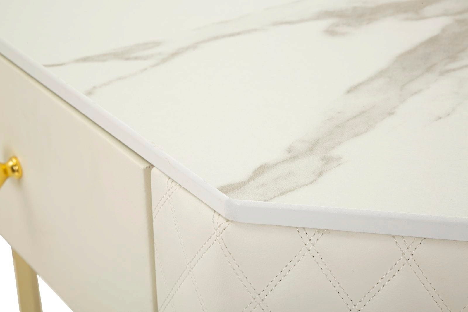 Stylowo wykorzystaj narożniki swojego pomieszczenia dzięki tej luksusowej konsoli narożnej. Trójkątny design to idealne, oszczędzające miejsce rozwiązanie, które łączy w sobie najwyższą elegancję z funkcjonalnością. Blat o szlachetnym wyglądzie marmuru oraz boki obite luksusową, pikowaną ekoskórą natychmiast tworzą pełną przepychu atmosferę.