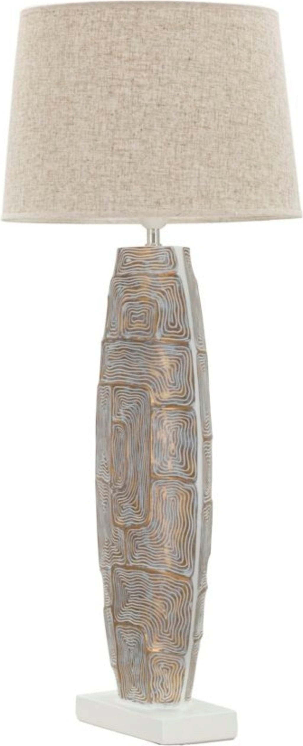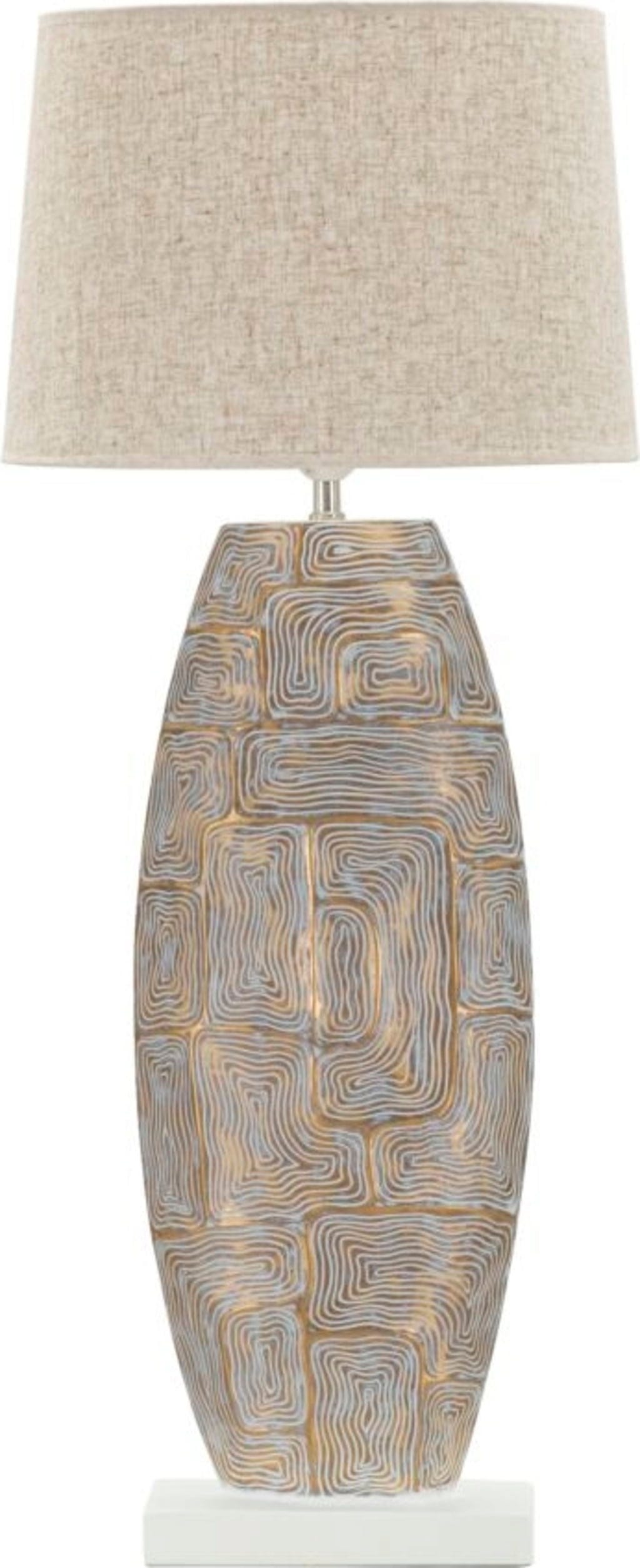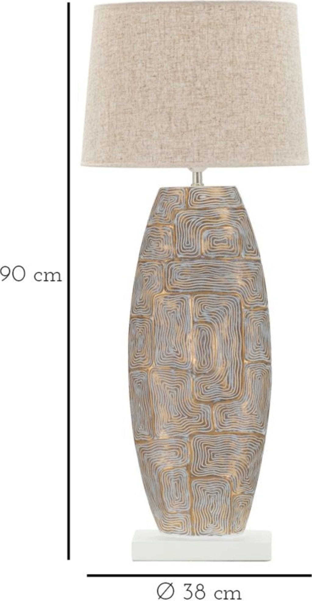 Nadaj swojemu domowi wykwintny i pełen charakteru akcent dzięki tej wyjątkowej lampie stołowej! Lekko owalna podstawa z wysokiej jakości żywicy syntetycznej przyciąga wzrok fascynującym, geometrycznym reliefem, który mieni się w eleganckich odcieniach szaroniebieskiego i ciepłego złota.