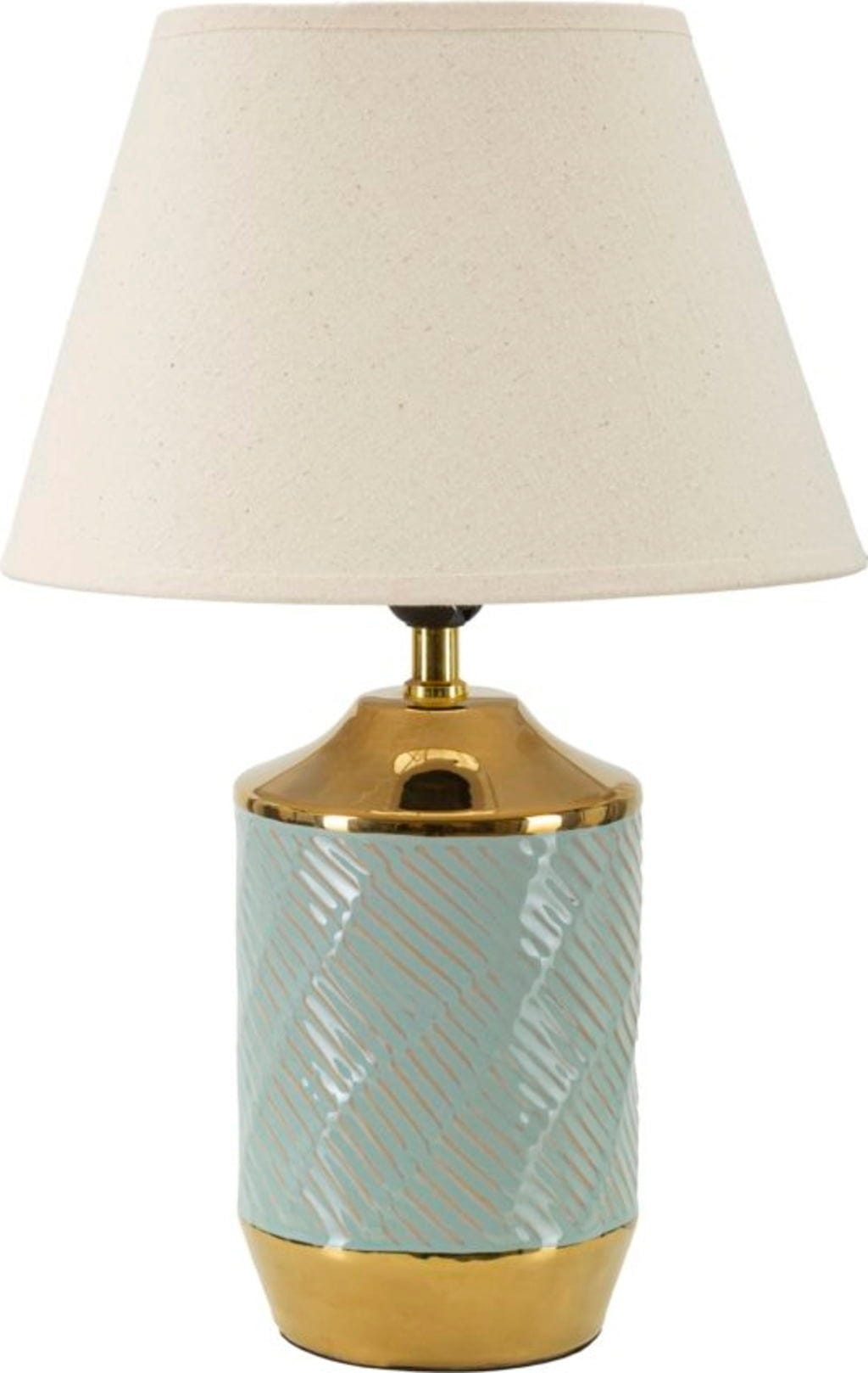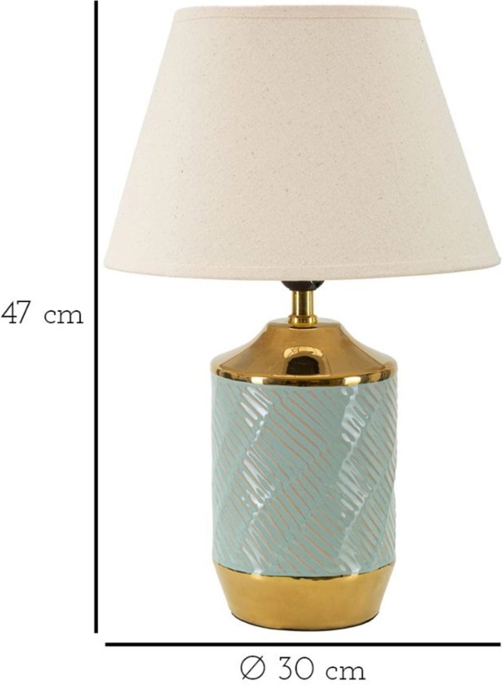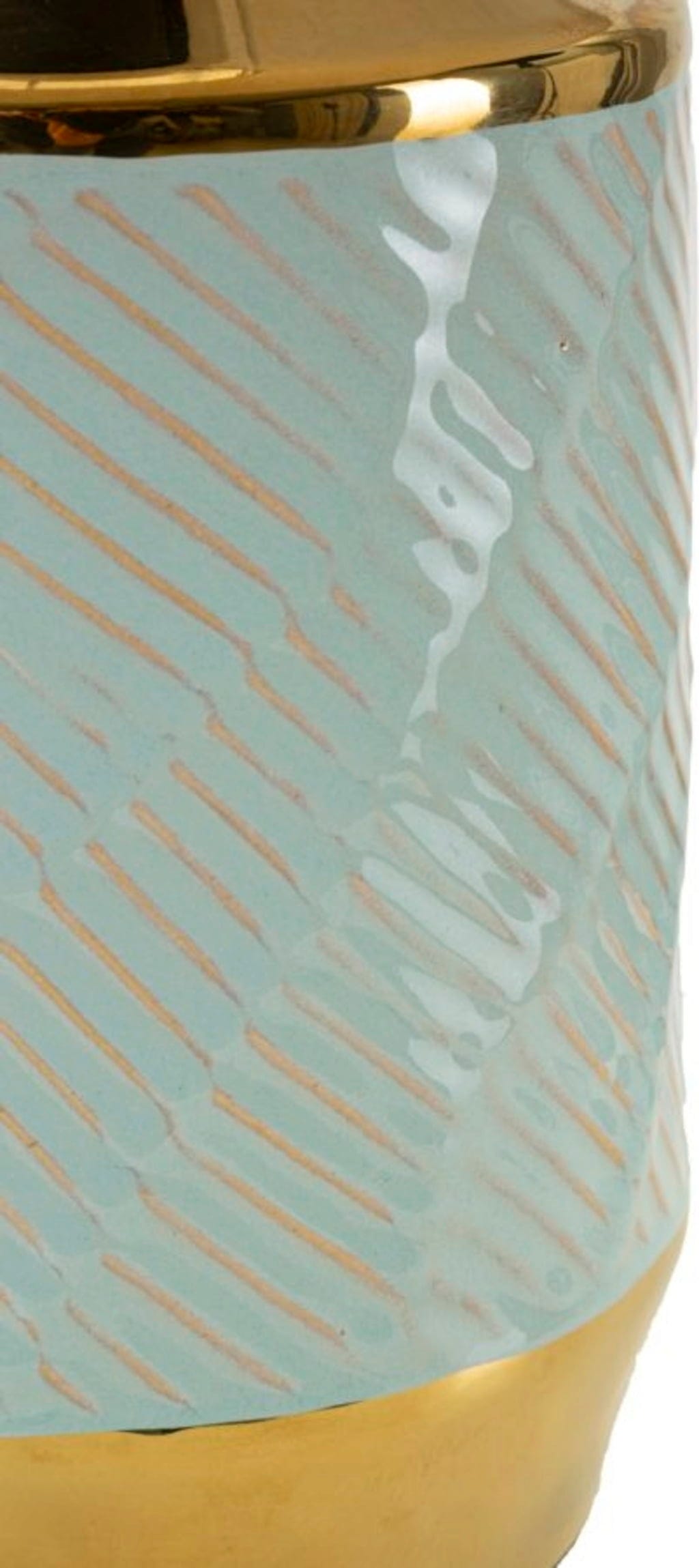 Nadaj swojemu wnętrzu świeżą, a zarazem luksusową atmosferę dzięki tej eleganckiej lampie stołowej. Korpus wykonany z wysokiej jakości ceramiki w delikatnym błękicie wprowadza do Twojego domu kojącą lekkość. Prosty design został efektownie podkreślony błyszczącymi, złotymi akcentami na podstawie i szyjce lampy.