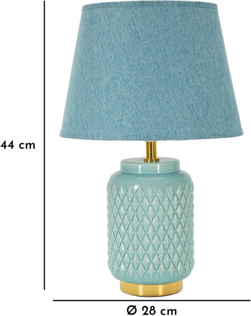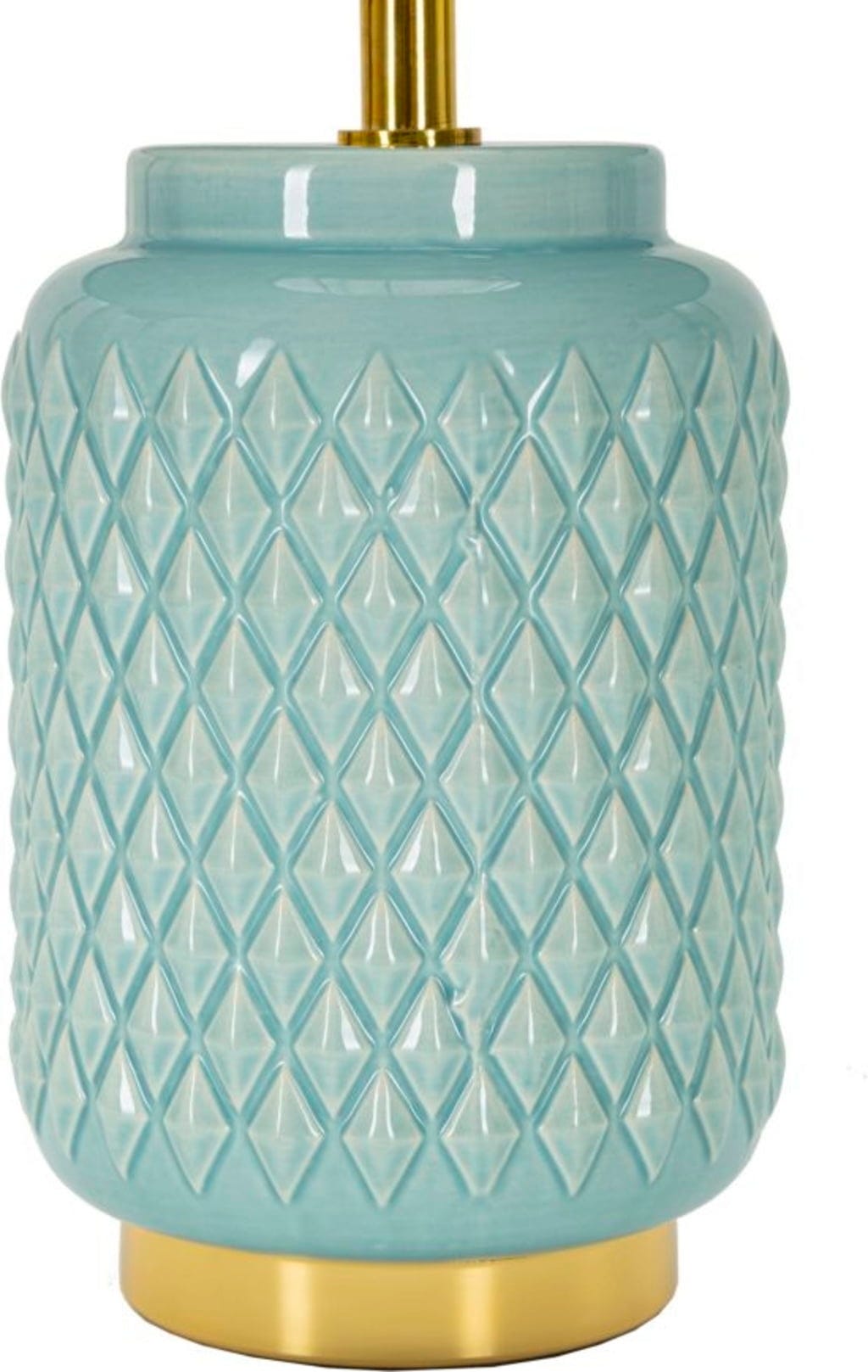 Postaw na odważny akcent kolorystyczny i wprowadź nowoczesny design do swojej sypialni dzięki tej imponującej lampce nocnej. Cylindryczna podstawa lampy w świeżym turkusie jest ozdobiona eleganckim, tłoczonym reliefem w romby, który nadaje powierzchni luksusową, wyczuwalną strukturę. Ten przyciągający wzrok design stylowo podkreśla błyszcząca, złota podstawa oraz złote detale na szyjce lampy.