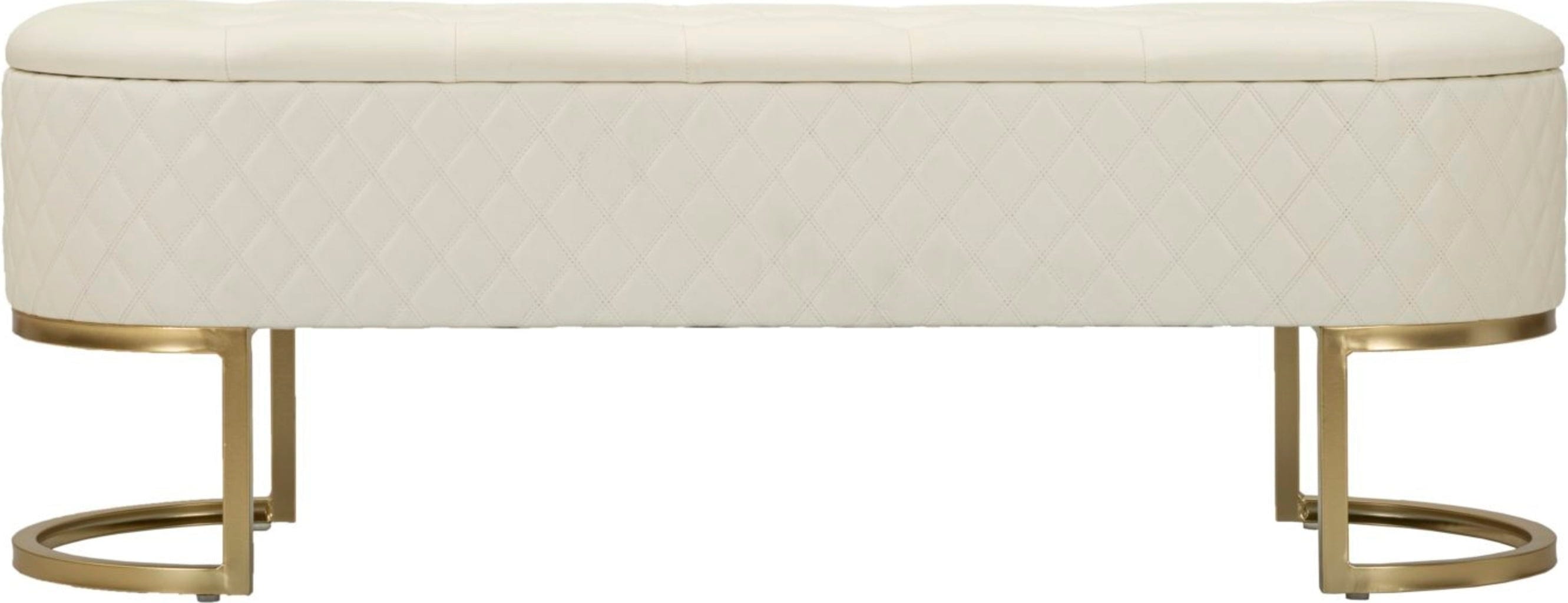 Połącz w swoim domu komfort z ekstrawaganckim designem dzięki tej eleganckiej i funkcjonalnej ławce! Zachwyca swoją charakterystyczną, wydłużoną formą, obitą luksusową, kremowobiałą ekoskórą i wykończoną subtelnym pikowaniem w romby. Miękka tapicerka zapewnia wygodne miejsce do siedzenia, a dwie zintegrowane szuflady oferują zaskakująco dużo miejsca do przechowywania koców lub innych akcesoriów.
