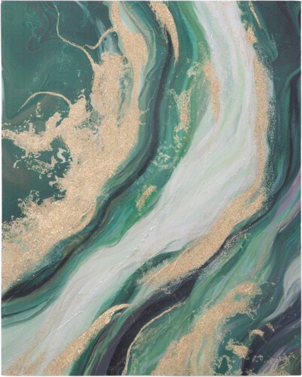 Kompozycja fascynuje wirami głębokiej i szmaragdowej zieleni, które harmonijnie kontrastują z jasnymi, niemal białymi akcentami. Szczególnym wyróżnikiem są obficie wkomponowane, lśniące złote elementy, które niczym drogocenne żyły przebiegają przez płynną strukturę i tworzą błyskotliwe efekty przy padaniu światła. Naciągnięty na wysokiej jakości drewnianą ramę, Greenery to powiew nowoczesnej sztuki, który wnosi świeżość i ekskluzywność bezpośrednio do Twojego domu.