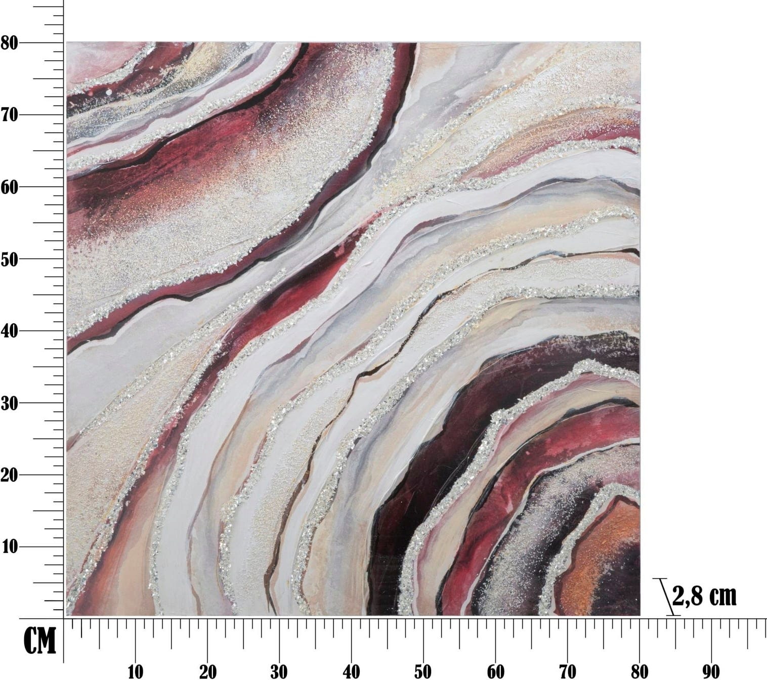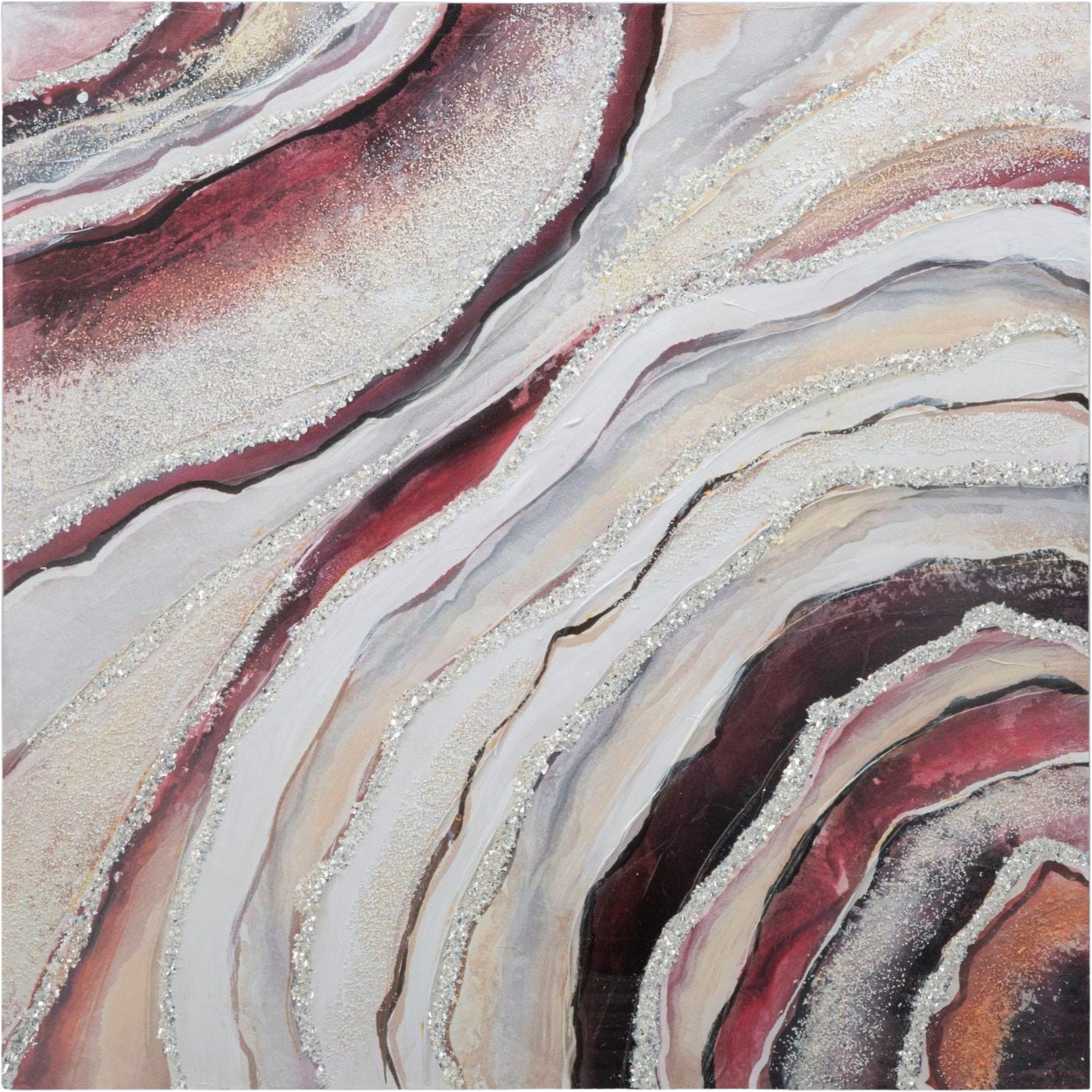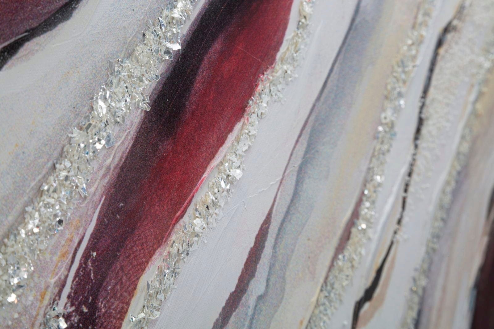 Design przypomina naturalne piękno szlachetnego agatu lub formacji geologicznej. Dynamiczne fale w intensywnej czerwieni, głębokim burgundzie i łagodnych odcieniach kremowych harmonijnie się przenikają. Wyjątkowym akcentem są lśniące, srebrne detale, które niczym żyły drogocennego kwarcu przebiegają przez obraz, zapewniając błyskotliwe efekty przy odpowiednim oświetleniu. Rozpięty na stabilnej drewnianej ramie, obraz Redy wnosi powiew nowoczesnej sztuki i ekskluzywnego wyrafinowania prosto do Twojego domu!