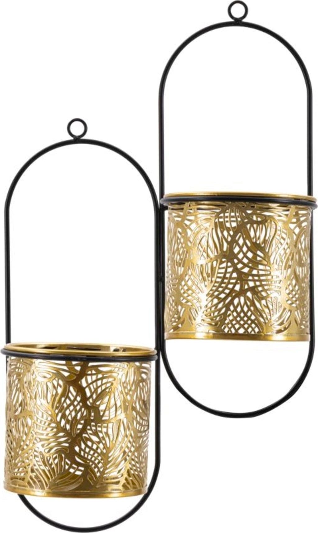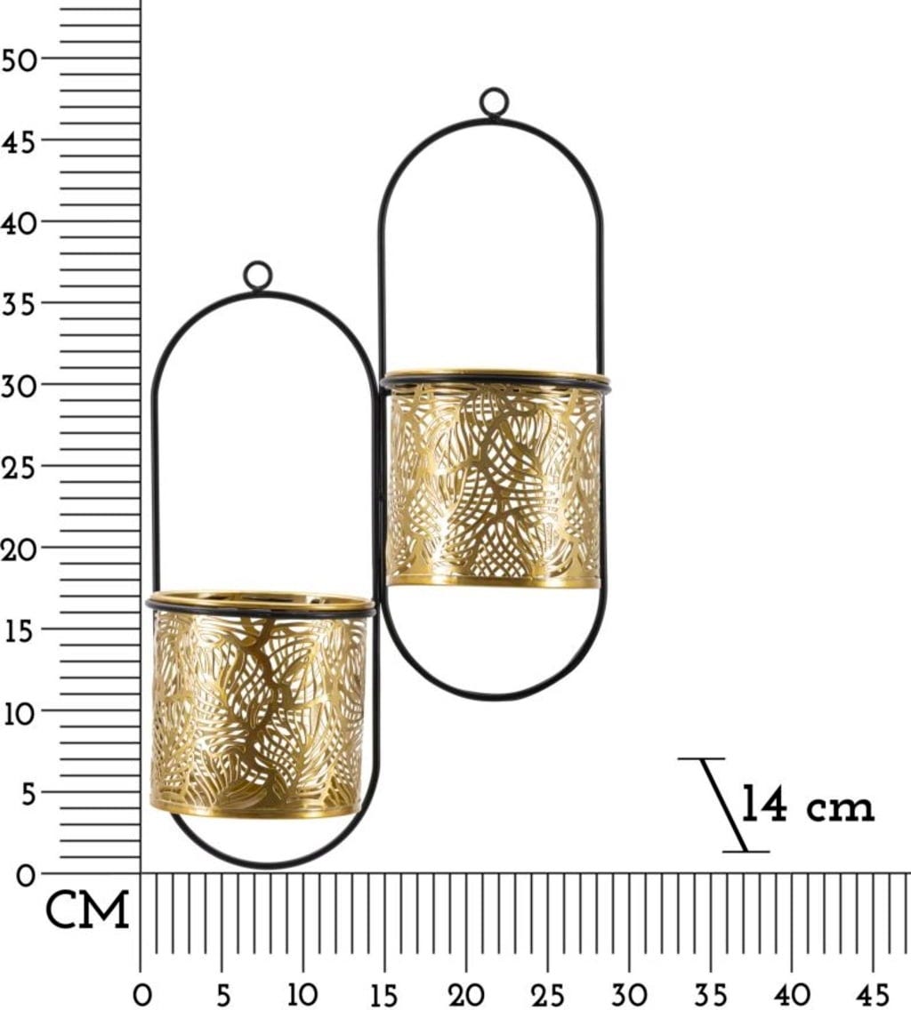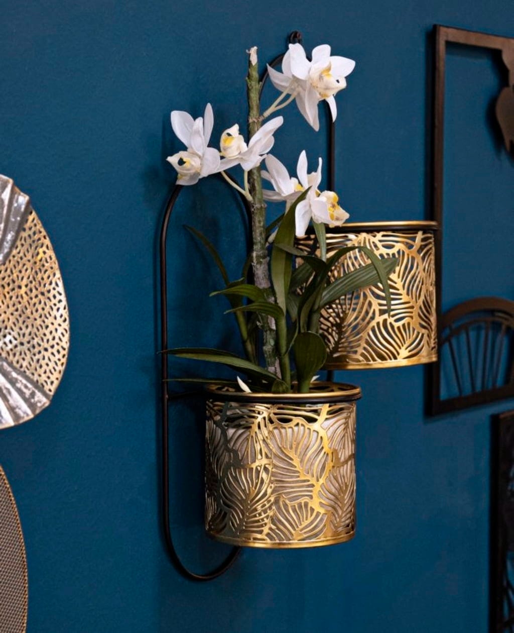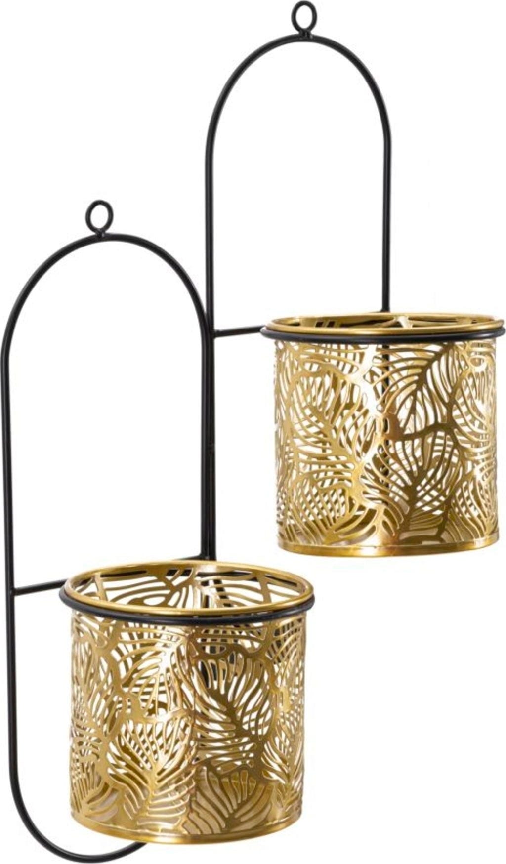 Nadaj swoim roślinom nową, luksusową oprawę dzięki temu precyzyjnie wykonanemu, podwójnemu uchwytowi ściennemu na doniczki! Doniczka zachwyca eleganckim, złotym wykończeniem i filigranowymi zdobieniami w kształcie liści, które nadają powierzchni wyjątkową strukturę. Ten bogaty w detale design został stylowo wyeksponowany przez smukły, czarny metalowy stelaż, co tworzy efektowny i nowoczesny kontrast.