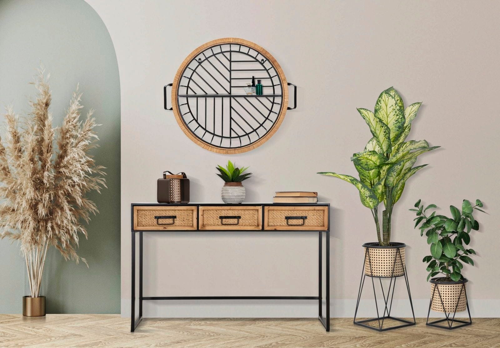 Proste, geometryczne linie wewnątrz półki tworzą fascynujący kontrast z organicznym, plecionym wyglądem ramy. Pozioma półka z czarnego metalu stanowi idealne miejsce dla małych przedmiotów dekoracyjnych, a boczne uchwyty i liniowa struktura kratki nadają jej indywidualny charakter. Czy to w przedpokoju, salonie, czy w kuchni – Cebu łączy rzemieślniczą sztukę plecionkarską z nowoczesnym stylem industrial-chic!