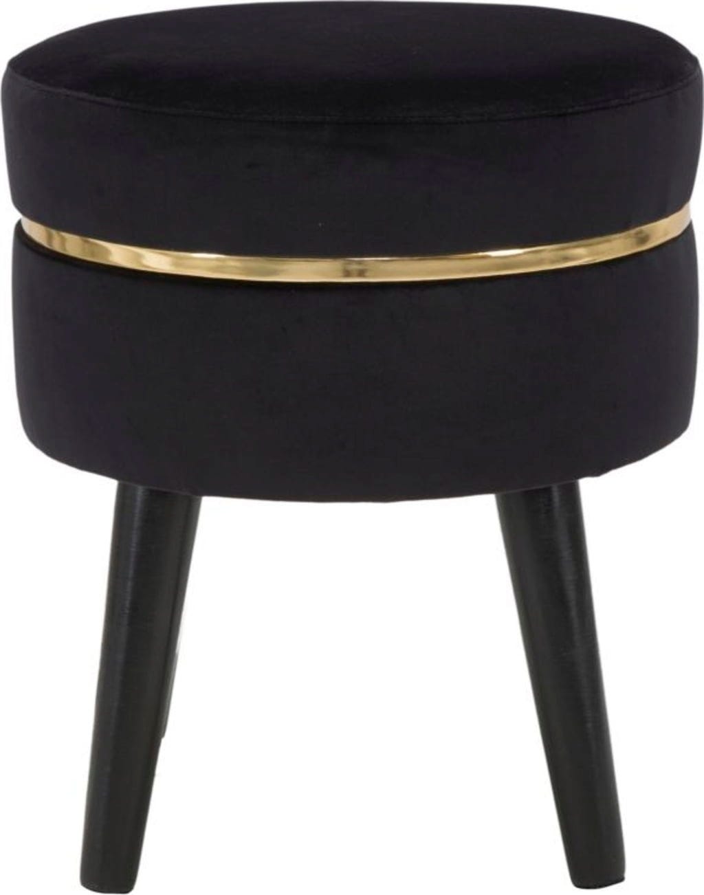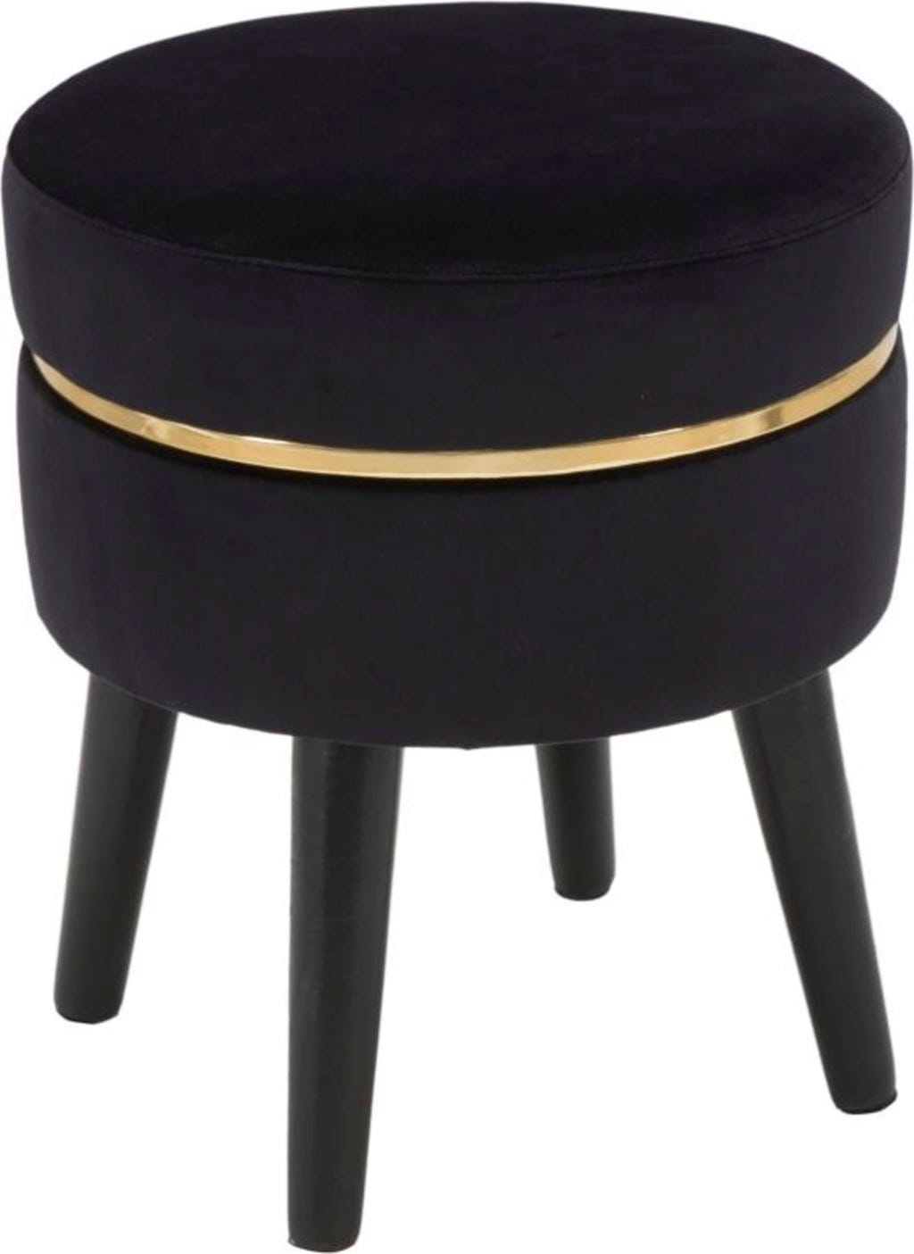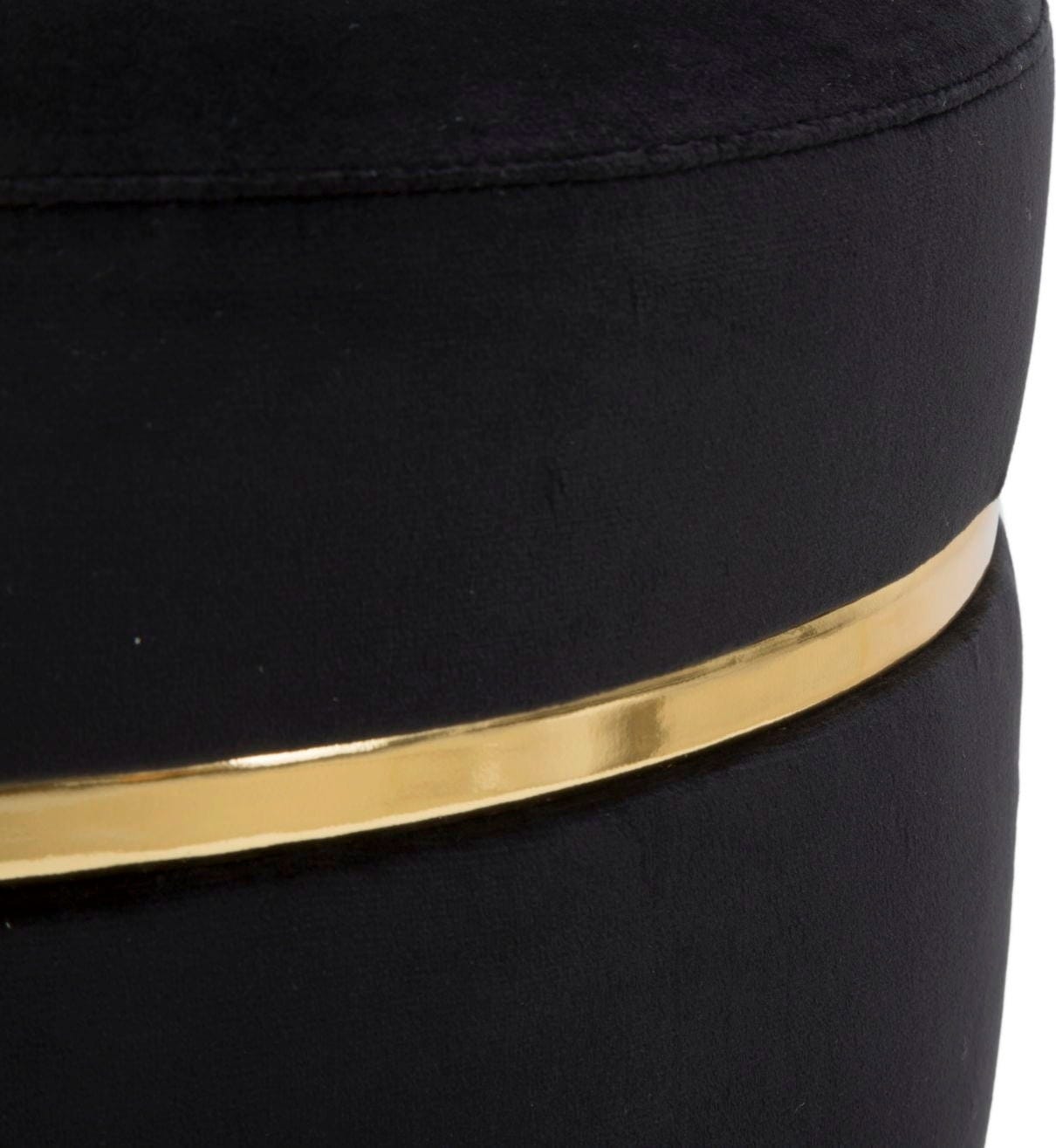 Przyciągający wzrok, złoty metalowy pierścień otacza siedzisko, stanowiąc lśniący akcent. Puf wspiera się na ukośnych, czarnych drewnianych nóżkach. Idealny jako dodatkowe siedzisko w salonie lub stylowy element wyposażenia sypialni!
