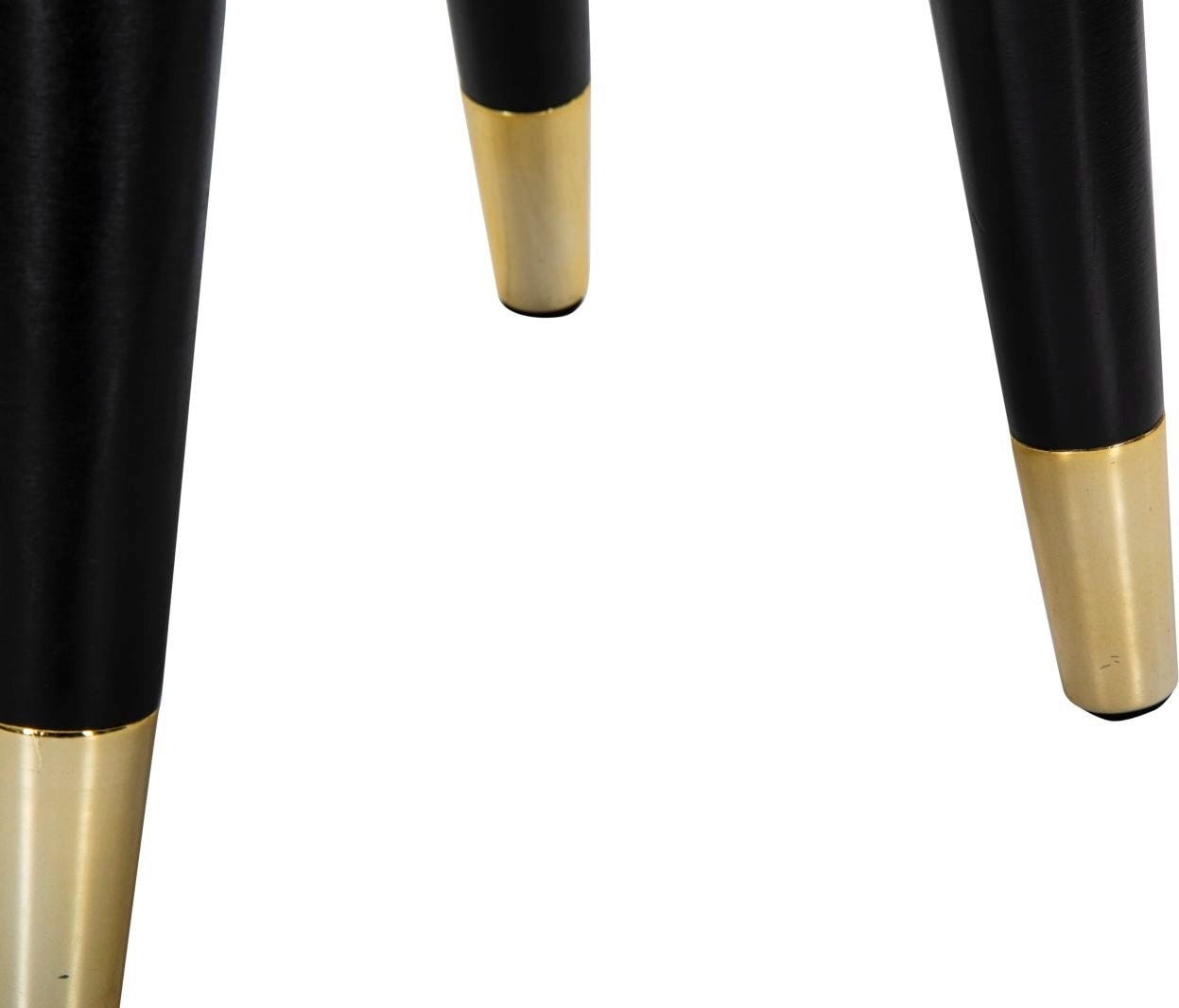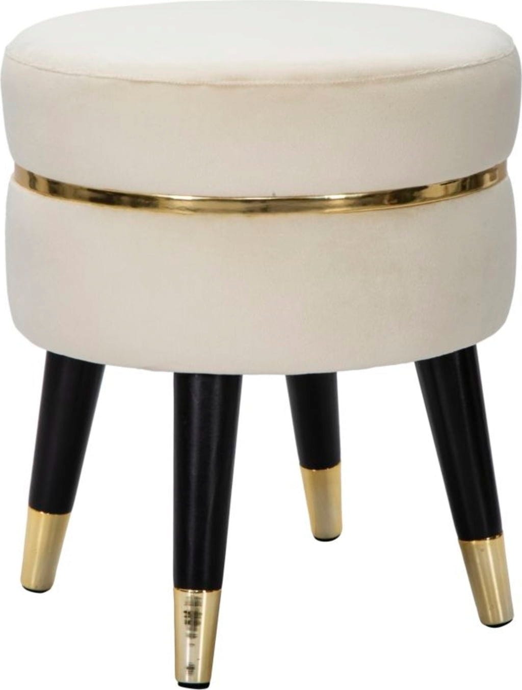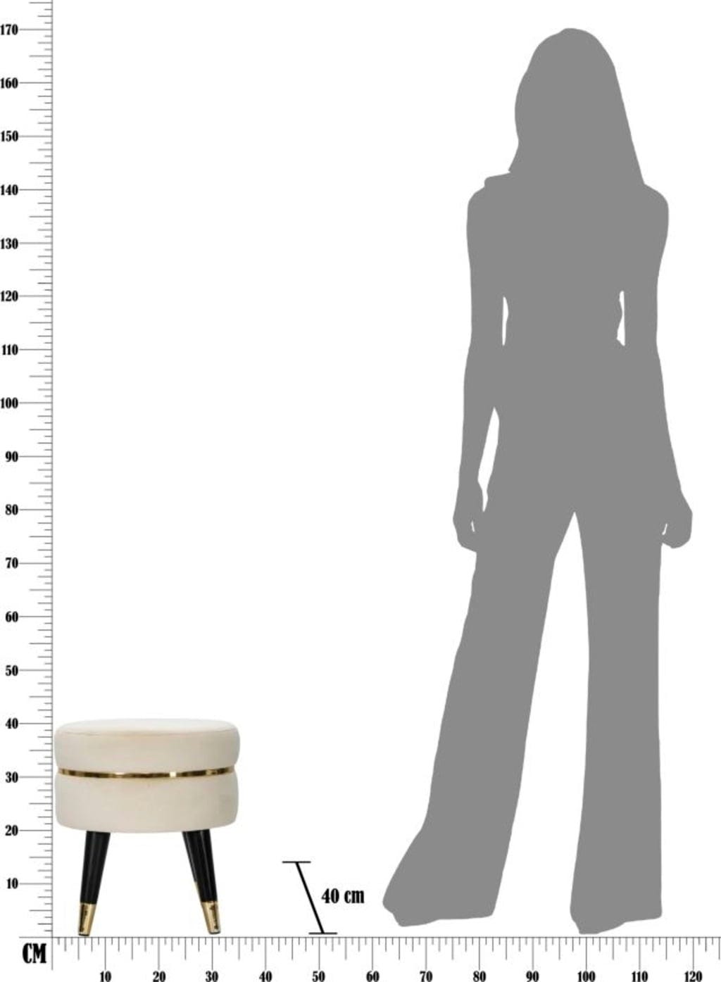 Przyciągający wzrok, złoty metalowy pierścień otacza siedzisko, stanowiąc lśniący akcent. Puf opiera się na ukośnych, czarnych drewnianych nóżkach, wykończonych złotymi metalowymi elementami. Idealny jako puf pomocniczy w salonie lub stylowe siedzisko w sypialni!