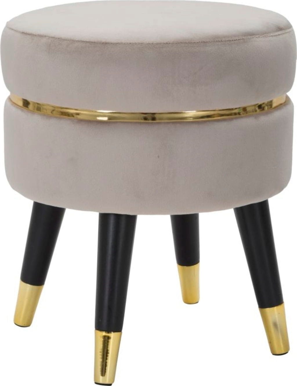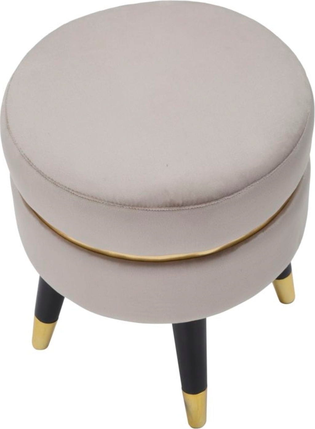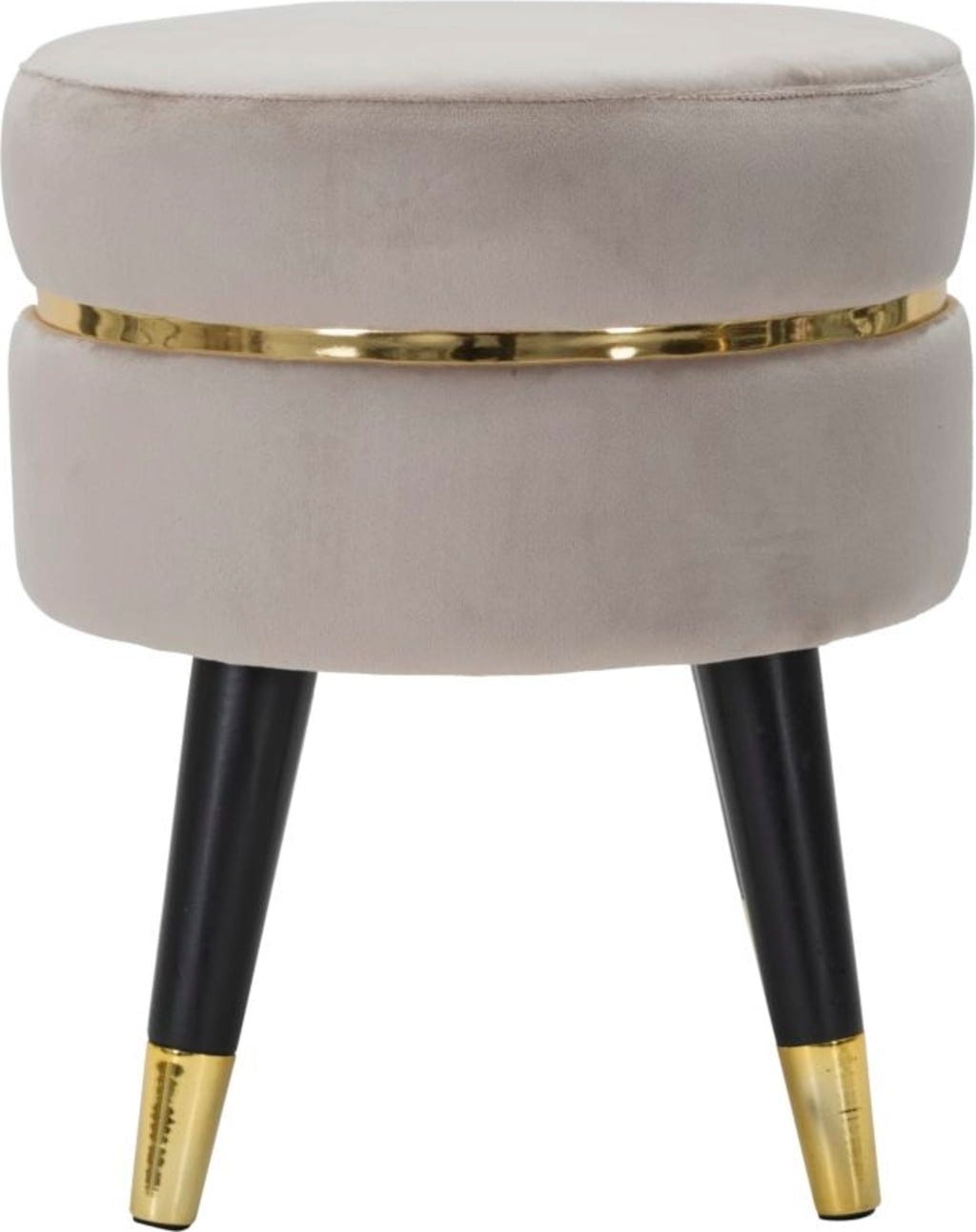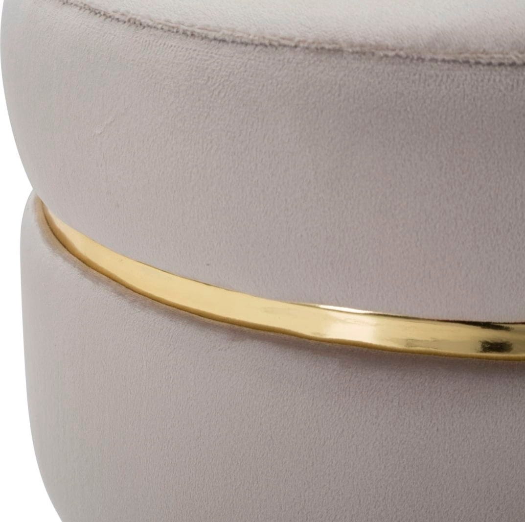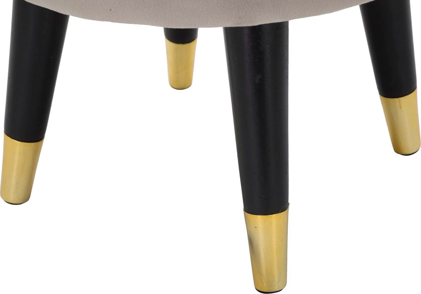 Efektowny, złoty metalowy pierścień otacza siedzisko, stanowiąc lśniący akcent. Puf opiera się na skośnych, czarnych drewnianych nóżkach wykończonych złotymi detalami. Idealny jako puf pomocniczy w salonie lub stylowe siedzisko w sypialni!