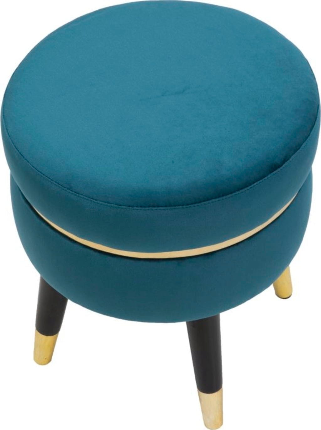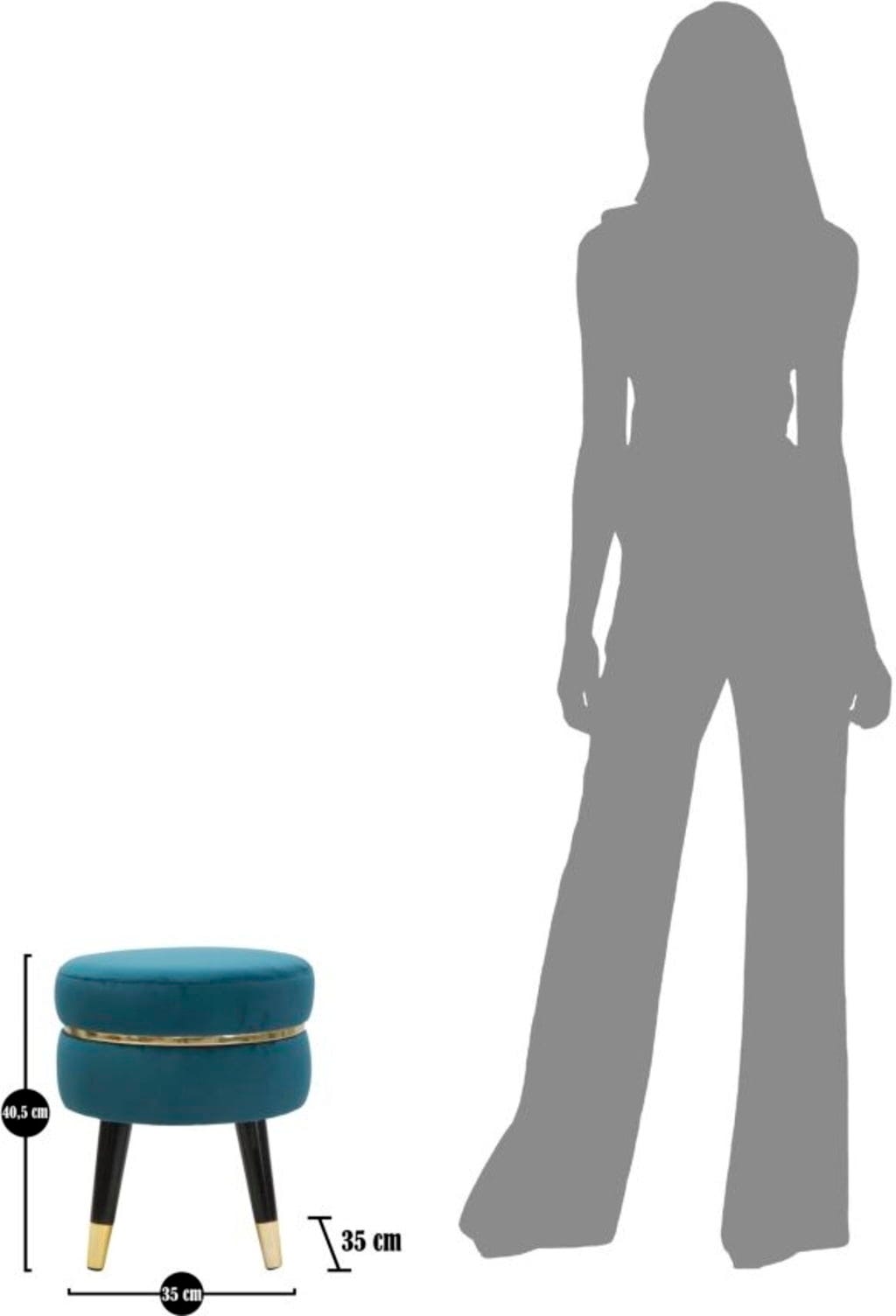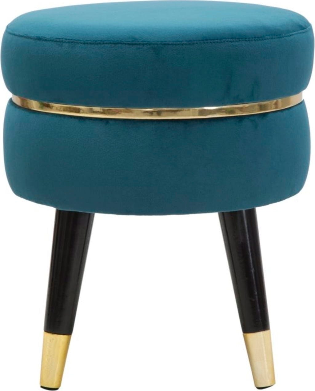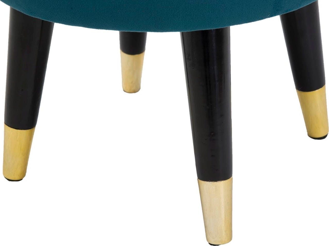 Efektowny, złoty metalowy pierścień otacza siedzisko, stanowiąc lśniący akcent. Puf wspiera się na ukośnych, czarnych drewnianych nóżkach, wykończonych złotymi metalowymi detalami. Idealny jako puf pomocniczy w salonie lub stylowe siedzisko w sypialni!