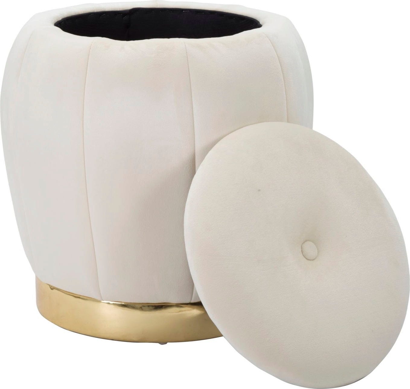 Efektowny, złoty metalowy pierścień stanowi podstawę i zapewnia lśniący akcent. Wyjątkowo praktyczna cecha: zdejmowana pokrywa skrywa zintegrowany schowek – idealny do stylowego przechowywania koców, czasopism czy pilotów.