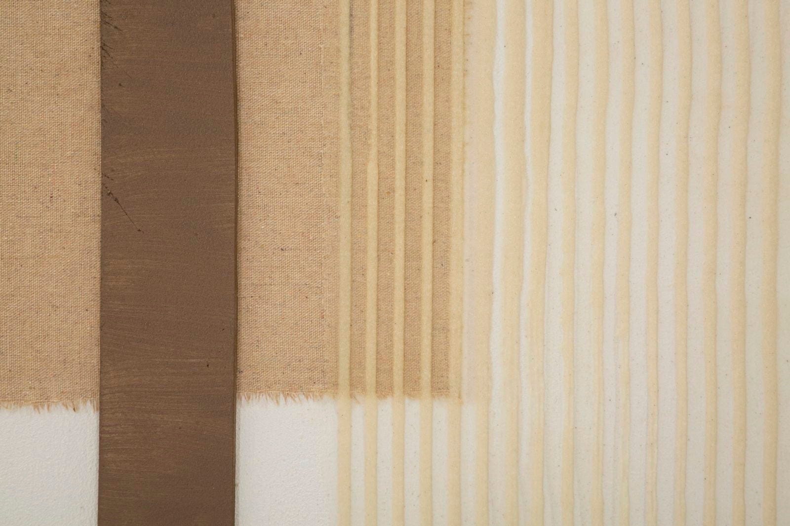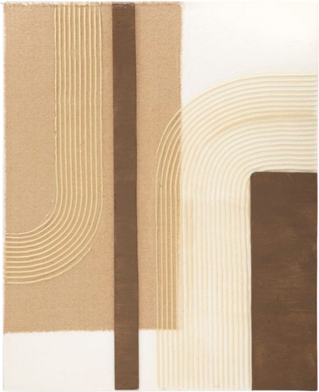 Dzieło sztuki gra geometrycznymi formami i naturalnymi teksturami: pionowe pasy w różnych odcieniach brązu spotykają się z jasnymi powierzchniami płótna. Wyjątkowym akcentem są reliefowe aplikacje z cienkich sznurków w kolorze kremowym, które przebiegają w łagodnych krzywiznach po powierzchni, nadając obrazowi fascynującą trójwymiarowość. Naciągnięty na stabilną drewnianą ramę, ten unikatowy egzemplarz wnosi powiew współczesnej galerii prosto do Twojego domu!
