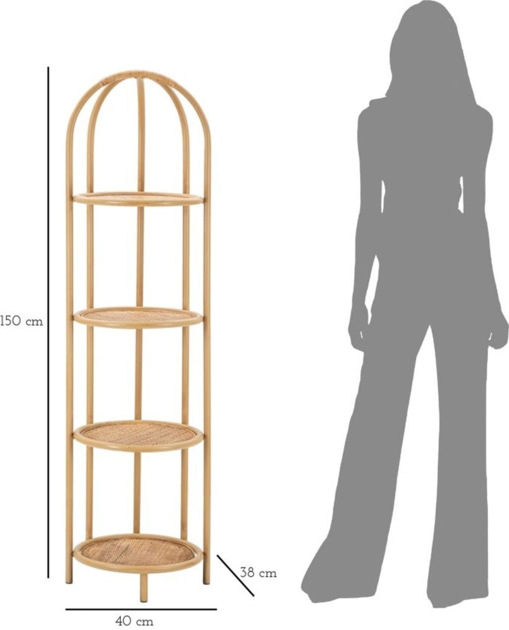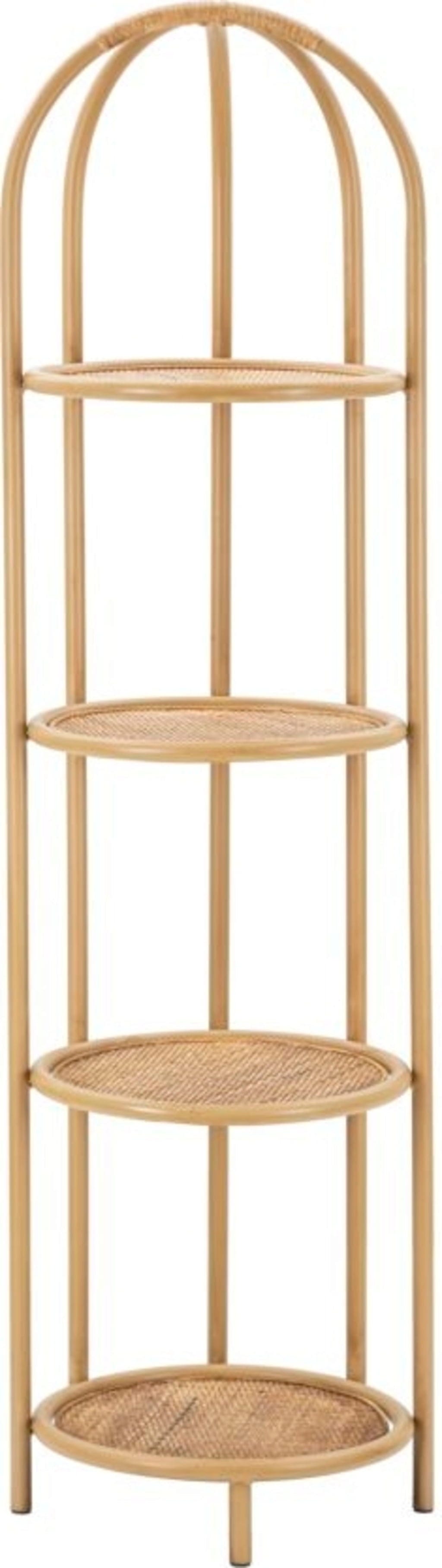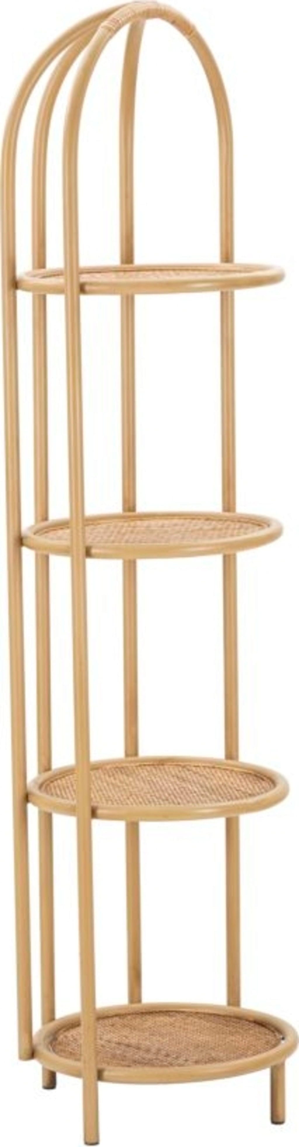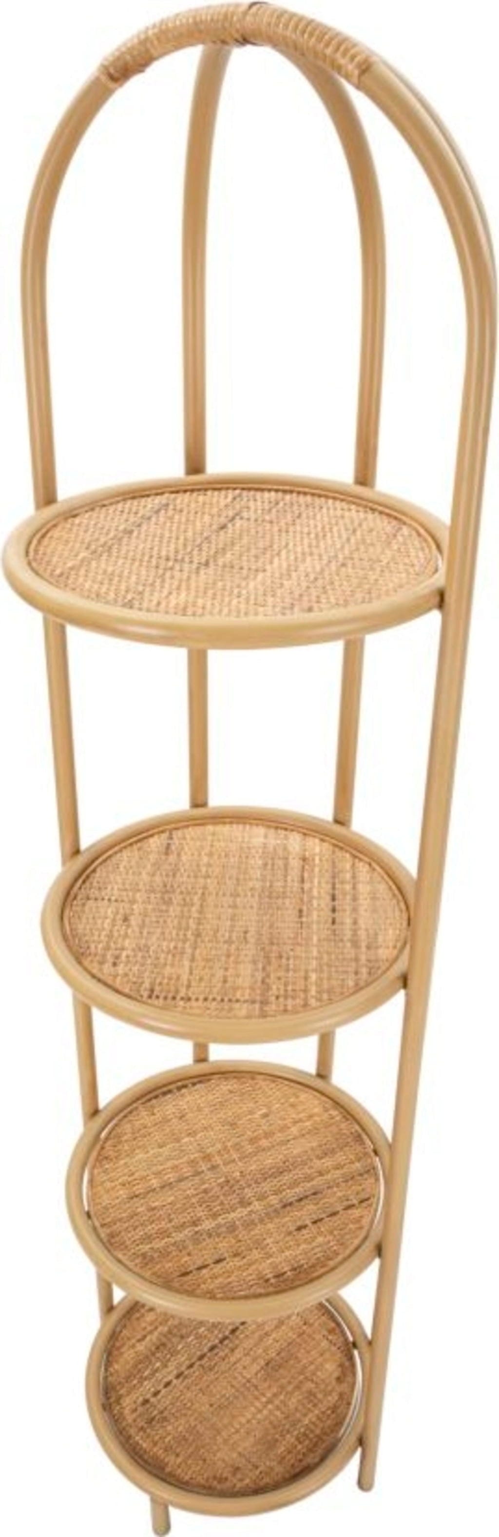 Wyposażony w cztery okrągłe półki o strukturze drobnej plecionki, regał stanowi idealne miejsce na książki, rośliny lub ulubione przedmioty kolekcjonerskie. Miękkie, proste linie i zachęcający design sprawiają, że jest on doskonałym uzupełnieniem każdego wnętrza – czy to w przedpokoju, salonie, czy w przytulnym kąciku do czytania. Dzięki smukłej budowie regał Panama bez trudu wpasuje się nawet w niezagospodarowane narożniki, nadając im wyjątkowy, przytulny charakter!