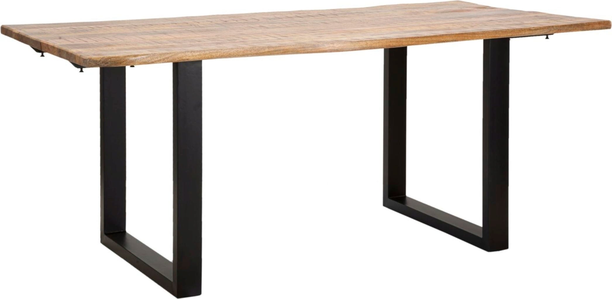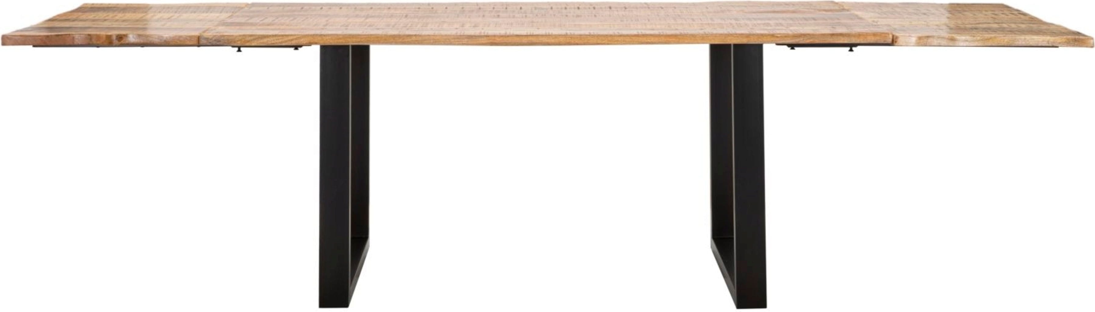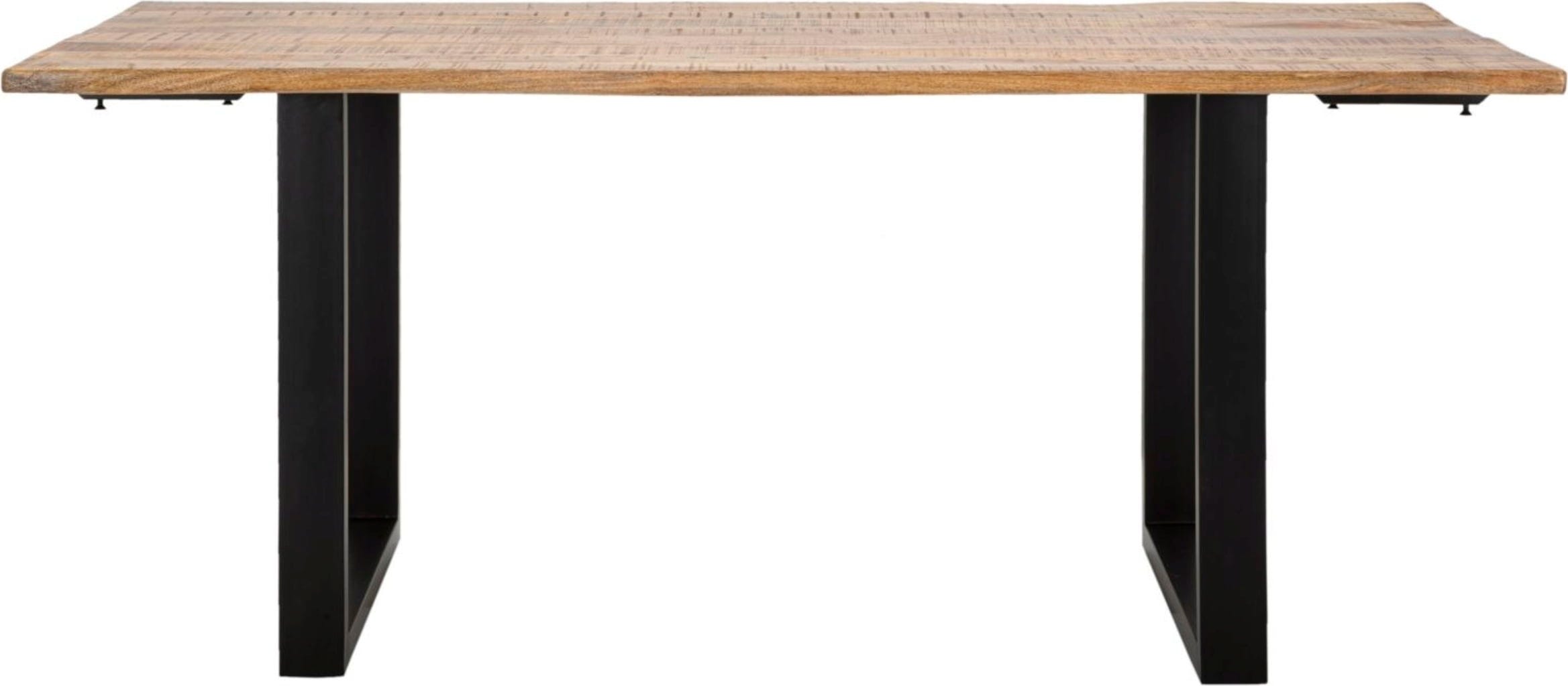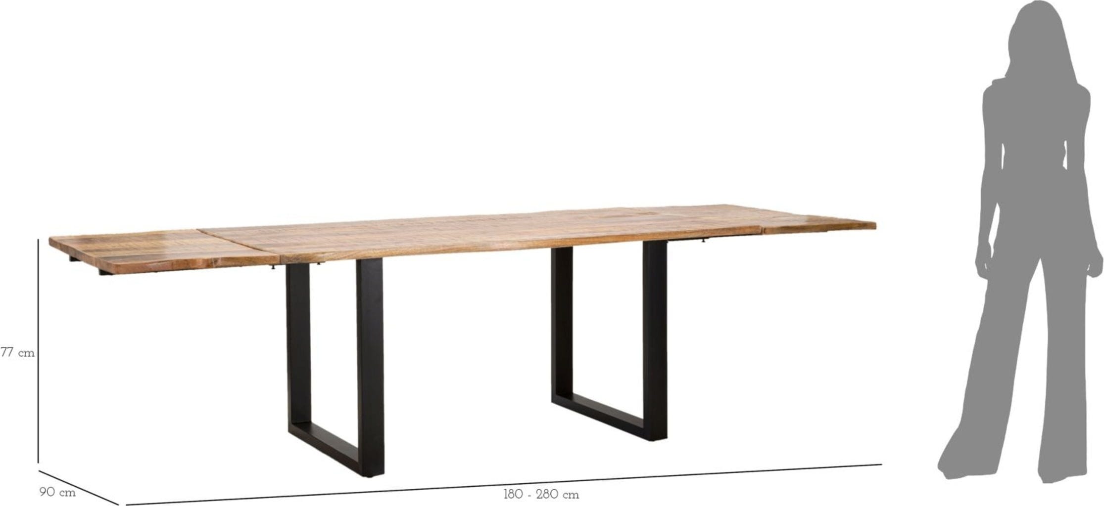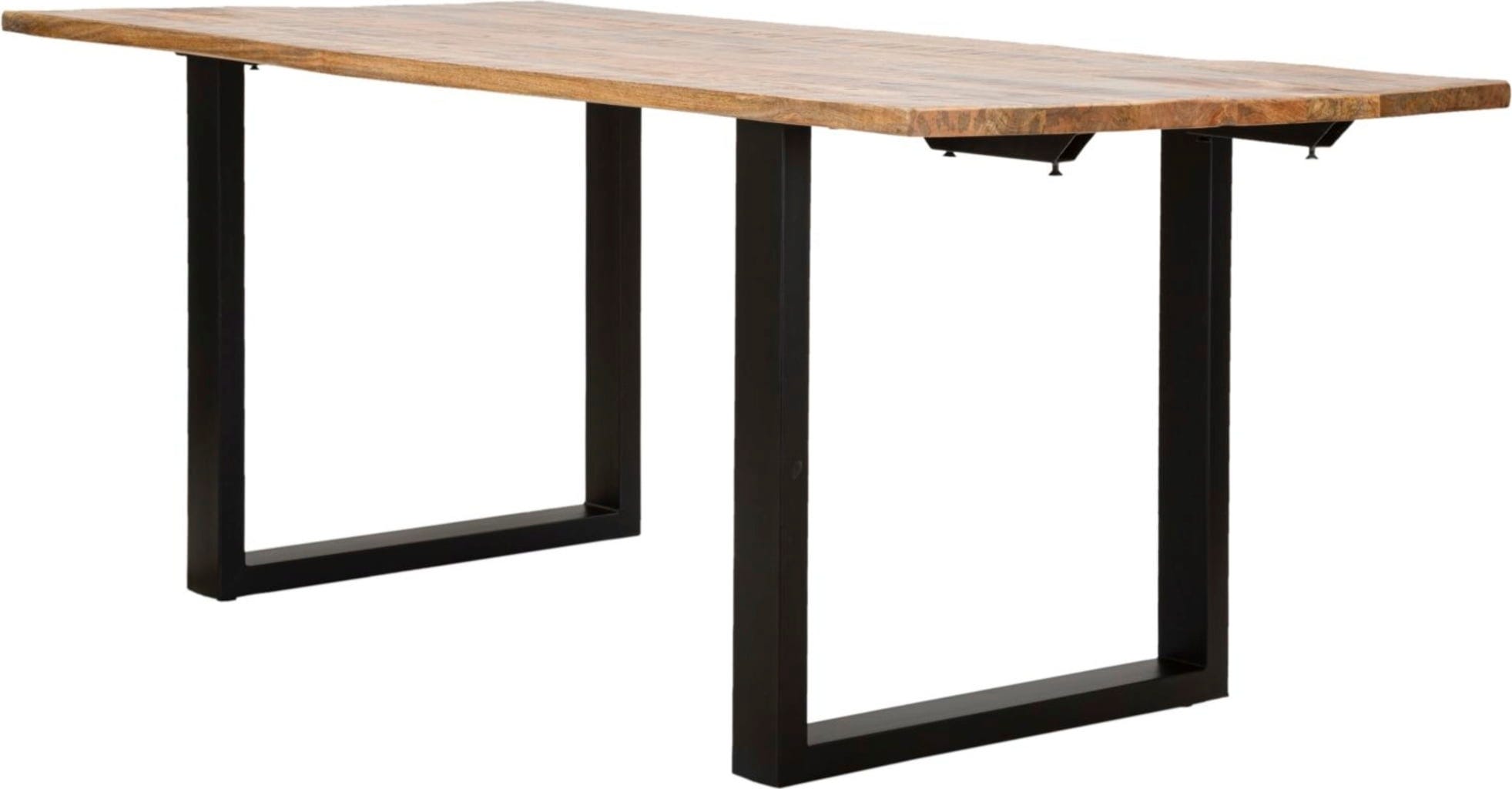 Wyrazisty drewniany blat z naturalnym usłojeniem spoczywa na stabilnych nogach w kształcie litery U, wykonanych z czarnego metalu, co nadaje konstrukcji przejrzystą i ponadczasową formę. Wyjątkowa cecha: dzięki praktycznej funkcji rozkładania powierzchnię stołu można powiększyć w mgnieniu oka, co pozwala na elastyczne przygotowanie się na wizytę gości w dowolnym momencie. Czy to na szybkie śniadanie, czy na duży rodzinny obiad – ten stół to trwały element dekoracyjny, który przyciąga wzrok w każdym domu!