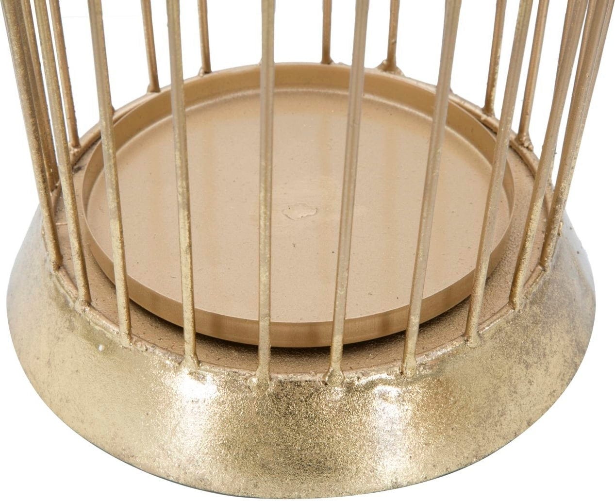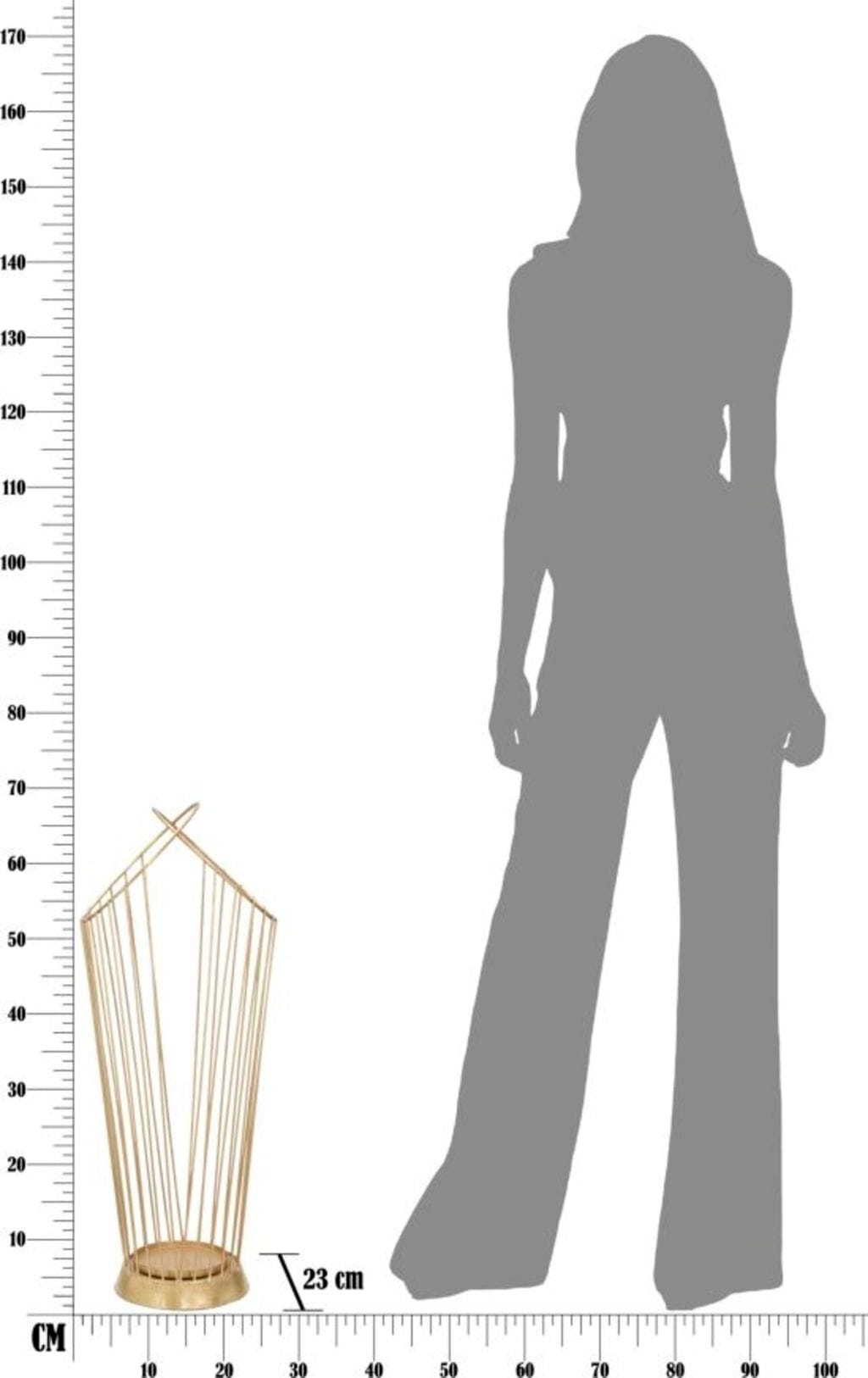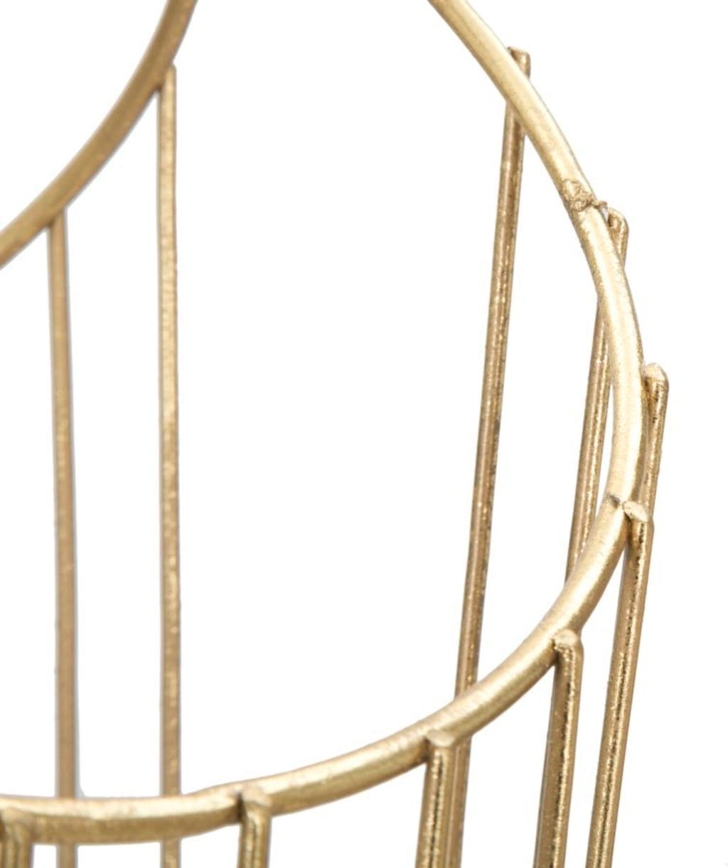 Filigranowe metalowe pręty zbiegają się u góry w kunsztownie skrzyżowaną formę, co nadaje obiektowi niemal rzeźbiarski charakter. Solidna podstawa zapewnia stabilność i sprawia, że podłoga pozostaje czysta i sucha nawet w deszczowe dni.
