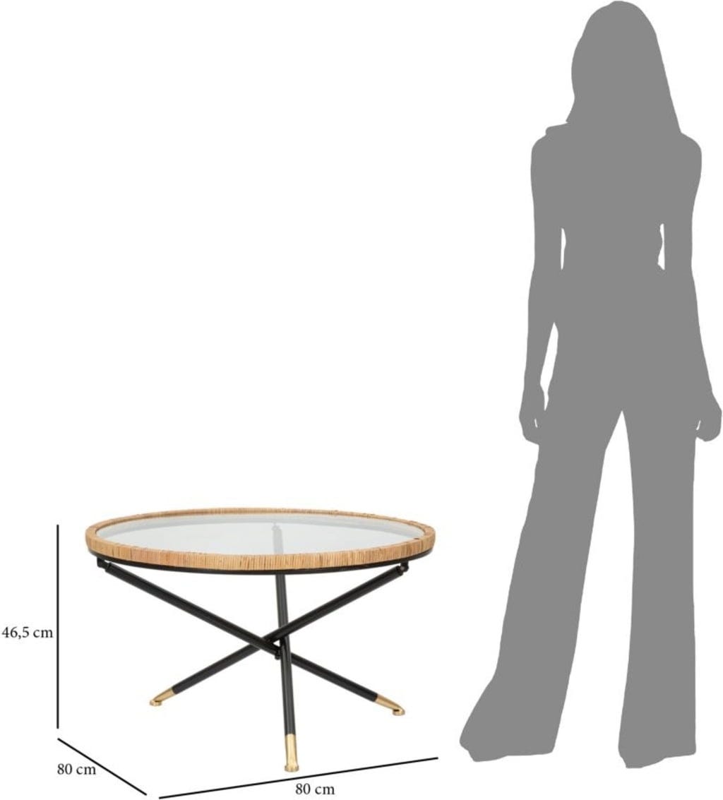 Nadaj swojemu salonowi stylowy akcent dzięki temu okrągłemu stolikowi kawowemu! Łączy on przejrzystość szklanego blatu z ciepłą, naturalną teksturą rattanowej plecionki, która stylowo go otacza. Solidny, czarny metalowy stelaż z nogami w kształcie litery X zapewnia wysoką stabilność i nowoczesny kontrast.