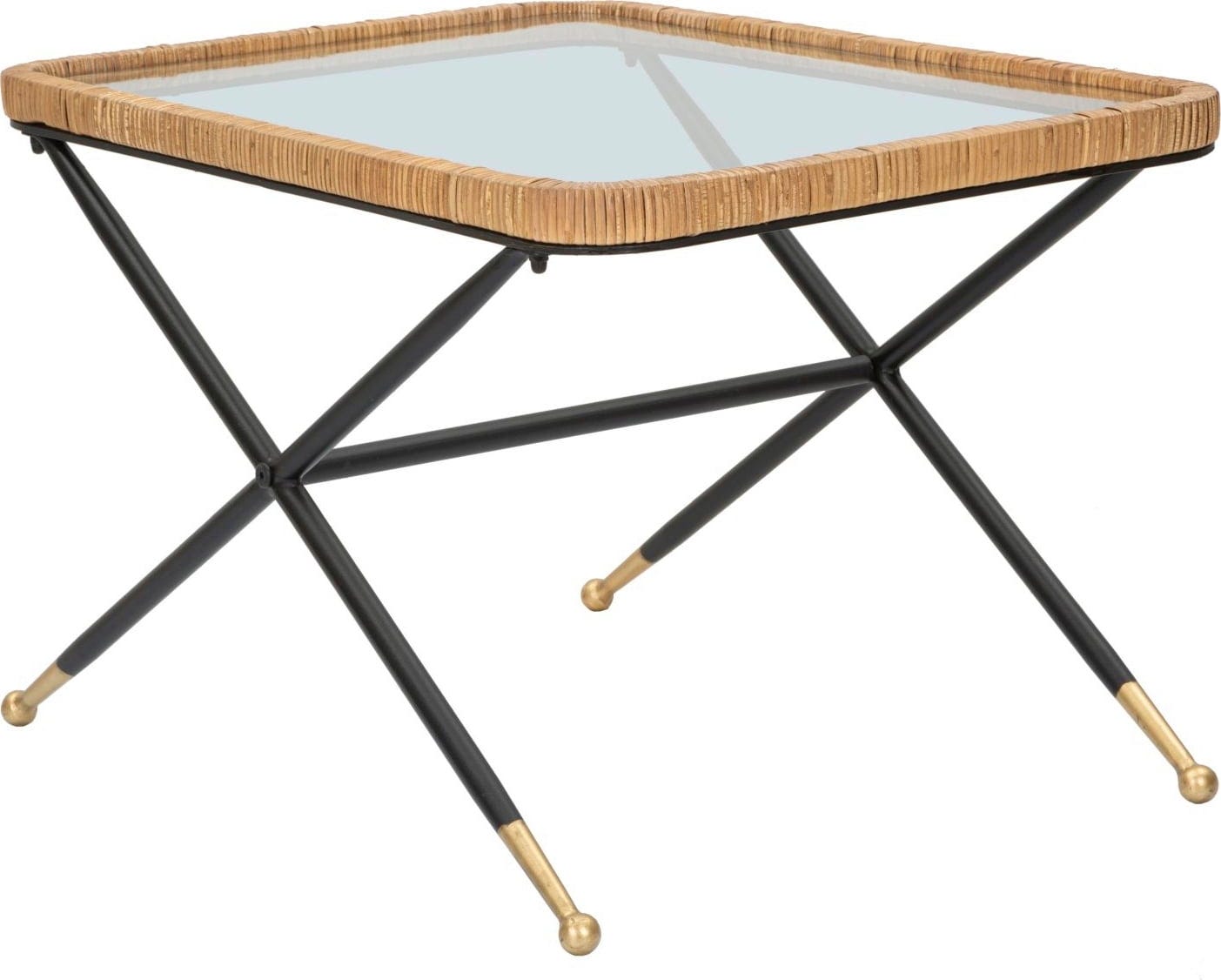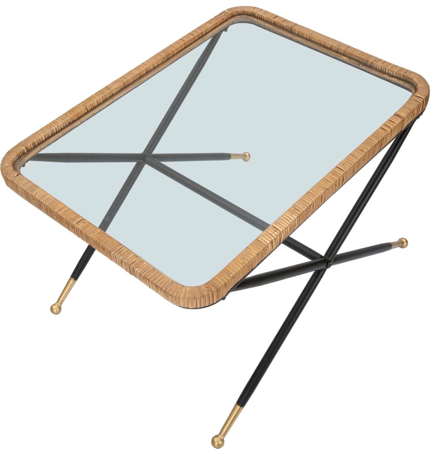 Nadaj swojemu salonowi stylowy akcent dzięki temu prostokątnemu stolikowi kawowemu o prostym, ale atrakcyjnym designie! Łączy on przejrzystość prostokątnego szklanego blatu z ciepłą, naturalną teksturą rattanowej plecionki, która stylowo go otacza. Solidny, czarny metalowy stelaż z nogami w kształcie litery X zapewnia wysoką stabilność i nowoczesny kontrast.
