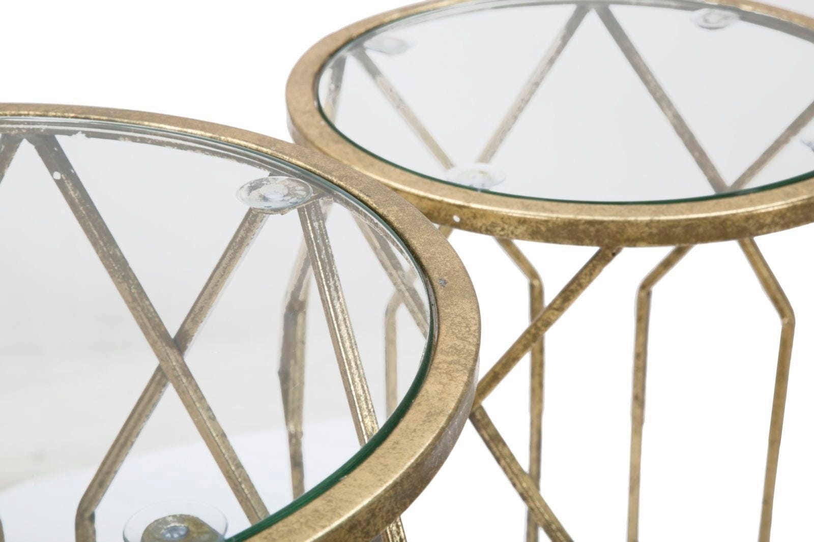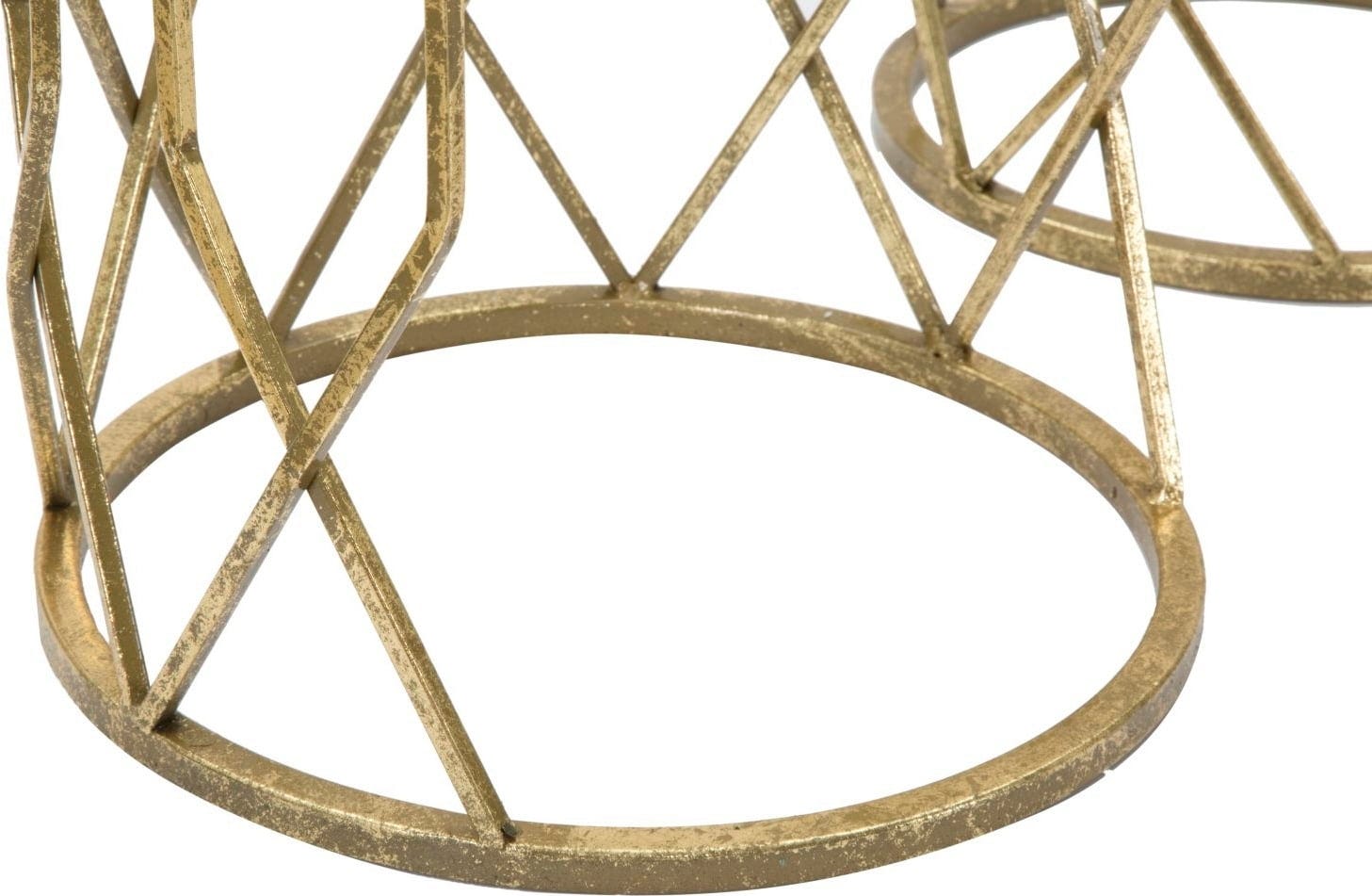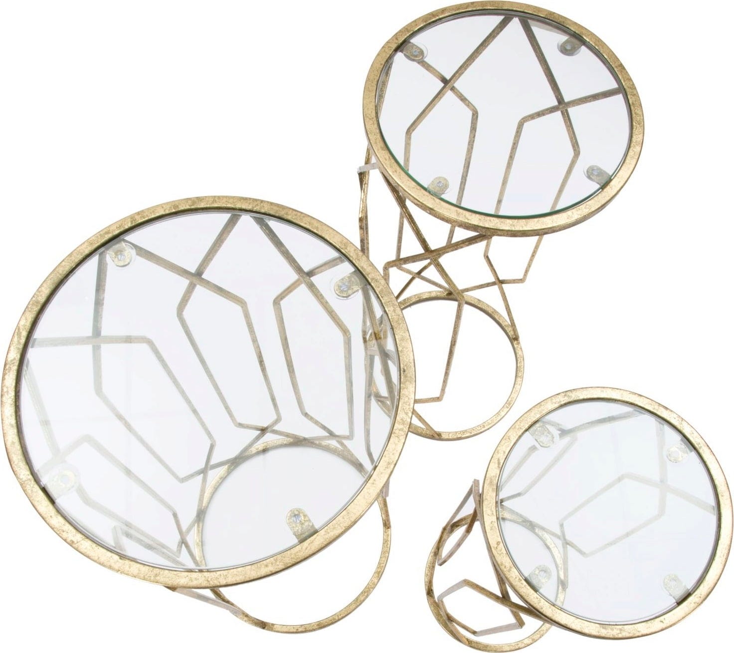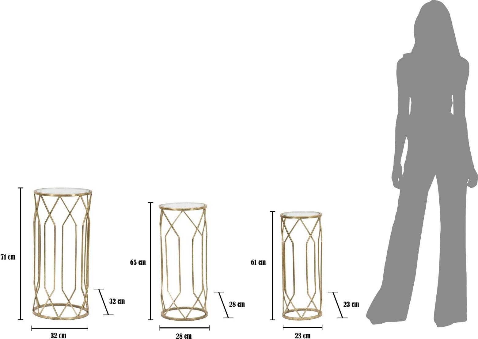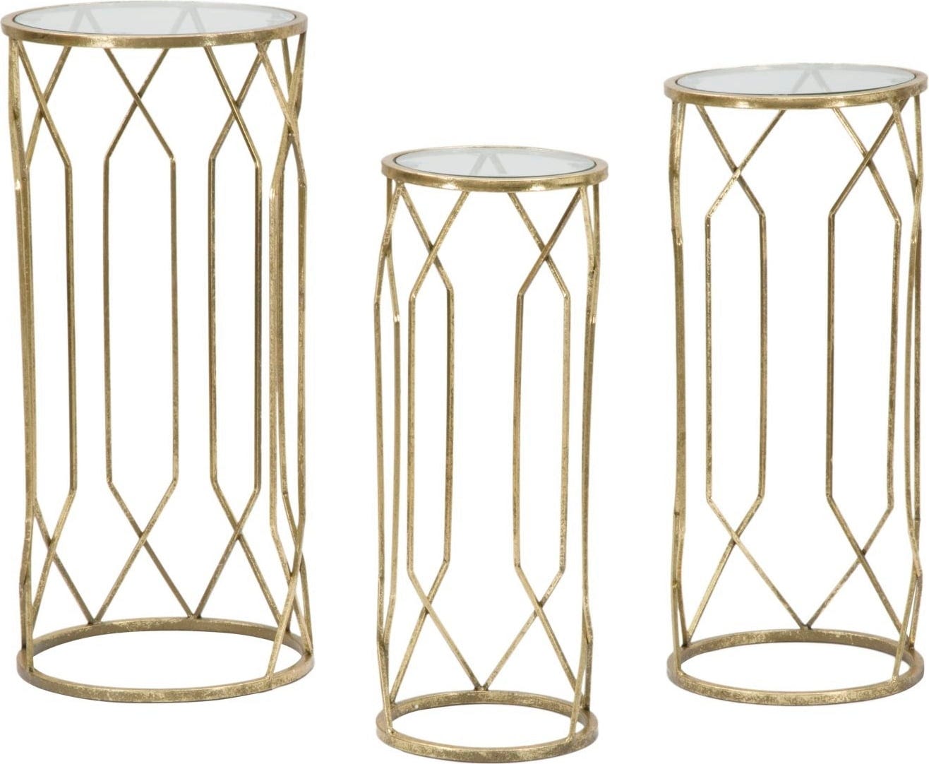 Odkryj niezwykły efekt połączenia złota i szkła dzięki tym luksusowym i pełnym blasku stolikom pomocniczym w praktycznym zestawie 3 sztuk! Zestaw idealnie nadaje się do stylowego wyeksponowania ulubionych przedmiotów. Smukły stelaż z metalu w kolorze złotym zachwyca wydłużonymi, geometrycznymi liniami, które nadają konstrukcji lekkości i wysokości.