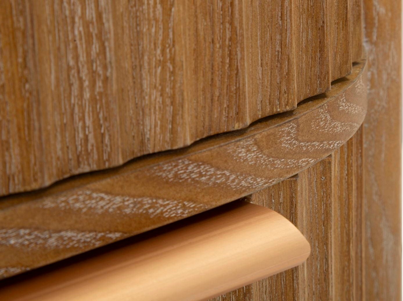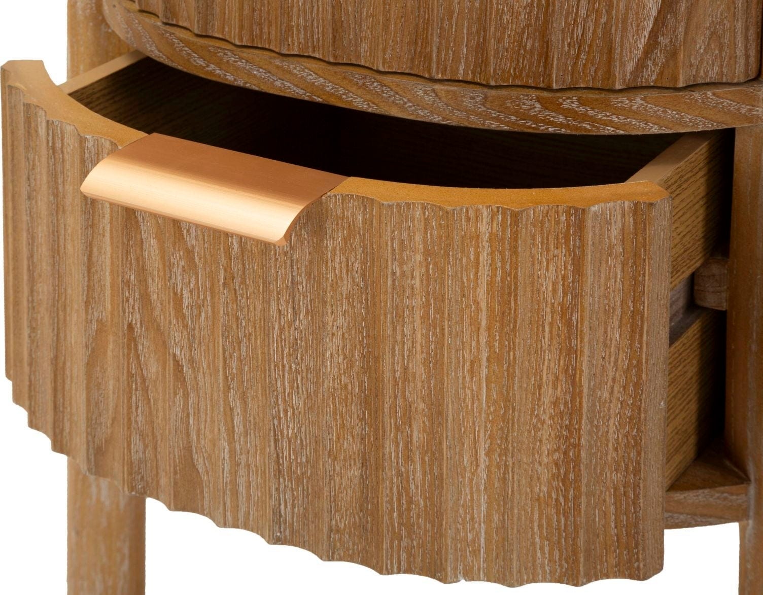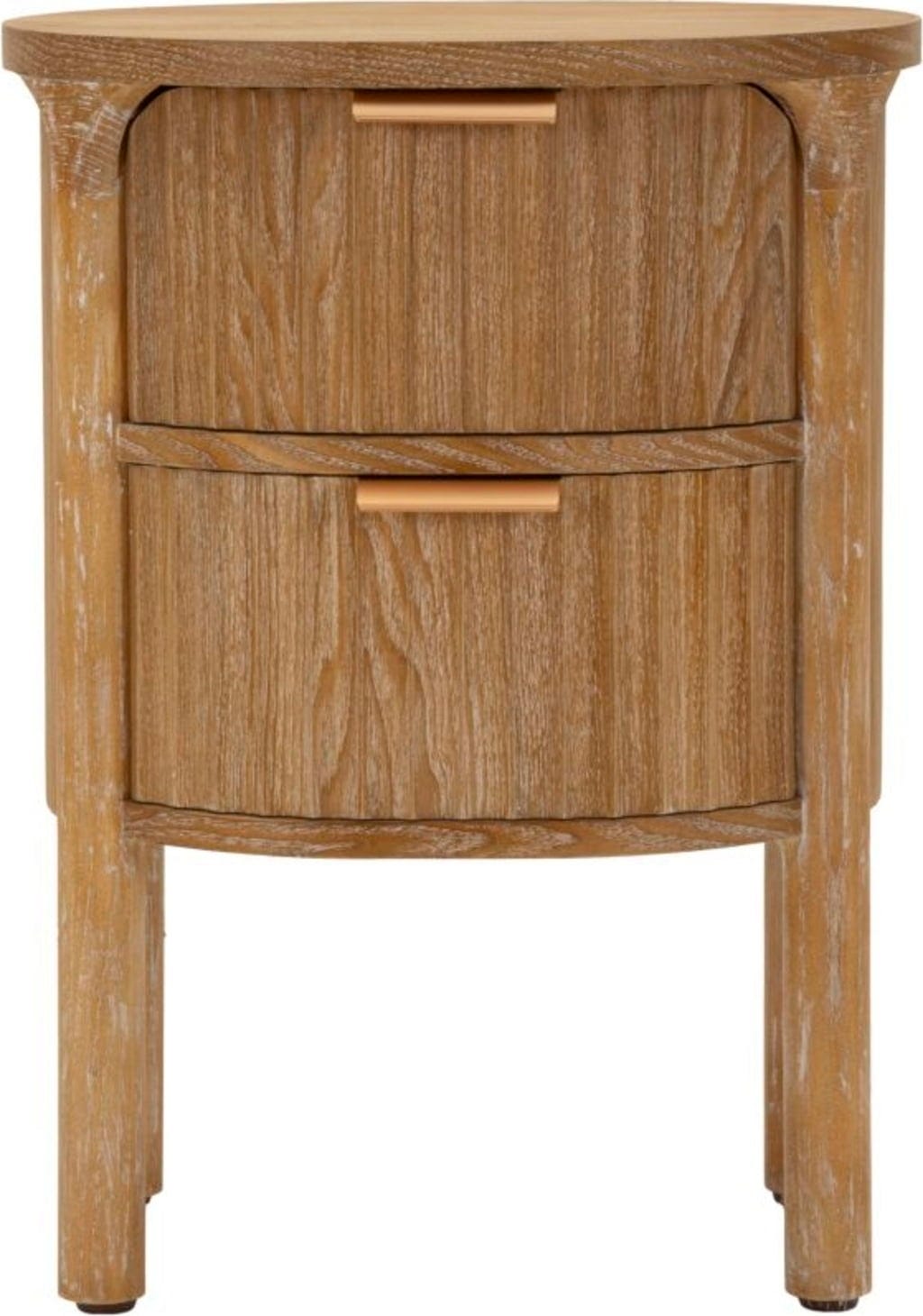 Uzupełnij swoją sypialnię o mebel, który idealnie łączy prostą elegancję z nowoczesną funkcjonalnością. Szafka nocna Göteborg zachwyca kompaktową, owalną konstrukcją oraz łagodnymi, zaokrąglonymi liniami o wyglądzie ciepłego, naturalnego drewna. Fronty mają subtelną strukturę, co nadaje szafce wyrafinowaną teksturę.