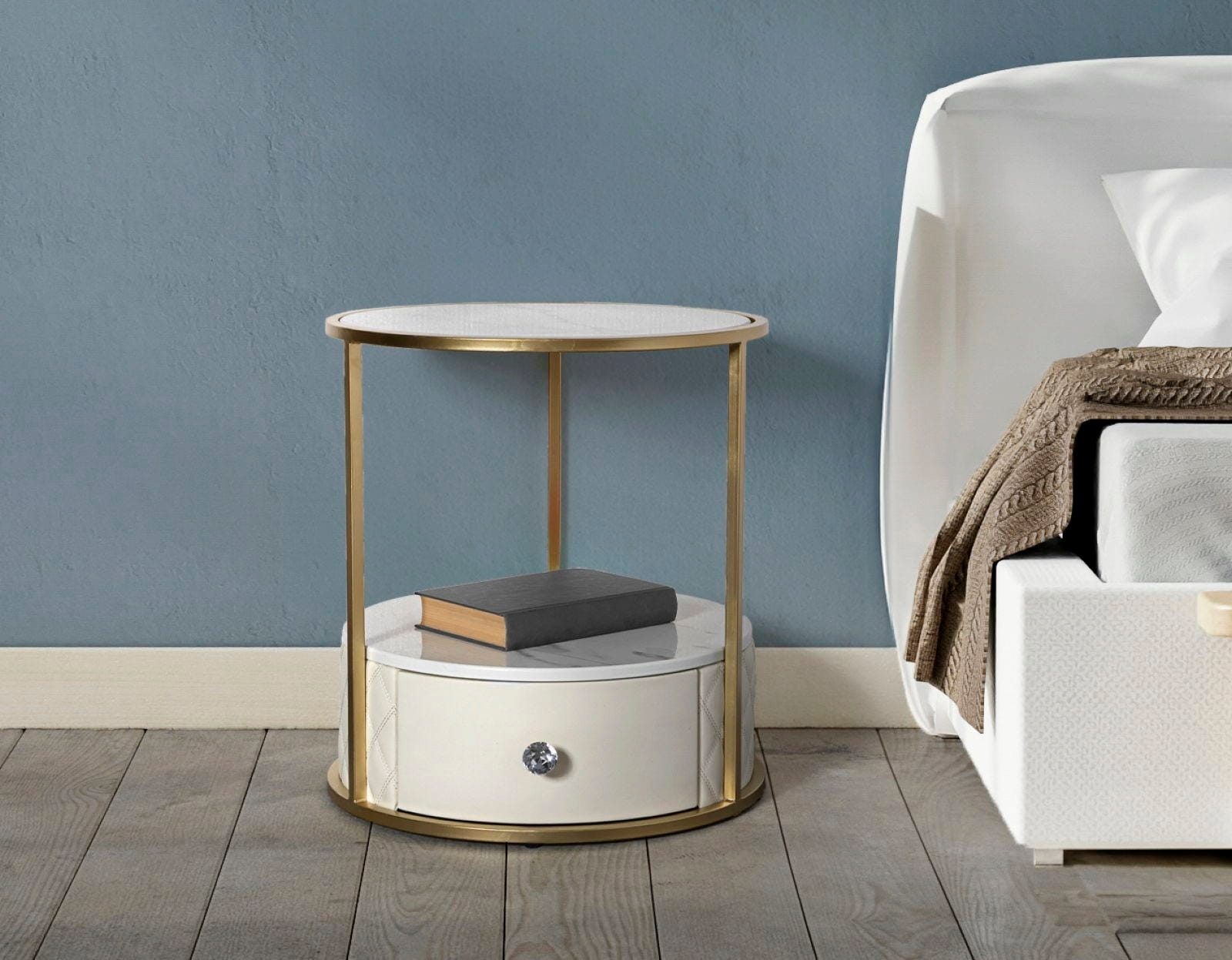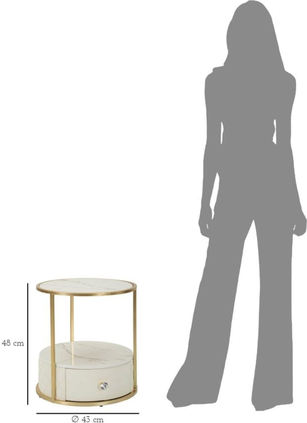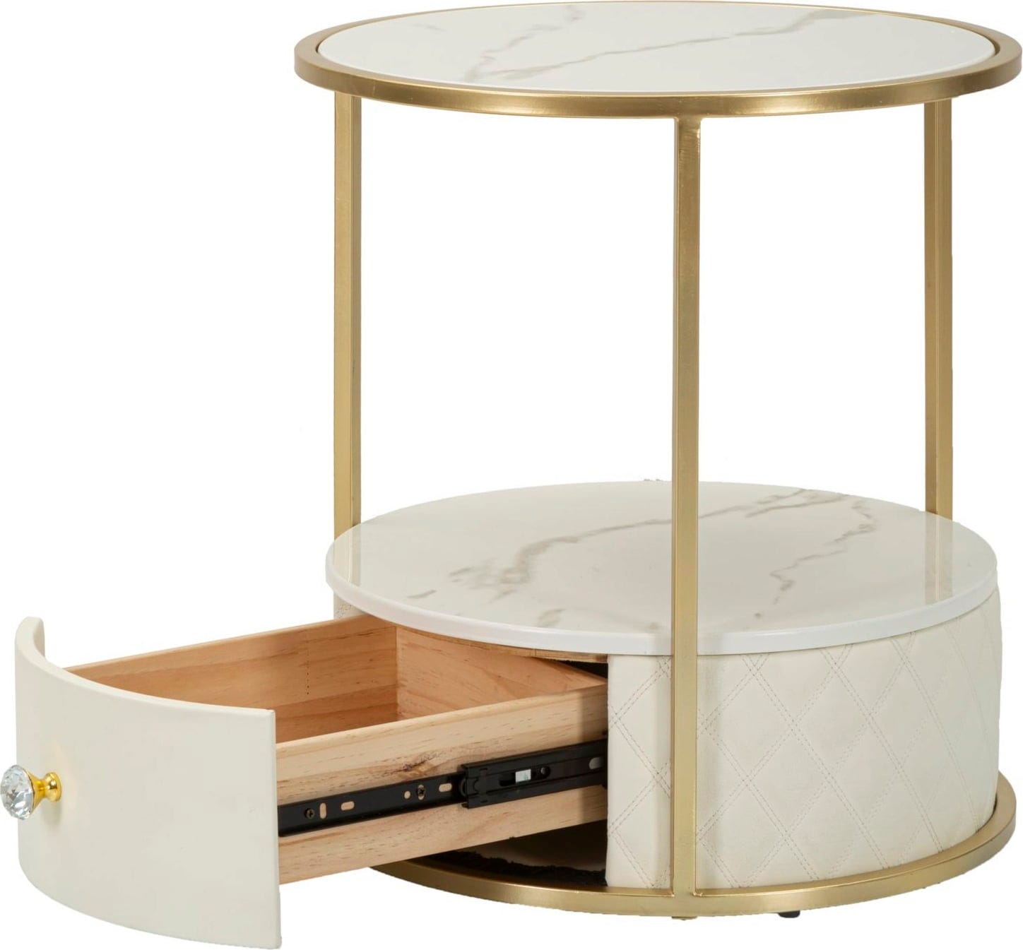 Dodaj luksusowy i elegancki akcent do swojej sypialni dzięki tej okrągłej szafce nocnej! Zachwyca ona połączeniem filigranowego, złotego metalowego stelaża z górnym blatem oraz półką o szlachetnym wyglądzie marmuru. Dolna szuflada oferuje dyskretne miejsce do przechowywania, a jej boki zostały obite luksusową, pikowaną ekoskórą, co nadaje stolikowi wyczuwalną, wyrafinowaną teksturę.