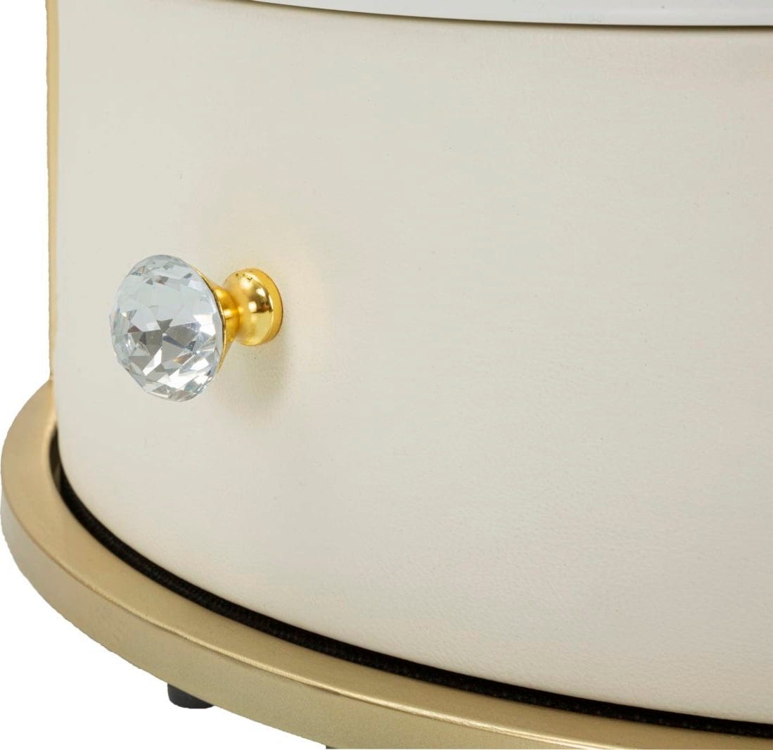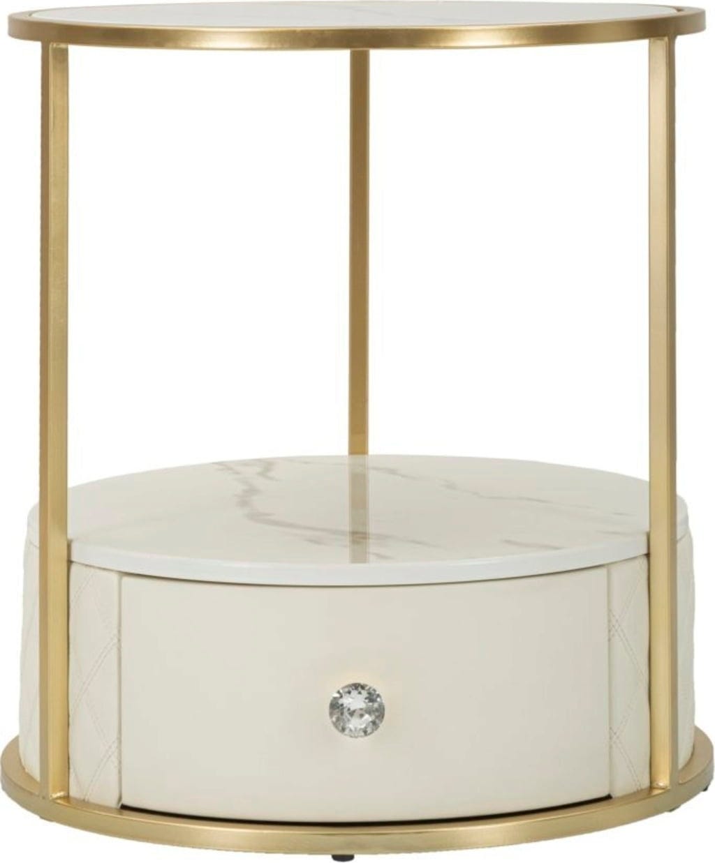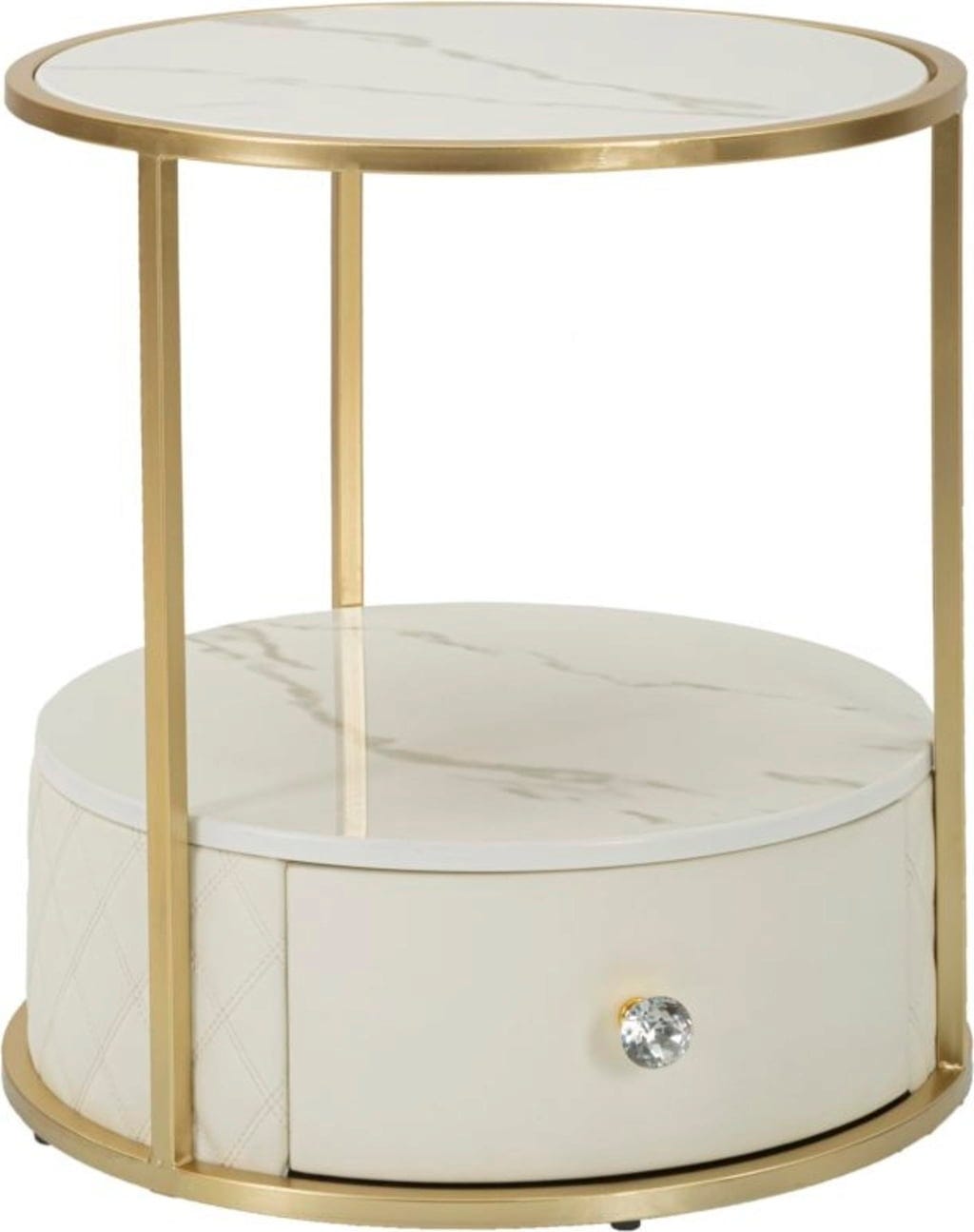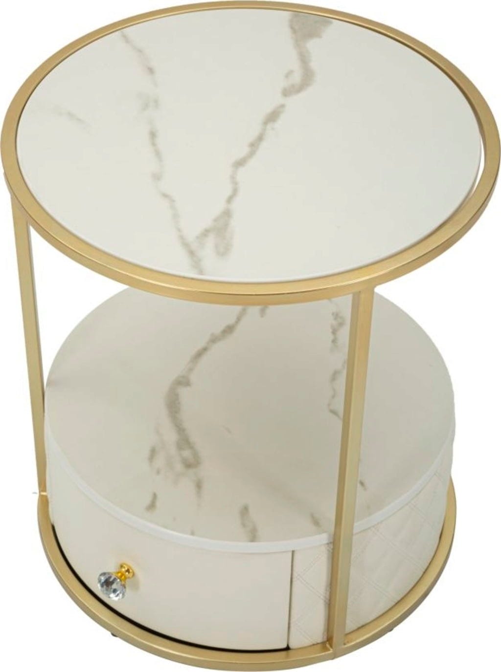 Dodaj luksusowy i elegancki akcent do swojej sypialni dzięki tej okrągłej szafce nocnej! Zachwyca ona połączeniem filigranowego, złotego metalowego stelaża z górnym blatem oraz półką o szlachetnym wyglądzie marmuru. Dolna szuflada oferuje dyskretne miejsce do przechowywania, a jej boki zostały obite luksusową, pikowaną ekoskórą, co nadaje stolikowi wyczuwalną, wyrafinowaną teksturę.