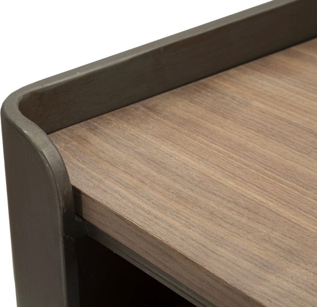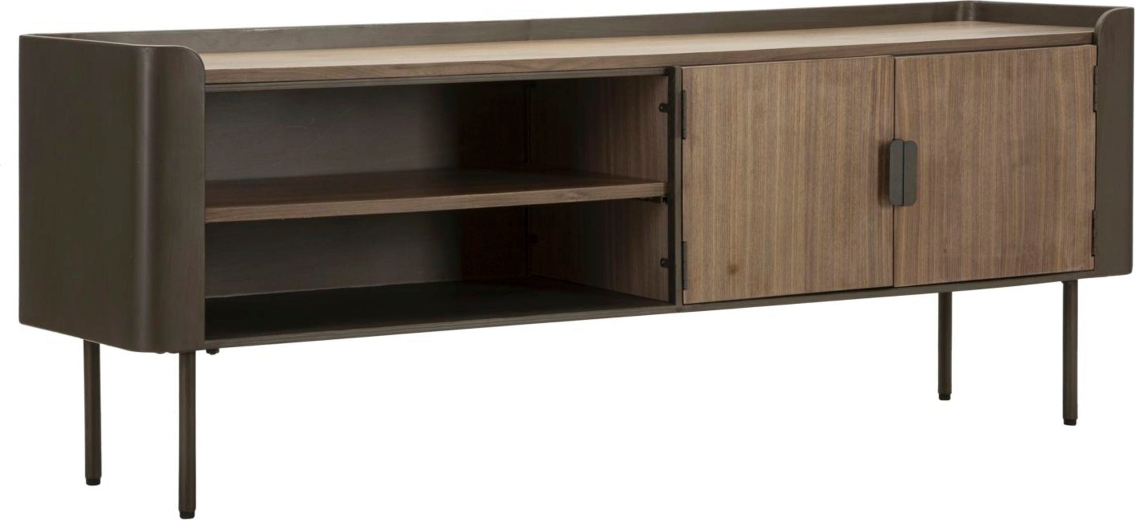 Wyeksponuj stylowo swój system domowej rozrywki dzięki tej nowoczesnej szafce RTV! Jej wyjątkowy design urzeka połączeniem solidnej, ciemnej metalowej konstrukcji i ciepłego wyglądu drewna, co nadaje jej atrakcyjną, inspirowaną stylem industrialnym elegancję. Proste, wyraźne linie sprawiają, że jest ona idealnym dopełnieniem każdego nowoczesnego wnętrza.