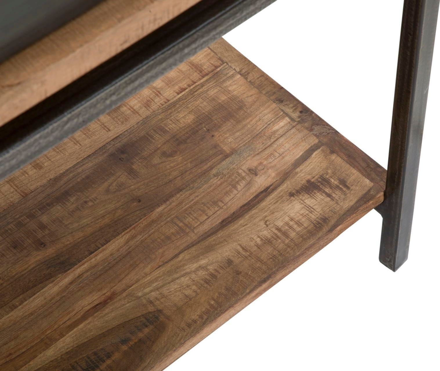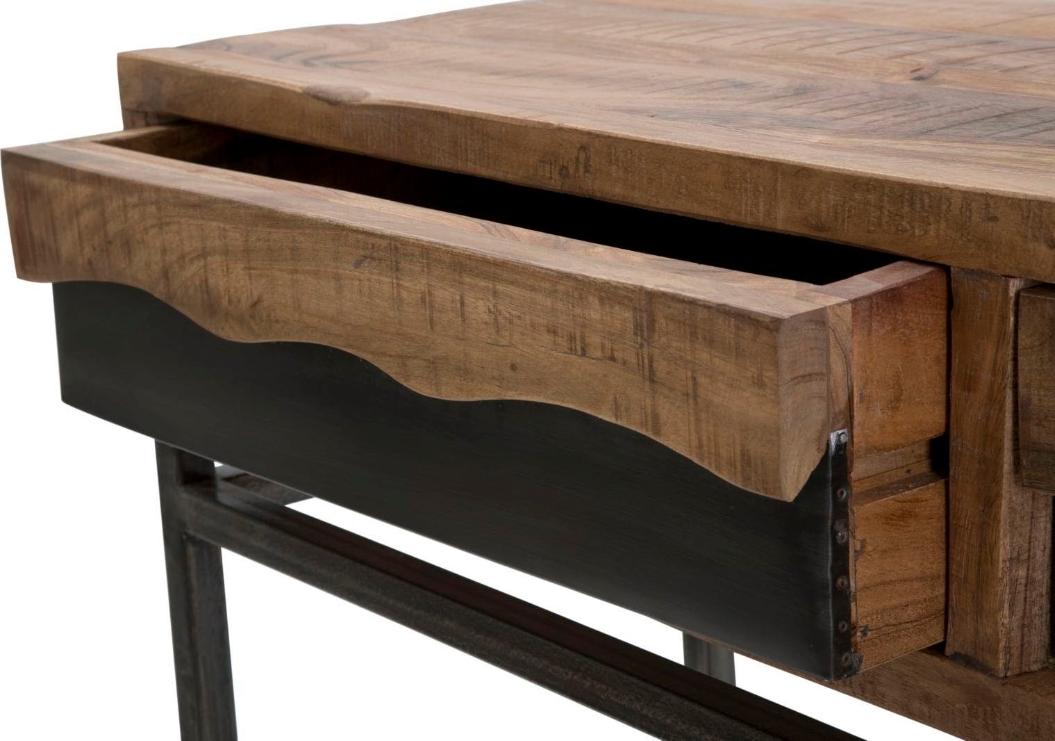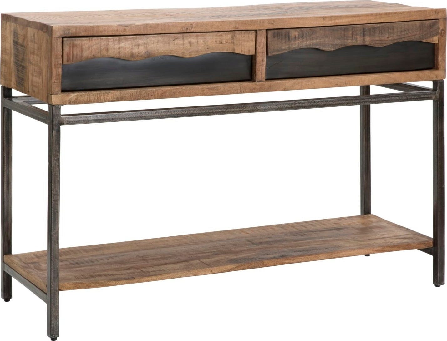 Dzięki dwóm szufladom i dolnej półce konsola oferuje wszechstronne miejsce do przechowywania. Prosty, czarny metalowy stelaż tworzy stylowy kontrast z ciepłym drewnem i zapewnia niezbędną stabilność. Ten element wyposażenia to idealny wybór dla miłośników wysokiej jakości materiałów i wyrazistego designu!