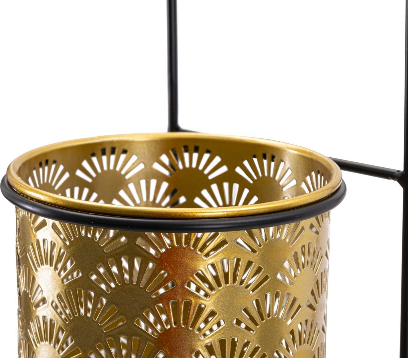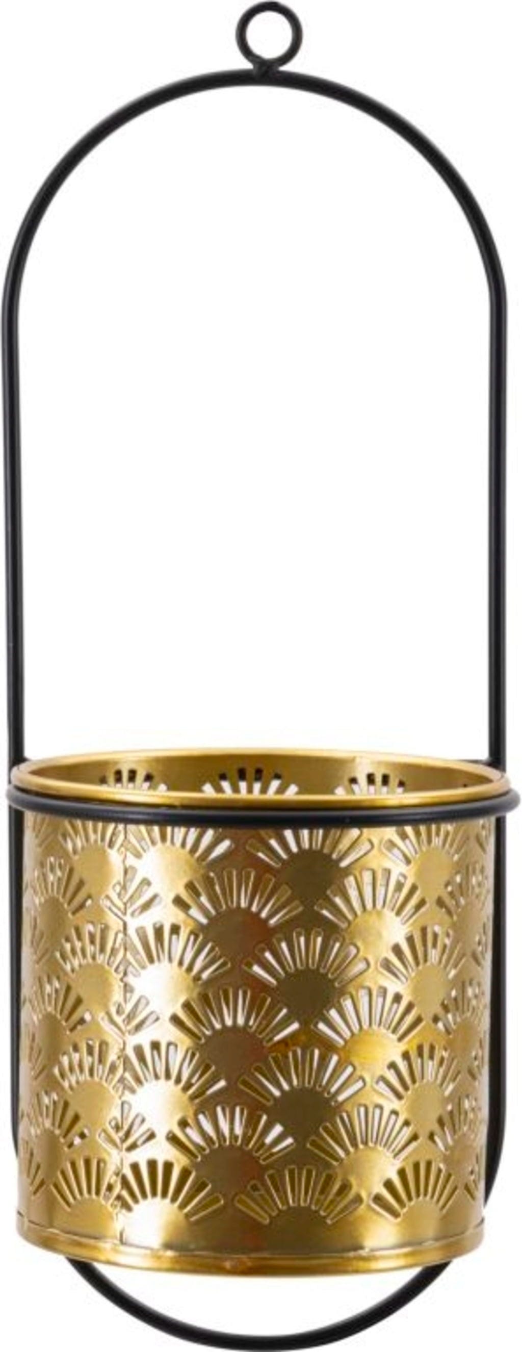Nadaj swoim ścianom wyrafinowany i nowoczesny akcent dzięki temu precyzyjnie wykonanemu ściennemu uchwytowi na wazon. Donica w lśniącym, złotym wykończeniu zachwyca pięknym, geometrycznym wzorem wachlarza, który powstaje dzięki subtelnym wycięciom i zapewnia ciekawe efekty świetlne. Uchwyt na wazon zawieszony jest na prostej, czarnej metalowej konstrukcji, która tworzy elegancki kontrast i umożliwia łatwy montaż.