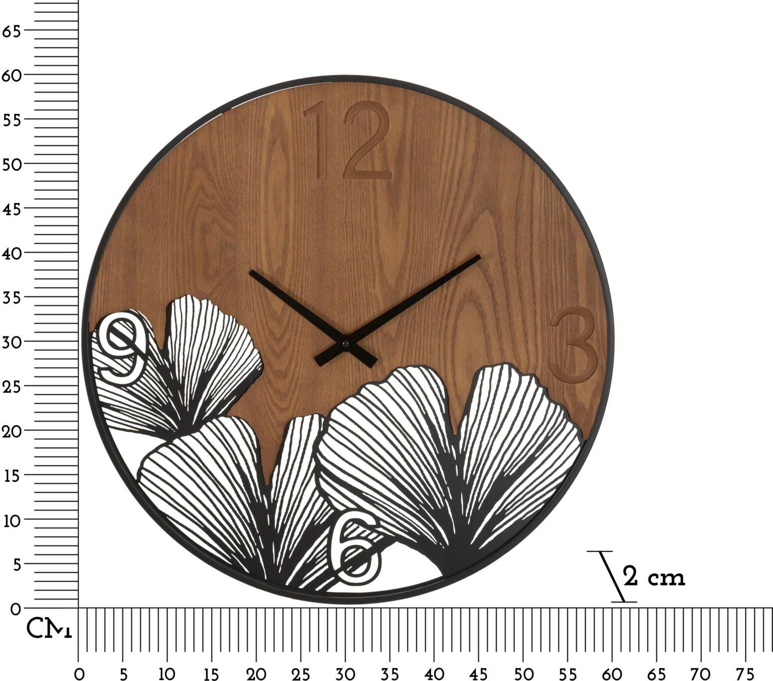 Wprowadź ponadczasową elegancję i ciepło do swojego domu dzięki zegarowi ściennemu Drewno/Liść marki Mauro Ferretti. Okrągła tarcza zachwyca ciepłym wyglądem usłojenia drewna, a szczególną uwagę przyciągają rzeźbienia w kształcie liści, które jako kontrastowe, czarno-białe elementy miłorzębu wystają poza dolną krawędź zegara.