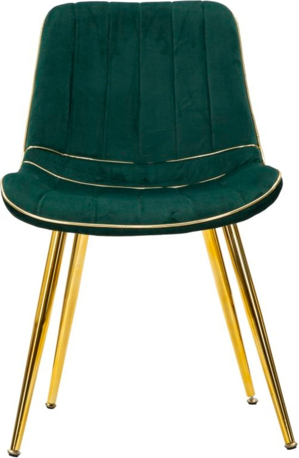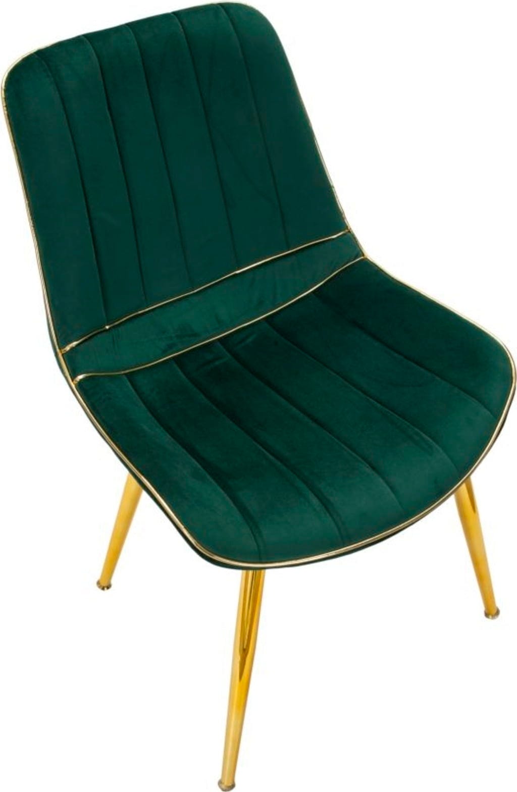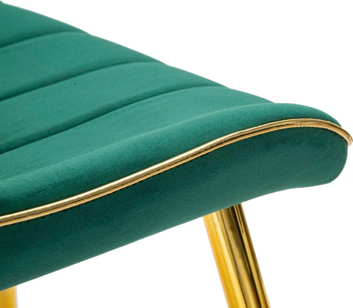 Szczególną uwagę przyciągają złote akcenty wokół siedziska, które idealnie współgrają ze smukłymi, metalowymi nogami w kolorze złotym. Czy to na uroczyste kolacje, czy na relaksujące wieczory – połączenie głębokiej zieleni i lśniącego złota zapewnia atmosferę pełną szyku i odprężenia.