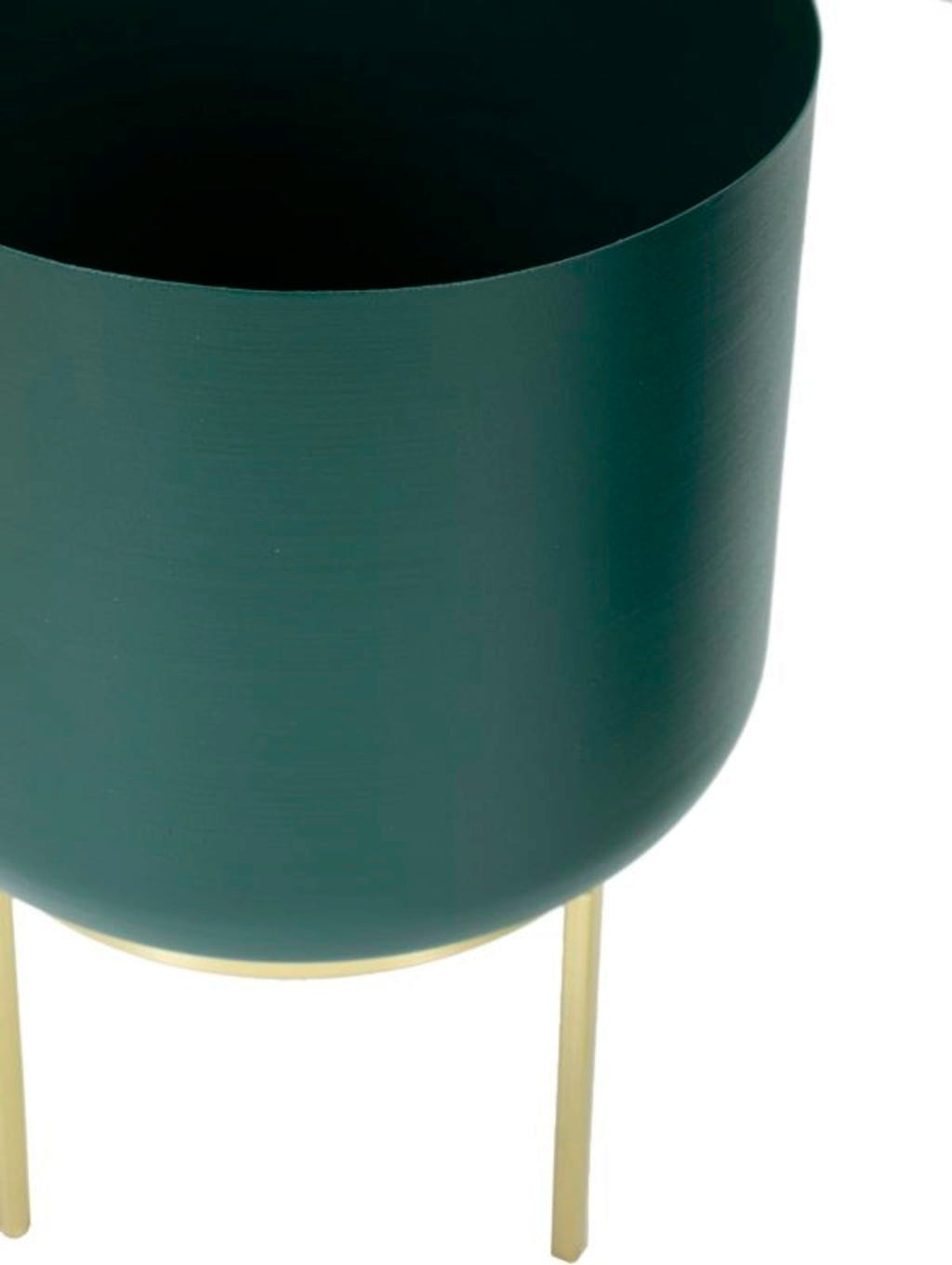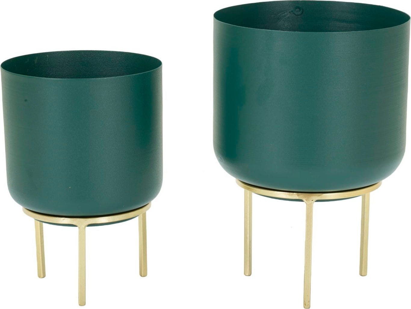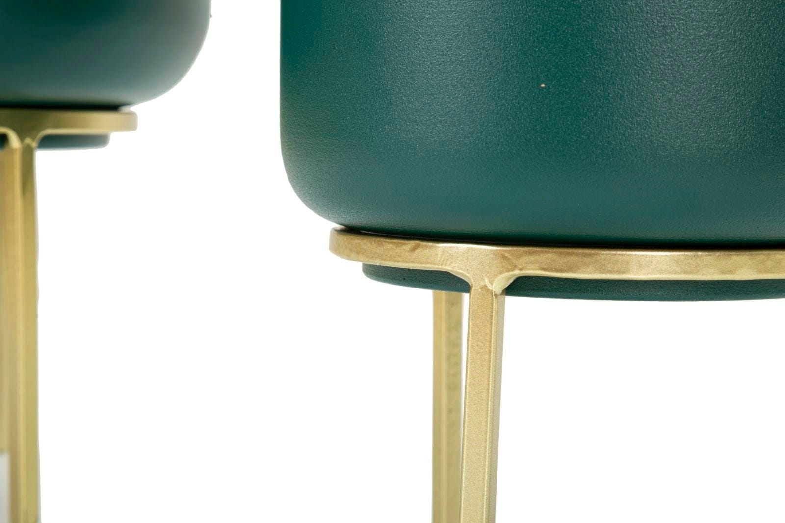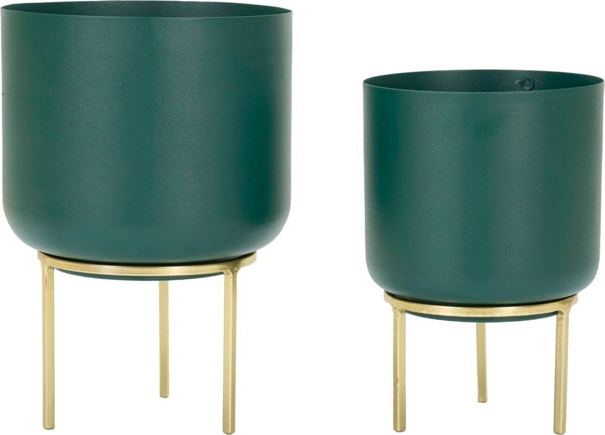 Wyeksponuj swoje ulubione rośliny w stylowy i wyrafynowany sposób dzięki temu eleganckiemu zestawowi 2 osłonek! Ten nowoczesny duet zachwyca głębokim, nasyconym odcieniem zieleni, który tworzy piękny kontrast z filigranowymi, złotymi metalowymi stojakami. Taka kolorystyka natychmiast nada Twoim pomieszczeniom luksusowy, a zarazem naturalny charakter.