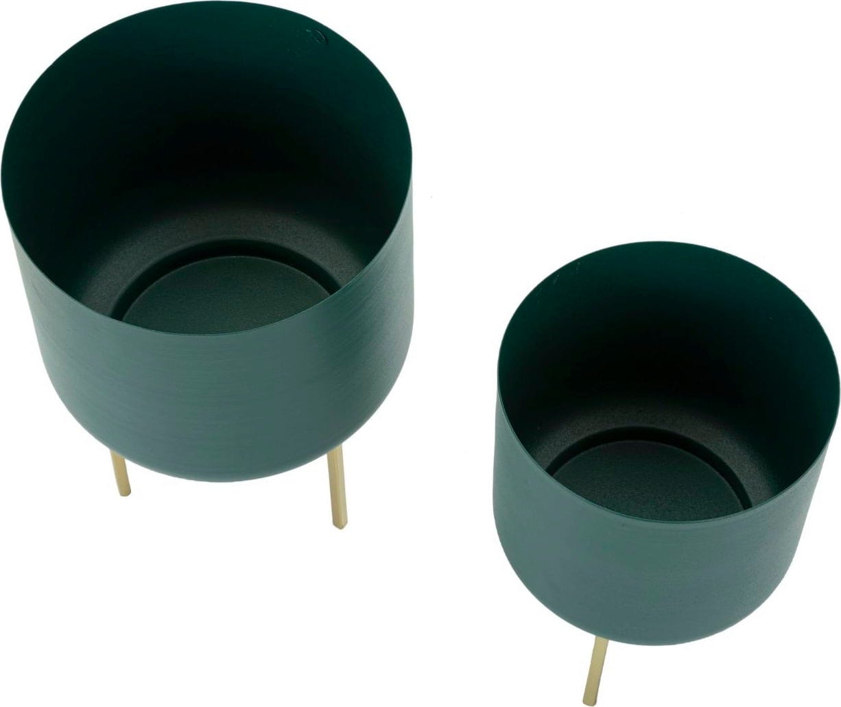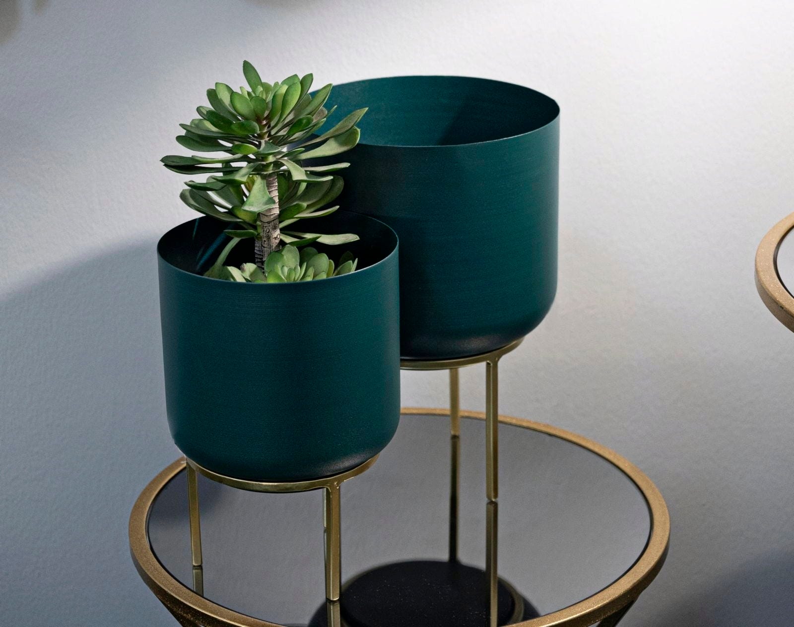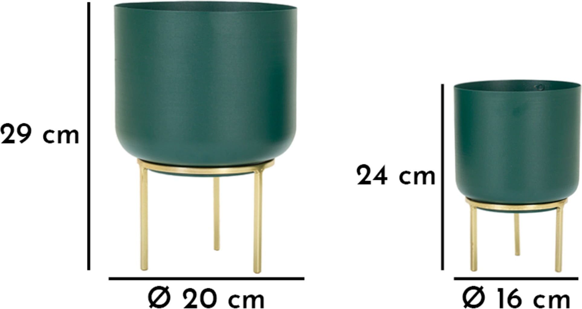 Wyeksponuj swoje ulubione rośliny w stylowy i wyrafynowany sposób dzięki temu eleganckiemu zestawowi 2 osłonek! Ten nowoczesny duet zachwyca głębokim, nasyconym odcieniem zieleni, który tworzy piękny kontrast z filigranowymi, złotymi metalowymi stojakami. Taka kolorystyka natychmiast nada Twoim pomieszczeniom luksusowy, a zarazem naturalny charakter.