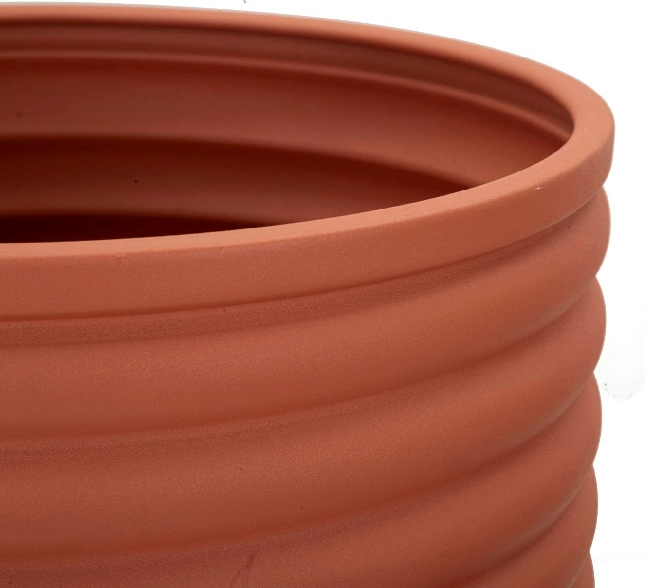 Nadaj swojemu wnętrzu nowoczesny i ciepły charakter dzięki temu zestawowi 3 metalowych wazonów. Komplet w pięknym odcieniu terakoty to prawdziwy hit, który natychmiast ożywi i rozjaśni Twoją przestrzeń mieszkalną. Każdy wazon zachwyca poziomym, prążkowanym wzorem reliefowym, który nadaje metalowi wyczuwalną strukturę i nowoczesny design.