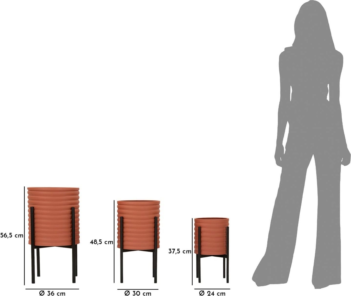 Doniczki umieszczone są na smukłych, czarnych metalowych stojakach, które stylowo eksponują wazony. Niezależnie od tego, czy zostaną ustawione osobno, czy razem – ten zestaw jest idealny, aby nowocześnie wyeksponować rośliny i nadać każdemu wnętrzu współczesny, ziemisty akcent!